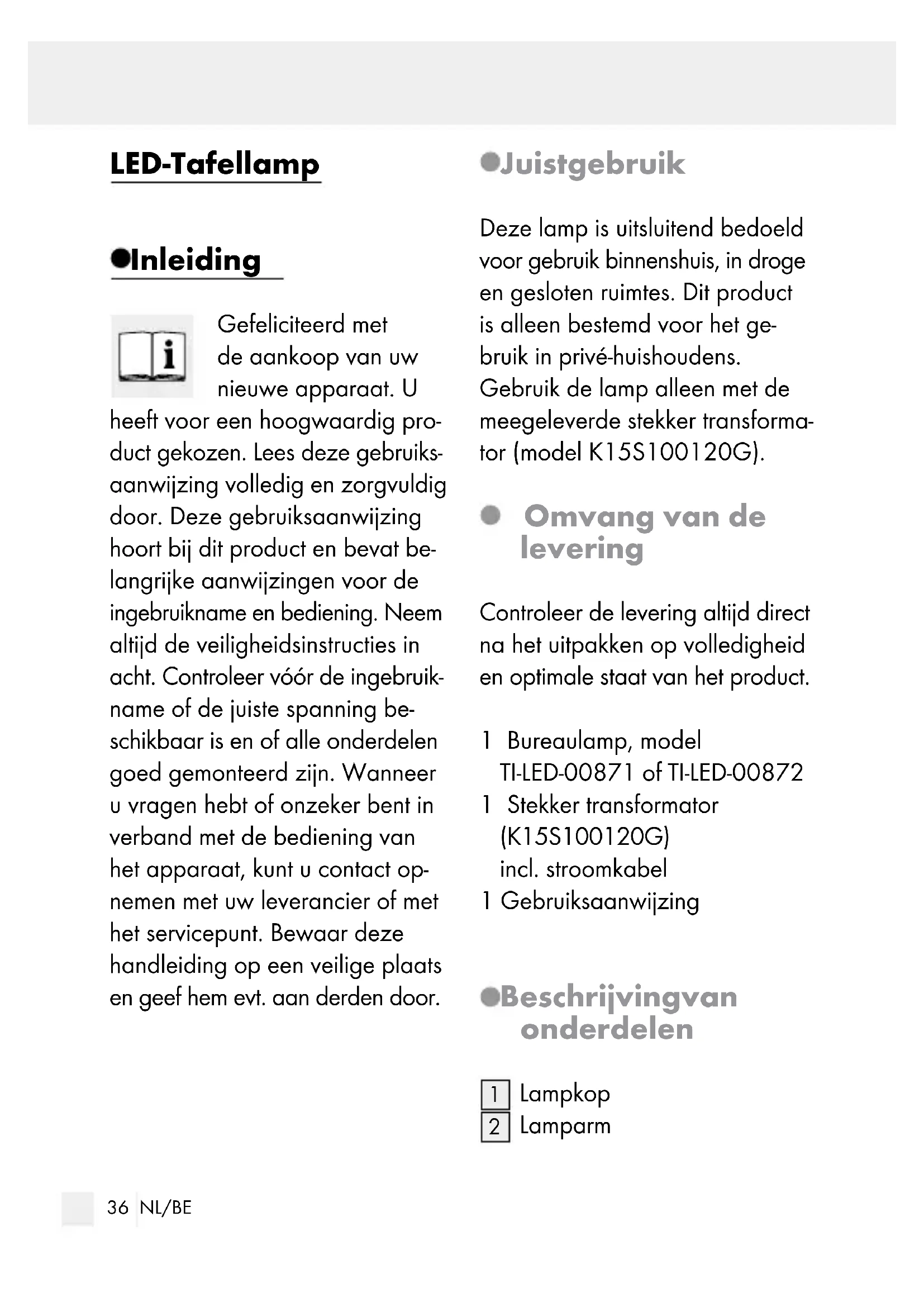 KINDEREN! Laat kinderen nooit zonder toezicht bij het verpakkingsmateriaal. Er be- staat gevaar voor verstikking door verpakkingsmateriaal. Kinderen onderschatten vaak de gevaren. Houd kinderen altijd uit de buurt van het product. Dit product is geen speelgoed. Dit apparaat kan door kinderen vanaf 8 alsook personen met verminderde fysieke, sensori- sche of mentale vaardigheden of een gebrek aan ervaring en kennis worden gebruikt, als zij onder toezicht staan of geïnstrueerd werden met betrekking tot het veilige ge- bruik van het apparaat en zij de hieruit voortvloeiende gevaren begrijpen. Kinderen mogen niet met het apparaat spelen. Reiniging en onderhoud mag niet door kinderen zonder toezicht worden uitgevoerd. Vermijd levensge- vaar door elektri- sche schok Controleer de lamp voor ieder gebruik op eventuele beschadigingen. Gebruik uw lamp nooit, wanneer u een beschadiging hebt geconsta- teerd. VOORZICHTIG! Een be- schadigde lamp betekent levensgevaar door een elek- trische schok. Neem in geval van beschadigingen, repara- ties of andere problemen aan de lamp contact op met de klantenservice of met een elektricien. Ter vermijding van gevaren mag de beschadigde, buiten- ste flexibele kabel van deze lamp uitsluitend door de fa- brikant, zijn serviceverlener39 NL/BE of een vergelijkbare vakman worden vervangen! Wees er voor gebruik zeker van dat de beschikbare netspanning met de benodigde gebruiksspanning van de lamp overeenkomt (220–240 V∼, 50 / 60 Hz). Vermijd dat de lamp in con- tact komt met water of andere vloeistoffen. Trek voor mon- tage, demontage, reiniging of wanneer u de lamp gedu- rende een langere periode niet gebruikt, de stekker uit het stopcontact. Open nooit een van de elek- trische delen en steek er geen voorwerpen in. Bij dergelijke ingrepen bestaat levensgevaar door elektrische schokken. Het verlichtingsmiddel kan niet worden vervangen. Deze lamp is niet geschikt voor dimmers en elektronische schakelaars. Gebruik de lamp alleen met de meegeleverde stekker transformator (model K15S100120G). Vermijd brand- en verwondings- gevaar Niet direct in de lichtbron (lamp, LED etc.) kijken. Zorg ervoor dat de lamp uit- geschakeld en afgekoeld is voordat u deze aanraakt om brandwonden te vermijden. Lampen ontwikkelen een grote hitte. Dek de lamp c.q. de stekker niet af met voorwerpen. Een overmatige warmteontwikke- ling kan tot brand leiden. Laat de lamp in gebruik niet zonder toezicht. Zo handelt u correct Monteer de lamp zo, zodat hij tegen vocht en vuil be- schermd is. Wees altijd alert! Let er altijd op wat u doet en ga steeds bedachtzaam te werk. Monteer de lamp in geen ge- val, als u niet geconcentreerd bent of als u zich niet lekker voelt.40 NL/BE Ingebruikname Verwijder alle beschermende folies van de LED bureaulamp. Lamp plaatsen Plaats de LED bureaulamp met de achterzijde voor zich op een vlakke ondergrond. Steek de aansluitstekker van de netspanningsadapter