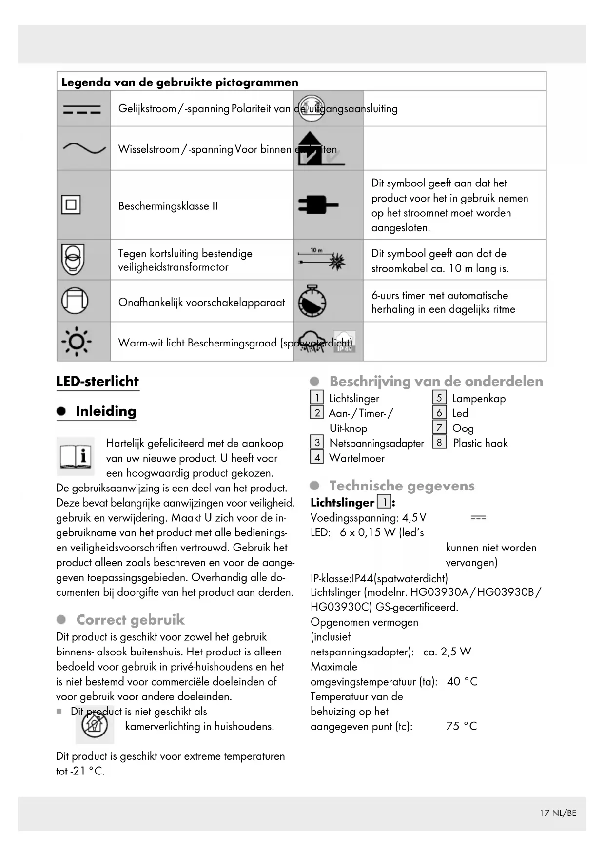 Voedingsspanning: 4,5 V LED: 6 x 0,15 W (led‘s kunnen niet worden vervangen) IP-klasse: IP44 (spatwaterdicht) Lichtslinger (modelnr. HG03930A / HG03930B / HG03930C) GS-gecertificeerd. Opgenomen vermogen (inclusief netspanningsadapter): ca. 2,5 W Maximale omgevingstemperatuur (ta): 40 °C Temperatuur van de behuizing op het aangegeven punt (tc): 75 °C18 NL/BE Netspanningsadapter