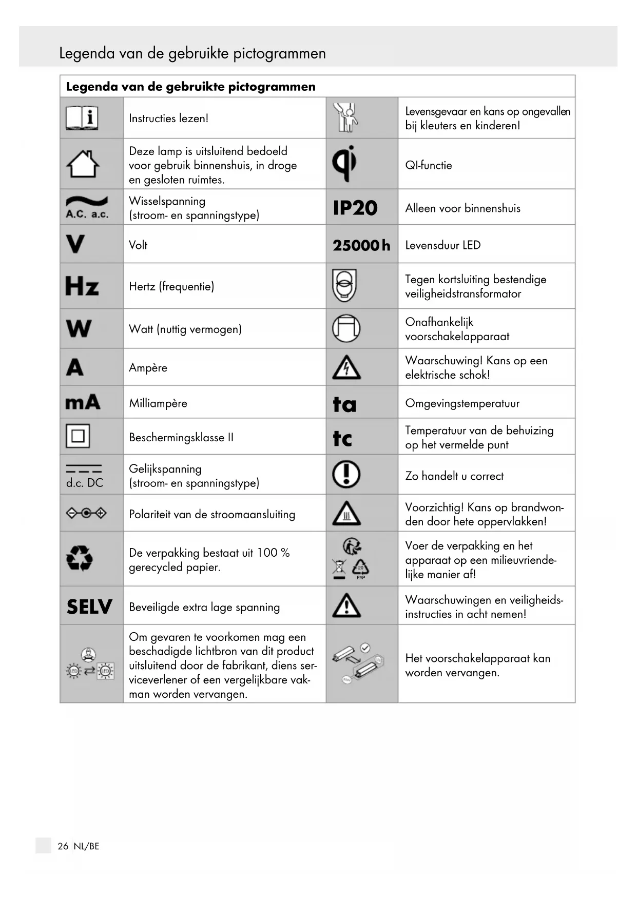 bij kleuters en kinderen! Deze lamp is uitsluitend bedoeld voor gebruik binnenshuis, in droge en gesloten ruimtes. QI-functie Wisselspanning (stroom- en spanningstype) IP20 Alleen voor binnenshuis Volt 25000 h Levensduur LED Hertz (frequentie) Tegen kortsluiting bestendige veiligheidstransformator Watt (nuttig vermogen) Onafhankelijk voorschakelapparaat Ampère Waarschuwing! Kans op een elektrische schok! Milliampère