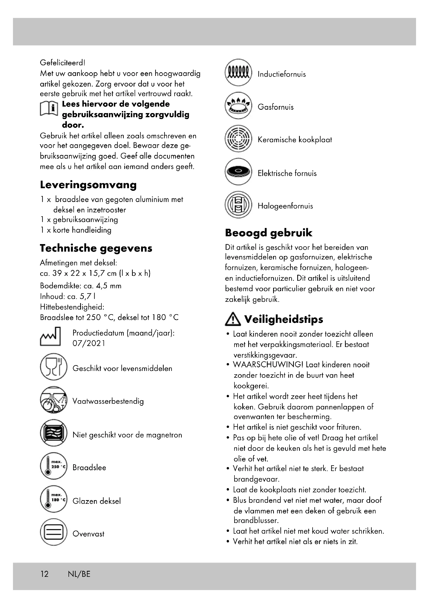 - BELANGRIJK! Reinig nooit met agressieve reinigingsmiddelen. Afvalverwerking Voer het artikel en verpakkingsmaterialen in overeenstemming met actuele lokale voor- schriften af. Verpakkingsmaterialen, zoals bv. foliezakjes, horen niet thuis in kinderhanden. Berg het verpakkingsmateriaal buiten het bereik van kinderen op. Voer de producten en verpakkingen op milieuvriendelijke wijze af. De recyclingcode dient om verschillende materialen te kenmerken ten behoeve van hergebruik via het recyclingproces. De code bestaat uit het recyclingsymbool, dat het recyclingproces weerspiegelt, en een getal dat het materiaal identificeert. Opmerkingen over garantie en serviceafhandeling Het artikel werd met de grootste zorgvuldigheid en onder permanent toezicht geproduceerd. De firma DELTA-SPORT HANDELSKONTOR GmbH verleent particuliere eindklanten op dit artikel drie jaar garantie, te rekenen vanaf de datum van aankoop (garantietermijn) en dit op grond van de volgende bepalingen. De garantie geldt alleen voor materiaal- en verwerkingsfouten.14 De garantie is niet van toepassing op onderde- len die aan een normale slijtage onderhevig zijn en daarom als niet-slijtvaste onderdelen te beschouwen zijn (bv. batterijen) en evenmin op breekbare onderdelen, bv. schakelaars, accu’s of onderdelen die van glas gemaakt zijn. Uit de garantie voortvloeiende claims zijn uitge- sloten als het artikel onvakkundig, verkeerd of niet in het kader van de voorziene bepaling of in het kader van het voorziene gebruiksdoeleinde gebruikt werd of indien richtlijnen in de gebruiks- aanwijzing niet in acht genomen werden, tenzij de eindklant aantoont dat er sprake is van een materiaal- of verwerkingsfout die niet op één van de hoger vermelde omstandigheden gebaseerd is. Uit de garantie voortvloeiende claims kunnen alleen tijdens de garantieperiode op vertoon van de originele kassabon ingediend wor- den. Gelieve daarom de originele kassabon te bewaren. De garantieperiode wordt door eventuele reparaties op grond van de garantie, wettelijke waarborg of coulance niet verlengd. Dit geldt ook voor vervangen en gerepareerde onderdelen. Gelieve u bij klachten in eerste instantie tot de hieronder vermelde servicehotline te richten of met ons per e-mail contact op te nemen. Is er sprake van een garantiegeval, dan wordt het ar- tikel door ons – naar onze keuze – voor u gratis gerepareerd, wordt het vervangen of wordt de aankoopsom terugbetaald. Verdere rechten op grond van de garantie bestaan niet. Uw wettelijke rechten, in het bijzonder rechten op garantie tegenover de betreffende verkoper, worden door deze garantie niet beperkt. IAN: 367895_2101 Service België Tel.: 070 270 171 (0,15 EUR/Min.) E-Mail: deltasport@lidl.be Service Nederland Tel.: 0900 0400223 (0,10 EUR/Min.) E-Mail: deltasport@lidl.nl NL/BE15 Gratulujemy! Decydując się na ten produkt, otrzymują Pań- stwo towar wysokiej jakości. Należy zapoznać się z produktem przed jego pierwszym użyciem. Należy uważnie przeczytać następującą instrukcję użytkowa- nia. Produkt ten należy użytkować wyłącznie w opisany sposób oraz zgodnie ze wskazanym przeznaczeniem. Niniejszą instrukcję użytko- wania należy przechowywać w bezpiecznym miejscu. Przekazując produkt innej osobie, należy upewnić się, że otrzyma ona także całą dokumentację dotyczącą produktu. Zakres dostawy 1 x brytfanna z odlewu aluminiowego z pokrywą i wkładem kratkowym 1 x instrukcja użytkowania 1 x skrócona instrukcja Dane techniczne Wymiary z pokrywą: ok. 39 x 22 x 15,7 cm (dł. x szer. x wys.) Grubość dna: ok. 4,5 mm Pojemność: ok. 5,7 l Odporność na wysoką temperaturę: Brytfanna do 250°C, pokrywa do 180°C Data produkcji (miesiąc/rok): 07/2021 Produkt bezpieczny do przechowywania żywności Przystosowany do mycia w zmywarce Nieprzystosowany do podgrzewania w kuchence mikrofalowej Brytfanna Szklana pokrywa Nadaje się do zastosowania w piekarniku Płyta indukcyjna Kuchenka gazowa Płyta grzewcza z ceramiki szklanej Kuchenka elektryczna Kuchenka halogenowa Użytkowanie zgodne z przeznaczeniem Ten produkt nadaje się do przyrządzania potraw na kuchence gazowej, elektrycznej, płycie z ceramiki szklanej, a także na kuchence halogenowej i płycie indukcyjnej. Produkt jest przeznaczony wyłącznie do prywatnego użytku, a nie do użytku komercyjnego. Wskazówki bezpieczeństwa