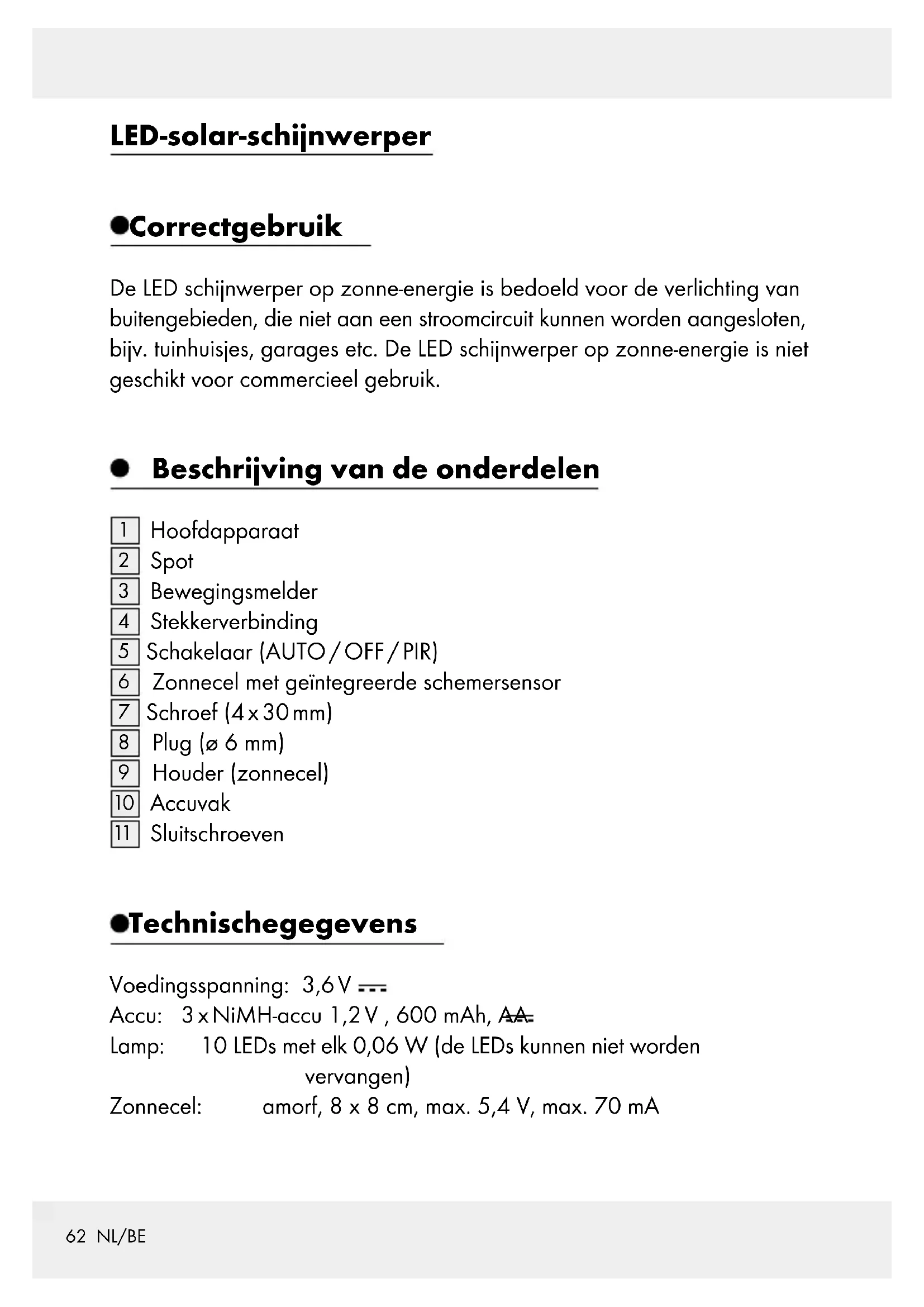 Sluitschroeven Technische gegevens Voedingsspanning: 3,6 V Accu: 3 x NiMH-accu 1,2 V , 600 mAh, AA Lamp: 10 LEDs met elk 0,06 W (de LEDs kunnen niet worden vervangen) Zonnecel: amorf, 8 x 8 cm, max. 5,4 V, max. 70 mA63 NL/BE Bewegingsmelder: reikwijdte: ca. 5–12 m, Registratiehoek: ca. 90° horizontaal, 90° verticaal Beschermingsklasse: IP44 (spatwaterdicht) Omvang van de levering Controleer direct na het uitpakken altijd of de levering compleet is alsook of het apparaat zich in een feilloze toestand bevindt. 1 hoofdapparaat (bestaande uit schijnwerper met 10 LEDs, bewegings- melder, montagebehuizing met ingebouwde accu‘s en ingebouwde bediening) 1 zonnecel (8 x 8 cm) (incl. ca. 2,5 m stroomkabel) 4 schroeven (4 x 30 mm) 4 pluggen (ø 6 mm) 1 montage- en gebruiksaanwijzing Algemene veiligheidsinstructies Maak u voor de eerste ingebruikname van het product vertrouwd met alle bedienings- en veiligheidsinstructies! Overhandig ook alle documenten als u het product aan derden overhandigt! Dit apparaat kan door kinderen vanaf 8 alsook personen met vermin- derde psychische, sensorische of mentale vaardigheden of een gebrek aan ervaring en / of kennis worden gebruikt, als zij onder toezicht staan of geïnstrueerd werden met betrekking tot het veilige gebruik van het apparaat en de hieruit voortvloeiende gevaren begrijpen. Kinderen mogen niet met het apparaat spelen. Reiniging en gebruikersonder- houd mogen niet door kinderen zonder toezicht worden uitgevoerd. Laat kinderen nooit zonder toezicht bij het verpakkingsmateriaal. Er bestaat verstikkingsgevaar door het verpakkingsmateriaal. Kinderen onderschatten vaak de gevaren.64 NL/BE Houd kinderen tijdens de montage uit de buurt van de montageplek. Tot de levering behoren tal van schroeven en andere kleine voorwerpen. Deze kunnen bij het inslikken of inademen levensgevaarlijk zijn. Gebruik het product niet, als u een beschadiging constateert! Veiligheidsinstructies voor de accu‘s LEVENSGEVAAR! Houd accu‘s uit de buurt van kinderen. Raadpleeg in geval van inslikken direct een arts! WEES VOORZICHTIG! EXPLOSIEGEVAAR! Gooi accu‘s nooit in vuur of water! Stel accu‘s nooit bloot aan mechanische belastingen! Gebruik geen niet oplaadbare batterijen. Sluit de accu‘s niet kort en / of open ze niet. Gevaar voor materiële schade Gebruik uitsluitend het vermelde accutype! Let bij het plaatsen op de juiste polariteit! Deze wordt in het batterij- vakje vermeld! Reinig de contacten van de batterijen en het apparaat indien nodig voor het plaatsen! Functie De zonnecel