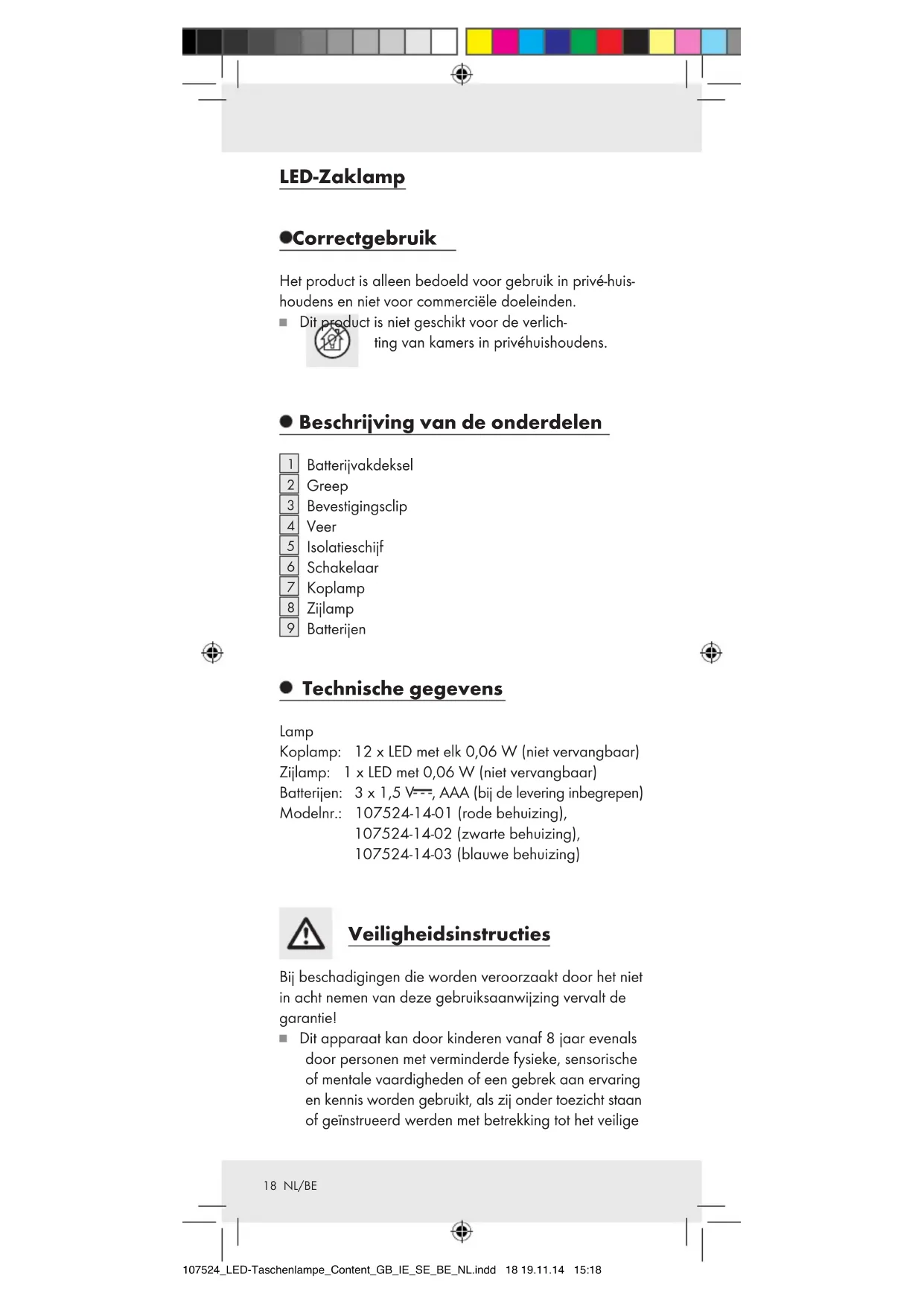 Batterijen Technische gegevens Lamp Koplamp: 12 x LED met elk 0,06 W (niet vervangbaar) Zijlamp: 1 x LED met 0,06 W (niet vervangbaar) Batterijen: 3 x 1,5 V , AAA (bij de levering inbegrepen) Modelnr.: 107524-14-01 (rode behuizing), 107524-14-02 (zwarte behuizing), 107524-14-03 (blauwe behuizing) Veiligheidsinstructies Bij beschadigingen die worden veroorzaakt door het niet in acht nemen van deze gebruiksaanwijzing vervalt de garantie! Dit apparaat kan door kinderen vanaf 8 jaar evenals door personen met verminderde fysieke, sensorische of mentale vaardigheden of een gebrek aan ervaring en kennis worden gebruikt, als zij onder toezicht staan of geïnstrueerd werden met betrekking tot het veilige 107524_LED-Taschenlampe_Content_GB_IE_SE_BE_NL.indd 18 19.11.14 15:1819 NL/BE gebruik van het apparaat en de hieruit voortvloeiende gevaren begrijpen. Kinderen mogen niet met het ap- paraat spelen. Reiniging en onderhoud mag niet door kinderen zonder toezicht worden uitgevoerd. Gebruik het apparaat niet wanneer het beschadigd is. Bescherm het apparaat tegen natheid en vocht. Nooit in water of andere vloeistoffen dompelen! Veiligheidsinstructies voor het gebruik van batterijen LEVENSGEVAAR! Batterijen kunnen worden inge- slikt, hetgeen levensgevaarlijk kan zijn. Wanneer een batterij is ingeslikt, moet onmiddellijk medische hulp worden ingeroepen. Verwijder de batterijen uit het apparaat als het gedu- rende een langere periode niet wordt gebruikt. VOORZICHTIG! EXPLOSIEGEVAAR! Laad bat- terijen in géén geval op! Reinig de contacten van het product en van de batterijen indien nodig voordat u de batterijen plaatst. Verwijder verbruikte batterijen per omgaande uit het apparaat. Er is sprake van verhoogd gevaar op lekkage! Houd batterijen uit de buurt van kinderen, gooi bat- terijen niet in het vuur, sluit ze niet kort en neem ze niet uit elkaar. Bij negeren van de instructies kunnen batterijen over hun eindspanning heen ontladen worden. In dat ge- val bestaat het gevaar dat ze gaan lekken. Bij negeren van de instructies kunnen batterijen over hun eindspanning heen ontladen worden! Vermijd het contact met huid, ogen en slijmvliezen. In geval van contact met batterijzuur moet de desbetref- fende plek met voldoende water worden afgespoeld en / of moet een arts geraadpleegd worden! Vervang altijd alle batterijen tegelijkertijd en vervang ze alléén door batterijen van hetzelfde type. Voor de ingebruikname Draai het batterijvakdeksel