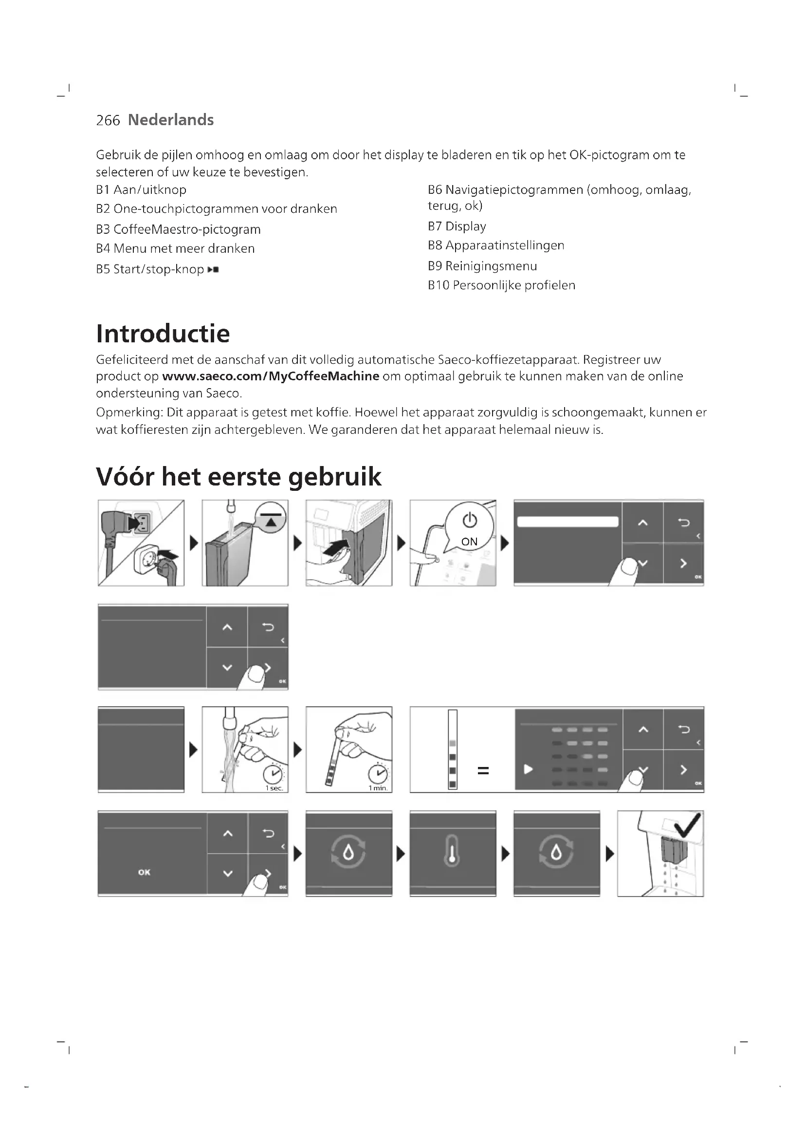 Nederlands Inhoud Apparaatoverzicht (afb. A) _________________________________________________________________ 265 Bedieningspaneel _________________________________________________________________________ 265 Introductie ______________________________________________________________________________ 266 Vóór het eerste gebruik____________________________________________________________________ 266 Speciale functies __________________________________________________________________________ 267 Dranken bereiden_________________________________________________________________________ 267 Dranken aan uw voorkeur aanpassen________________________________________________________ 269 Apparaatinstellingen aanpassen ____________________________________________________________ 270 AquaClean-waterfilter ____________________________________________________________________ 271 De zetgroep plaatsen en verwijderen ________________________________________________________ 273 Schoonmaken en onderhoud_______________________________________________________________ 273 Ontkalkingsprocedure _____________________________________________________________________ 276 Foutcodes________________________________________________________________________________ 277 Accessoires bestellen ______________________________________________________________________ 278 Problemen oplossen_______________________________________________________________________ 278 Technische gegevens ______________________________________________________________________ 283 Apparaatoverzicht (afb. A) A1 Bedieningspaneel A2 Deksel van compartiment voor voorgemalen koffie A3 Deksel van bonenreservoir A4 Aansluiting voor netsnoer A5 Lekbak A6 Ontgrendeling voor lekbak A7 Instelbare koffie- en melkuitloop A8 HygieSteam-reservoir A9 HygieSteam-deksel met melkslanghouder A10 Ingebouwde cappuccinatore A11 Netsnoer met stekker A12 Maalgraadknop A13 Bonenreservoir A14 Zetgroep A15 Servicedeur A16 Waterreservoir A17 Koffiedikbak A18 Voorpaneel van koffiedikbak A19 Lekplaat A20 Indicator 'lekbak vol' Accessoires A21 Melkreservoir A22 Melkbuis en -slang A23 Schoonmaakborsteltje A24 Tube smeermiddel A25 AquaClean-filter A26 Maatlepel A27 Teststrip voor waterhardheid Bedieningspaneel Er zijn twee versies van dit espressoapparaat. De bedieningspanelen zien er anders uit, maar alle knoppen en pictogrammen functioneren op dezelfde manier. Raadpleeg figuur B voor een overzicht van alle knoppen en pictogrammen. Hieronder vindt u de beschrijving.266 Nederlands Gebruik de pijlen omhoog en omlaag om door het display te bladeren en tik op het OK-pictogram om te selecteren of uw keuze te bevestigen. B1 Aan/uitknop B2 One-touchpictogrammen voor dranken B3 CoffeeMaestro-pictogram B4 Menu met meer dranken B5 Start/stop-knop B6 Navigatiepictogrammen (omhoog, omlaag, terug, ok) B7 Display B8 Apparaatinstellingen B9 Reinigingsmenu B10 Persoonlijke profielen Introductie Gefeliciteerd met de aanschaf van dit volledig automatische Saeco-koffiezetapparaat. Registreer uw product op www.saeco.com/MyCoffeeMachine om optimaal gebruik te kunnen maken van de online ondersteuning van Saeco. Opmerking: Dit apparaat is getest met koffie. Hoewel het apparaat zorgvuldig is schoongemaakt, kunnen er wat koffieresten zijn achtergebleven. We garanderen dat het apparaat helemaal nieuw is. Vóór het eerste gebruik