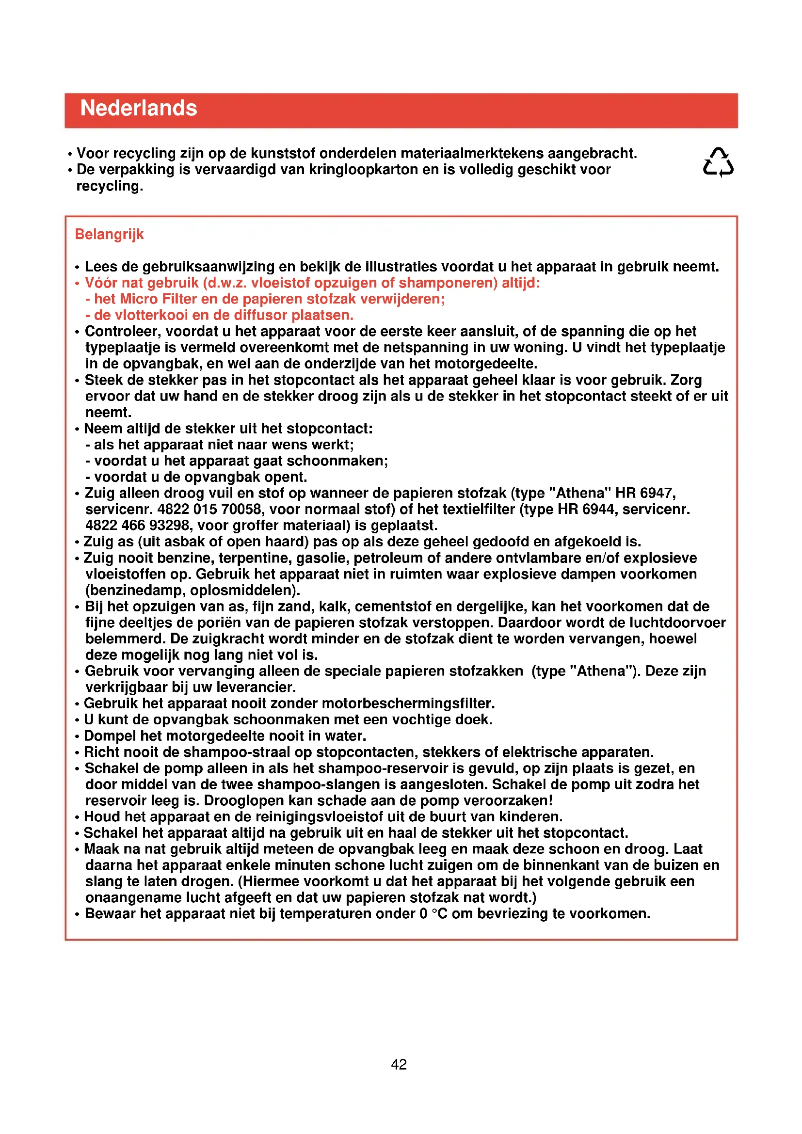 - Zuig alleen droog vuil en stof op wanneer de papieren stofzak (type "Athena" HR 6947, servicenr. 4822 015 70058, voor normaal stof) of het textielfilter (type HR 6944, servicenr. 4822 466 93298, voor groffer materiaal) is geplaatst.