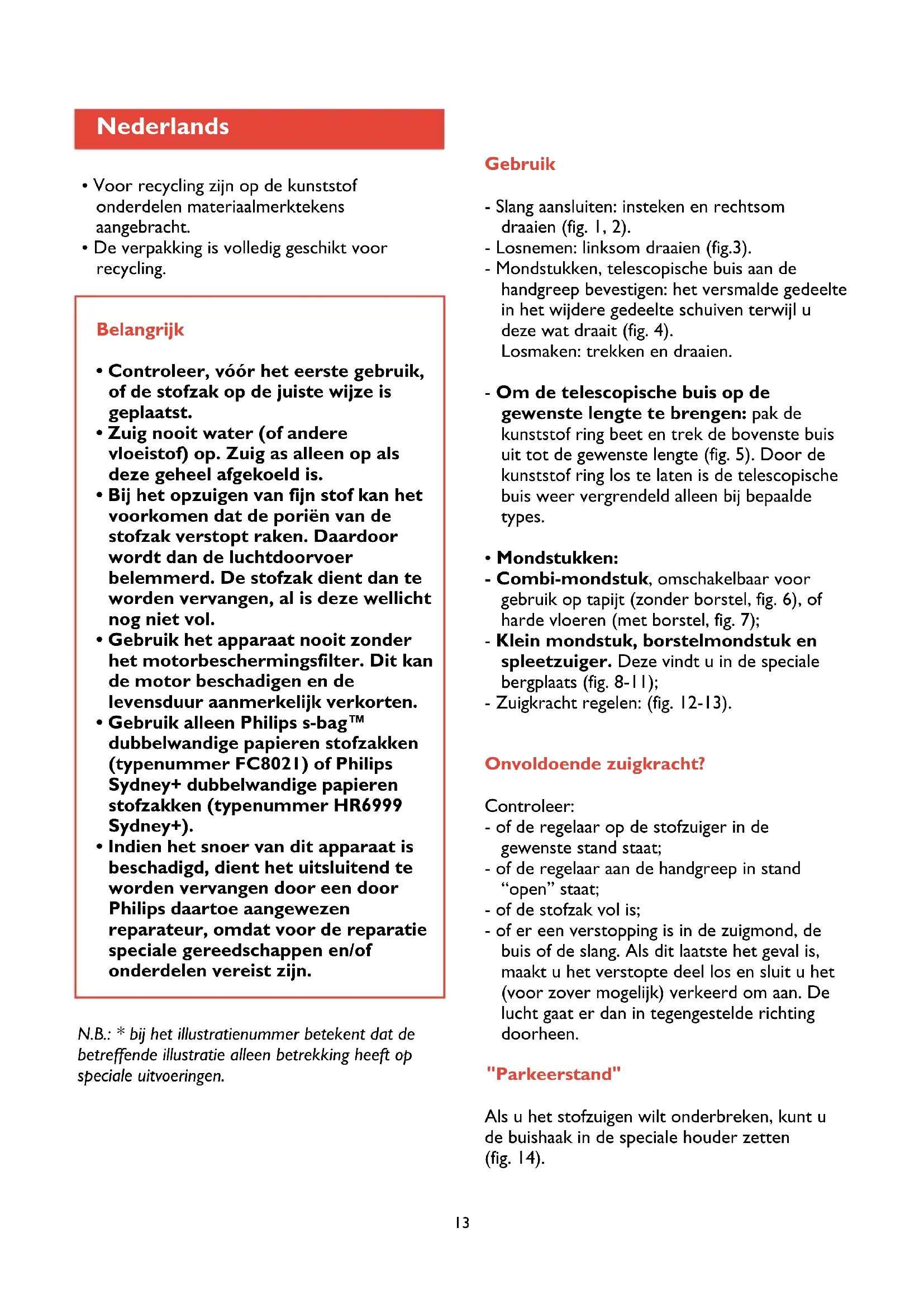 - Indien het snoer van dit apparaat is beschadigd, dient het uitsluitend te worden vervangen door een door Philips daartoe aangewezen reparateur, omdat voor de reparatie speciale gereedschappen en/of onderdelen vereist zijn. Nederlands N.B.: * bij het illustratienummer betekent dat de betreffende illustratie alleen betrekking heeft op speciale uitvoeringen.14 Desgewenst kunt u de buishaak langs de buis naar een andere hoogte verschuiven. In één beweging "parkeert" u de buis in een gemakkelijke stand (fig. 15). Opbergen - Schakel de stofzuiger uit. - Haal de stekker uit het stopcontact. - Druk op het snoerpedaal (i) om het snoer op te rollen. - Haak de onderste buis vast (fig. 16-17). Desgewenst kunt u de buishaak langs de buis naar een andere hoogte verschuiven. Stofzak vervangen Vervang de stofzak wanneer de “stofzak vol” indicator rood is, zelfs als het mondstuk niet op een oppervlak is geplaatst (fig. 18). - Schakel de stofzuiger uit. - Zet de kap open (fig. 19). - Duw de stofzakhouder naar achteren (fig. 20). - Verwijder de volle stofzak door aan de kartonnen lip te trekken (fig. 21). De stofzak wordt hierbij automatisch gesloten. - Schuif de kartonnen frontplaat van de nieuwe stofzak zo ver mogelijk in beide sleuven van de stofzakhouder (fig. 22). - Duw de stofzakhouder naar voren (“Klik!”) (fig. 23). N.B.: Als er geen stofzak is geplaatst, kunt u de kap niet sluiten.