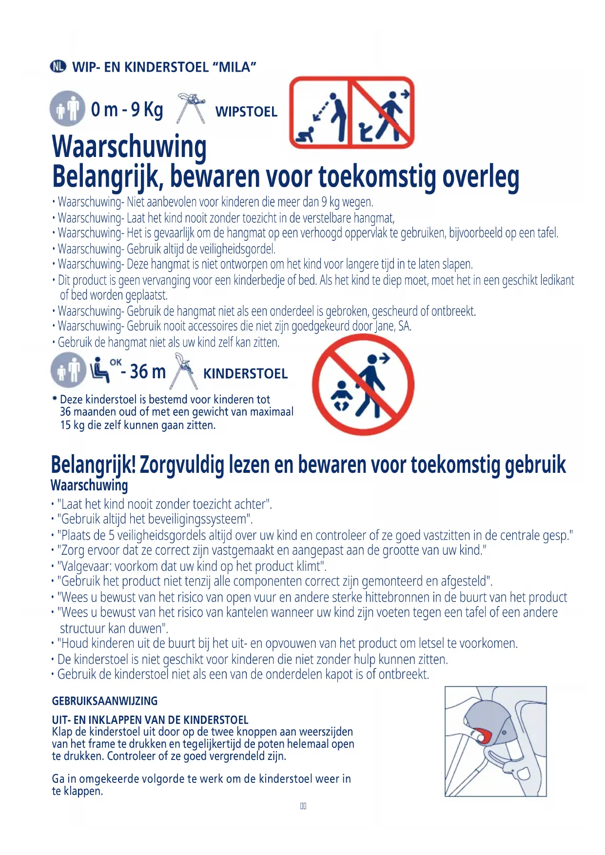 - "Zorg ervoor dat ze correct zijn vastgemaakt en aangepast aan de grootte van uw kind."• "Valgevaar: voorkom dat uw kind op het product klimt".• "Gebruik het product niet tenzij alle componenten correct zijn gemonteerd en afgesteld".• "Wees u bewust van het risico van open vuur en andere sterke hittebronnen in de buurt van het product• "Wees u bewust van het risico van kantelen wanneer uw kind zijn voeten tegen een tafel of een andere structuur kan duwen".• "Houd kinderen uit de buurt bij het uit- en opvouwen van het product om letsel te voorkomen.• De kinderstoel is niet geschikt voor kinderen die niet zonder hulp kunnen zitten.• Gebruik de kinderstoel niet als een van de onderdelen kapot is of ontbreekt.