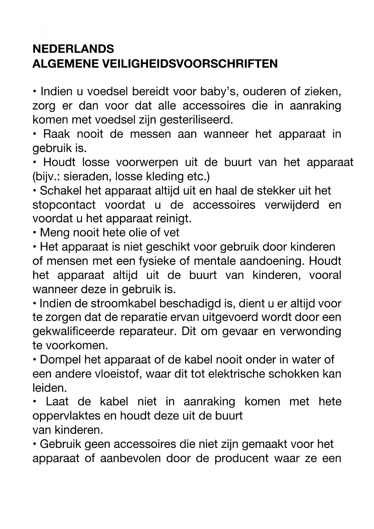 • Indien u voedsel bereidt voor baby's, ouderen of zieken, zorg er dan voor dat alle accessoires die in aanraking komen met voedsel�ige steriliseerd.