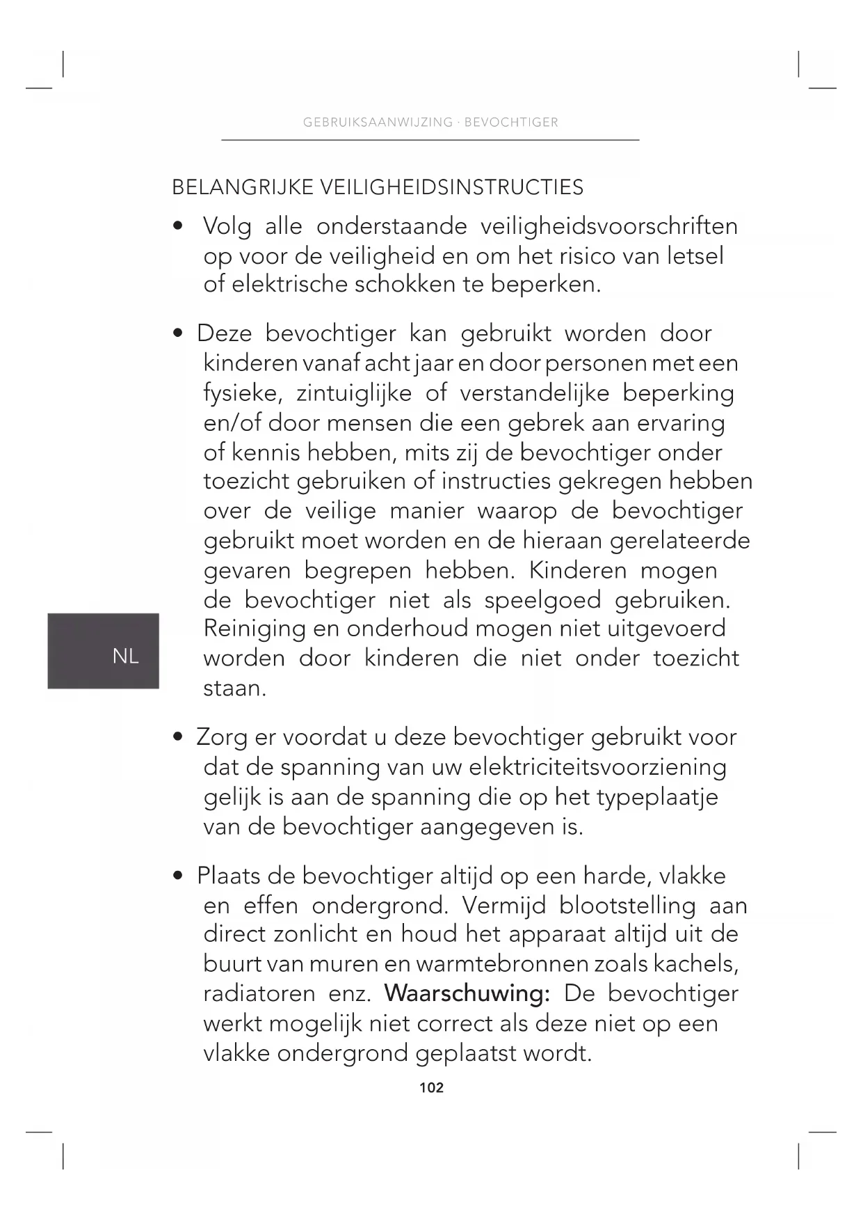 - Deze bevochtiger kan gebruikt worden door kinderen vanaf acht jaar en door personen met een fysieke, zintuiglijke of verstandelijke beperking en/of door mensen die een gebrek aan ervaring of kennis hebben, mits zij de bevochtiger onder toezicht gebruiken of instructies gekregen hebben over de veilige manier waarop de bevochtiger gebruikt moet worden en de hieraan gerelateerde gevaren begrepen hebben. Kinderen mogen de bevochtiger niet als speelgoed gebruiken. Reiniging en onderhoud mogen niet uitgevoerd worden door kinderen die niet onder toezicht staan.