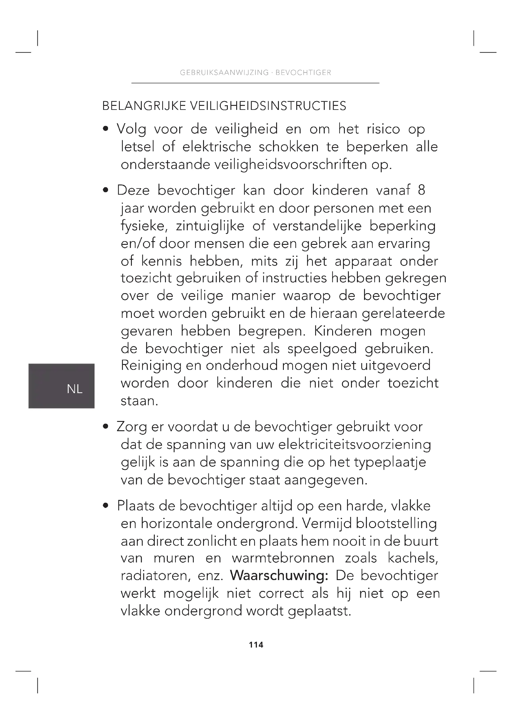 - Deze bevochtiger kan door kinderen vanaf 8 jaar worden gebruikt en door personen met een fysieke, zintuiglijke of verstandelijke beperking en/of door mensen die een gebrek aan ervaring of kennis hebben, mits zij het apparaat onder toezicht gebruiken of instructies hebben gekregen over de veilige manier waarop de bevochtiger moet worden gebruikt en de hieraan gerelateerde gevaren hebben begrepen. Kinderen mogen de bevochtiger niet als speelgoed gebruiken. Reiniging en onderhoud mogen niet uitgevoerd worden door kinderen die niet onder toezicht staan.