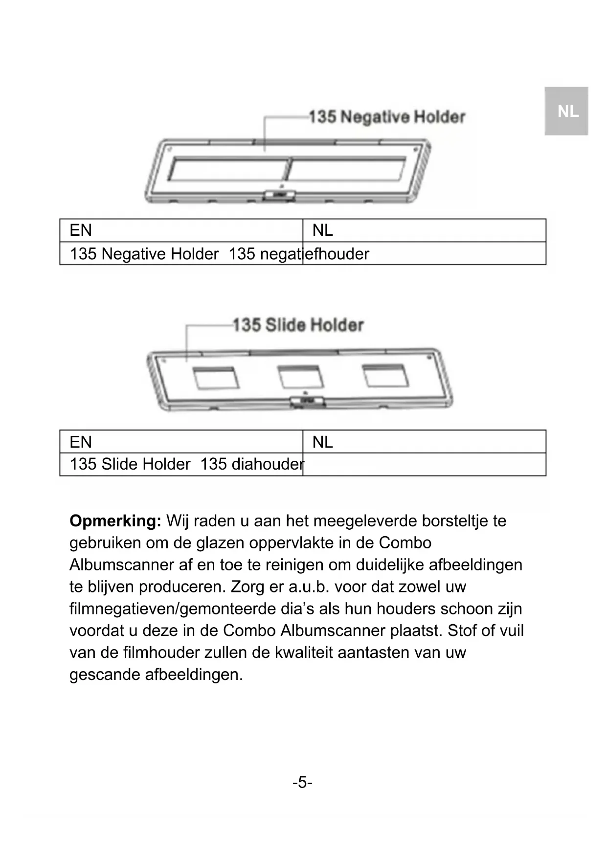 EN NL 135 Slide Holder 135 diahouder Opmerking: Wij raden u aan het meegeleverde borsteltje te gebruiken om de glazen oppervlakte in de Combo Albumscanner af en toe te reinigen om duidelijke afbeeldingen te blijven produceren. Zorg er a.u.b. voor dat zowel uw filmnegatieven/gemonteerde dia’s als hun houders schoon zijn voordat u deze in de Combo Albumscanner plaatst. Stof of vuil van de filmhouder zullen de kwaliteit aantasten van uw gescande afbeeldingen.Het batterijblok installeren