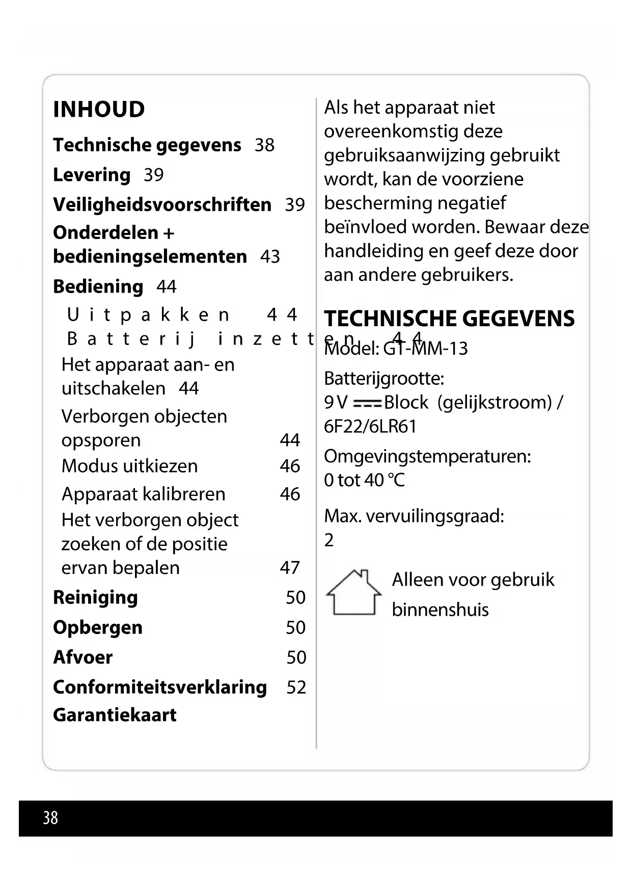 Alleen voor gebruik binnenshuis INHOUD Technische gegevens 38 Levering 39 Veiligheidsvoorschriften 39 Onderdelen + bedieningselementen 43 Bediening 44 Uitpakken 44 Batterij inzetten 44 Het apparaat aan- en uitschakelen 44 Verborgen objecten opsporen 44 Modus uitkiezen 46 Apparaat kalibreren 46 Het verborgen object zoeken of de positie ervan bepalen 47 Reiniging 50 Opbergen 50 Afvoer 50 Conformiteitsverklaring 52 Garantiekaart39 Omdat onze producten voortdurend verder worden ontwikkeld en verbeterd, zijn veranderingen in design en technische veranderingen mogelijk. Deze gebruiksaanwijzing kan ook als pdf-bestand van onze homepage www.gt-support.de worden gedownload. LEVERING Multidetector 1 x 9 V blokbatterij / 6F22/6LR61 Gebruiksaanwijzing met garantiebewijs VEILIGHEIDS- VOORSCHRIFTEN Lees de volgende aanwijzingen aandachtig door en bewaar deze gebruiksaanwijzing, voor het geval u later iets wilt nalezen. Als u het artikel aan iemand anders doorgeeft, geef dan ook deze gebruiksaanwijzing mee. Waarschuwing! Bij het gebruik van op batterijen aangedreven apparaten moeten ter bescherming tegen brandgevaar en tevens tegen lichamelijk letsel en zaakschade enkele fundamentele veiligheidsmaatregelen, inclusief de volgende voorschriften worden nageleefd. Houd uw werkruimte in orde!