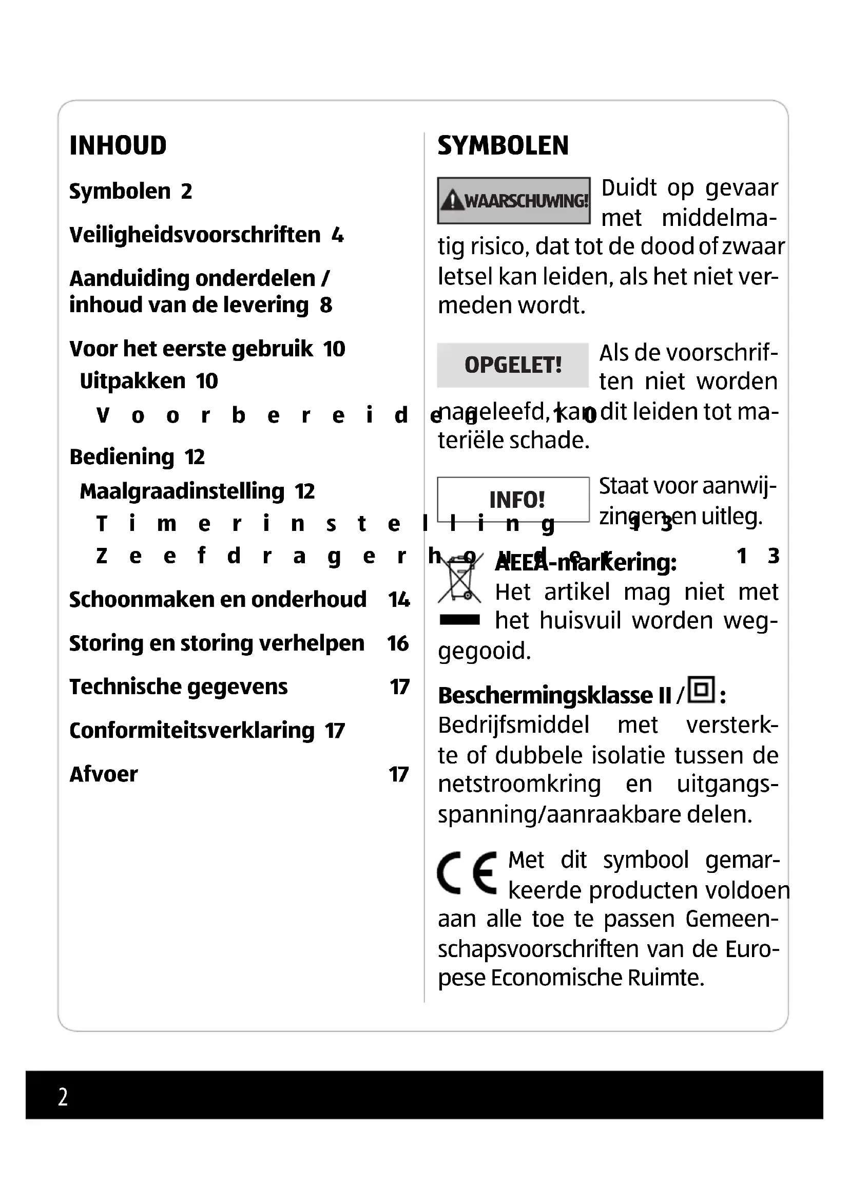 INHOUD Symbolen 2 Veiligheidsvoorschriften 4 Aanduiding onderdelen / inhoud van de levering 8 Voor het eerste gebruik 10 Uitpakken 10 Voorbereiden 10 Bediening 12 Maalgraadinstelling 12 Timerinstelling 13 Zeefdragerhouder 13 Schoonmaken en onderhoud 14 Storing en storing verhelpen 16 Technische gegevens 17 Conformiteitsverklaring 17 Afvoer 17 SYMBOLEN WAARSCHUWING! Duidt op gevaar met middelma- tig risico, dat tot de dood of zwaar letsel kan leiden, als het niet ver- meden wordt. OPGELET! Als de voorschrif- ten niet worden nageleefd, kan dit leiden tot ma- teriële schade. INFO! Staat voor aanwij- zingen en uitleg. AEEA-markering: Het artikel mag niet met het huisvuil worden weg- gegooid. Beschermingsklasse II / : Bedrijfsmiddel met versterk- te of dubbele isolatie tussen de netstroomkring en uitgangs- spanning/aanraakbare delen. Met dit symbool gemar- keerde producten voldoen aan alle toe te passen Gemeen- schapsvoorschriften van de Euro- pese Economische Ruimte.3 Het zegel ‘gekeurde veilig- heid’ (GS-teken) bevestigt dat een product voldoet aan de ei- sen van de Duitse productveilig- heidswet (ProdSG). Het GS-teken geeft aan, dat bij voorschriftmatig gebruik en bij voorzienbaar fou- tief gebruik van het gemerkte pro- duct, de veiligheid en gezondheid van de gebruiker niet in gevaar worden gebracht. Het betreft hier een vrijwillig veiligheidsmerk. Geachte klant, Hartelijk dank voor de aankoop van dit product. We hopen dat het u bevalt en dat u het graag zult gebruiken. In deze originele gebruiksaan- wijzing hebben we precies be- schreven hoe u het artikel opti- maal en veilig kunt gebruiken. Wij wensen er u veel plezier mee! Lees deze originele gebruiks- aanwijzing volledig door en volg deze op voordat u het ap- paraat in gebruik neemt, voor- al de veiligheidsinstructies en bewaar ze voor het geval u la- ter nog iets wilt nalezen. Wanneer u deze gebruiksaan- wijzing niet volgt, kan dit ern- stige letsels of schade aan de elektrische koffi emolen tot ge- volg hebben. Als u het artikel aan iemand an- ders doorgeeft, doe er dan ook deze gebruiksaanwijzing bij. Deze originele gebruiksaanwijzing kan ook als pdf-bestand van onze homepage www.gt-support.de worden gedownload.4 VEILIGHEIDSVOORSCHRIFTEN Gebruik volgens de voorschriften