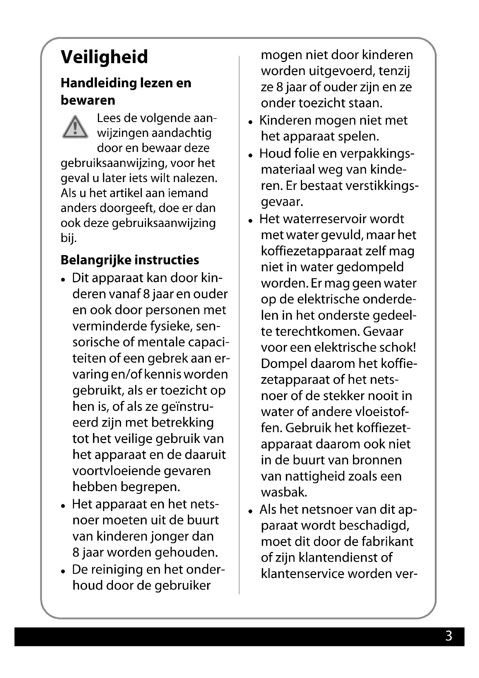 grondig uit. Vervolgens kunt u het koffiezetappa- raat weer gewoon gebruiken. Bewaren Als u het koffiezetapparaat langere tijd niet gebruikt, kunt u deze het beste op een droge en vorstvrije plaats in de ori- ginele verpakking bewaren.