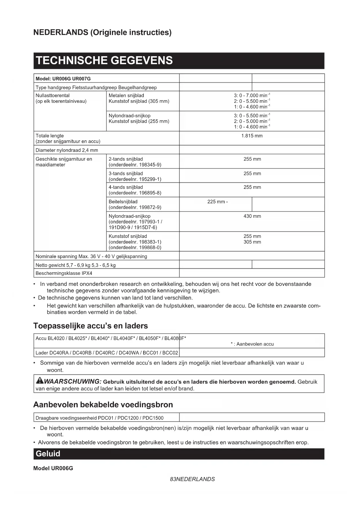 - Alvorens de bekabelde voedingsbron te gebruiken, leest u de instructies en waarschuwingsopschriften erop. Geluid Model UR006G84 NEDERLANDS Snijgarnituur Geluidsdrukniveau (L