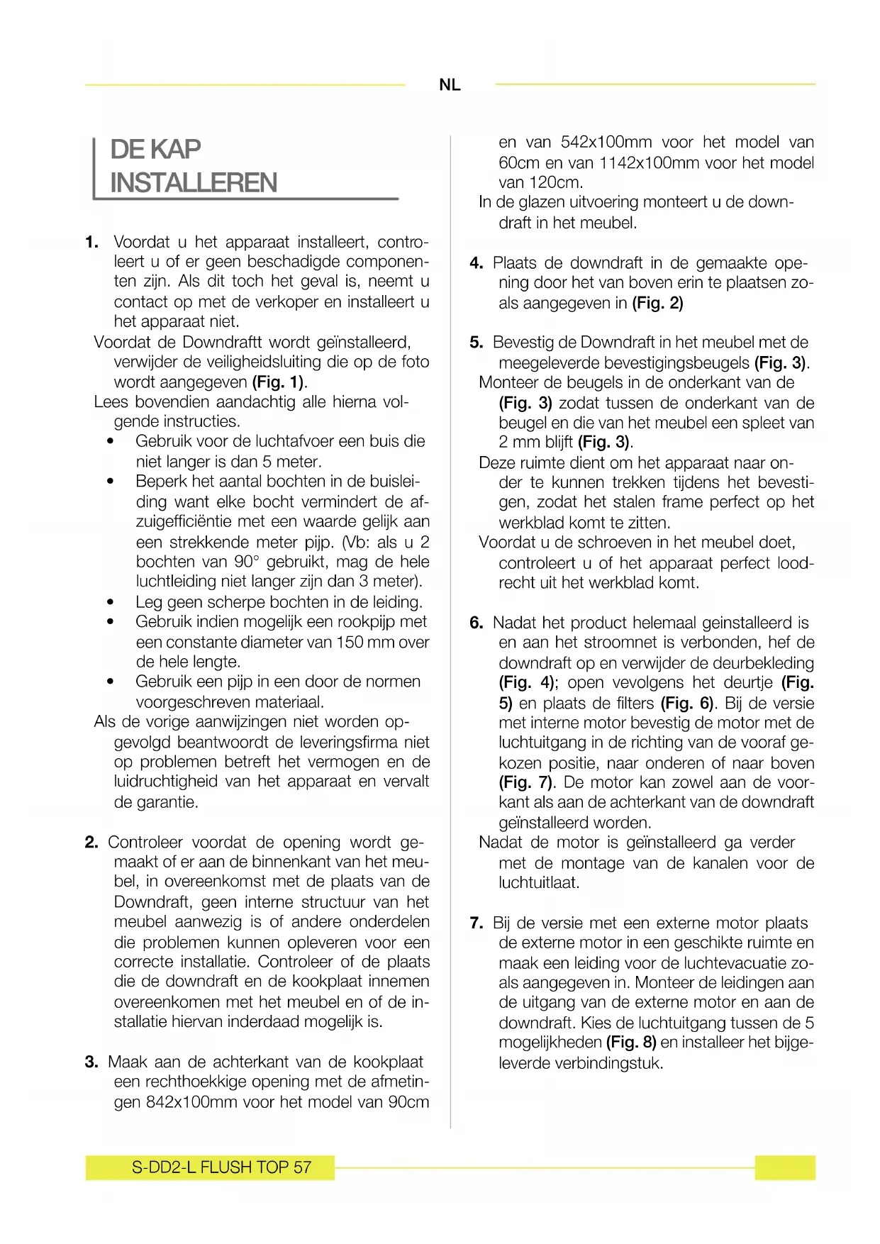 - OpdeDowndraftzittenveiligheidsschakelaars die het apparaat uitschakelen als het paneel vooraan op de filters wordt losgemaakt. Met de bedoeling om constant onze producten te verbeteren, behouden we ons het recht voor om de technische, functionele of esthetische kenmerken te veranderen die voortkomen uit in- novatie. Bij de versie externe motor moet voor het normale gebruik van de downdraft een ex- terne motor gebruikt worden van dezelfde fabri- kant. De verzamelde lucht mag niet geleid worden in een buis die wordt gebruikt voor het lossen van rook voor apparaten die met elektrische energie worden gevoed of met andere energie (centrale verwarmingsystemen enz.) Voor de lucht die af- gevoerd moet worden respecteer de voorschrif- ten van de plaatselijke autoriteit. WAARSCHUWING bewaar altijd deze gebruiksaanwijzing sa- men met de afzuigkap. Als het apparaat wordt verkocht of afgestaan aan anderen moet ze altijd vergezeld gaan van deze gebruiksaanwijzing. Wij bedanken u dat u deze aanwijzingen doorleest voordat u het apparaat gaat installeren en gebruiken. Deze aanwijzingen zijn speciaal opgesteld voor uw persoonlijke veiligheid en die van anderen.S-DD2-L FLUSH TOP 55