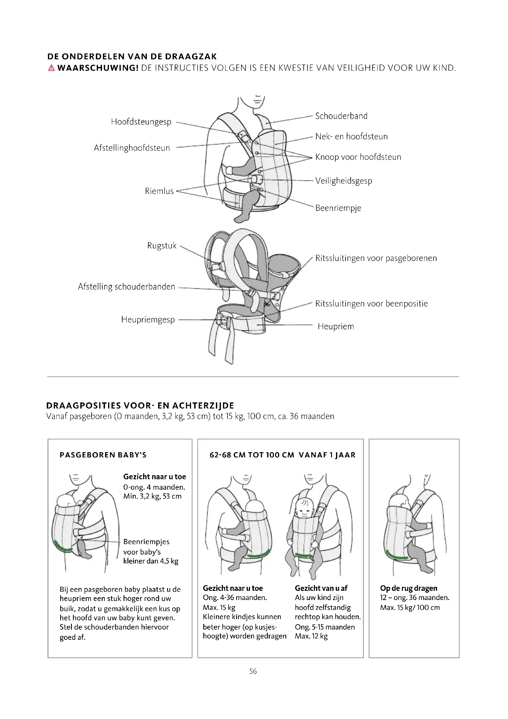 Vanaf pasgeboren (0 maanden, 3,2 kg, 53 cm) tot 15 kg, 100 cm, ca. 36 maanden Gezicht van u af Als uw kind zijn hoofd zelfstandig rechtop kan houden. Ong. 5-15 maanden Max. 12 kg Op de rug dragen 12 – ong. 36 maanden. Max. 15 kg/ 100 cm Gezicht naar u toe Ong. 4-36 maanden. Max. 15 kg Kleinere kindjes kunnen beter hoger (op kusjes- hoogte) worden gedragen Hoofdsteungesp Riemlus Schouderband Nek- en hoofdsteun Knoop voor hoofdsteun Veiligheidsgesp Beenriempje Rugstuk Heupriemgesp Afstelling schouderbanden Ritssluitingen voor beenpositie Heupriem Ritssluitingen voor pasgeborenen Afstelling hoofdsteun PASGEBOREN BABY'S Bij een pasgeboren baby plaatst u de heupriem een stuk hoger rond uw buik, zodat u gemakkelijk een kus op het hoofd van uw baby kunt geven. Stel de schouderbanden hiervoor goed af. Gezicht naar u toe 0-ong. 4 maanden. Min. 3,2 kg, 53 cm Beenriempjes voor baby's kleiner dan 4,5 kg