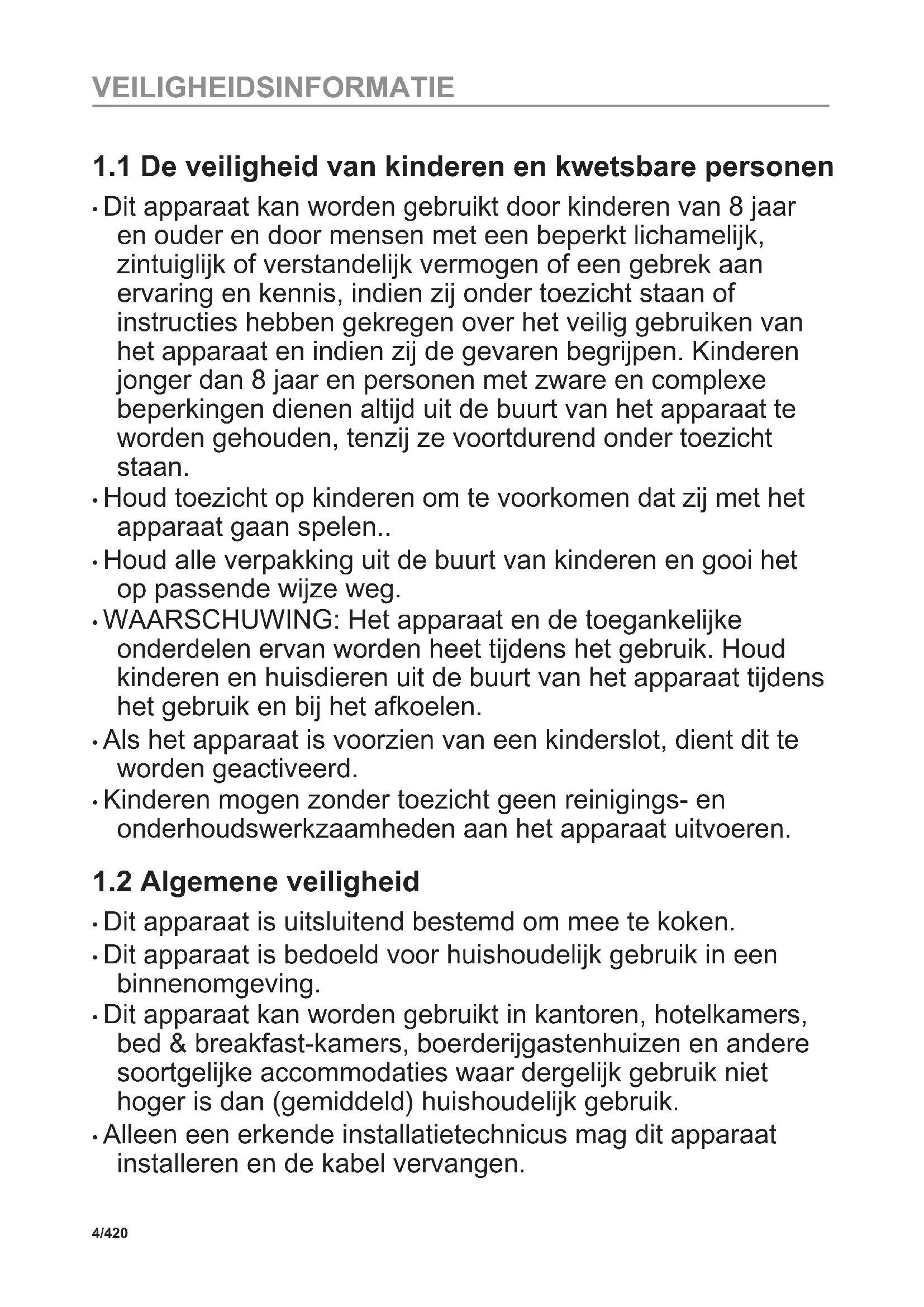 Lees zorgvuldig de meegeleverde instructies voor installatie en gebruik van het apparaat. De fabrikant is niet verantwoordelijk voor verwondingen of schade die voortvloeit uit de onjuiste installatie of het onjuiste gebruik. Bewaar de instructies altijd op een veilige, toegankelijke plek voor toekomstig gebruik. 3/420 VEILIGHEIDSINFORMATIE1.1 De veiligheid van kinderen en kwetsbare personen