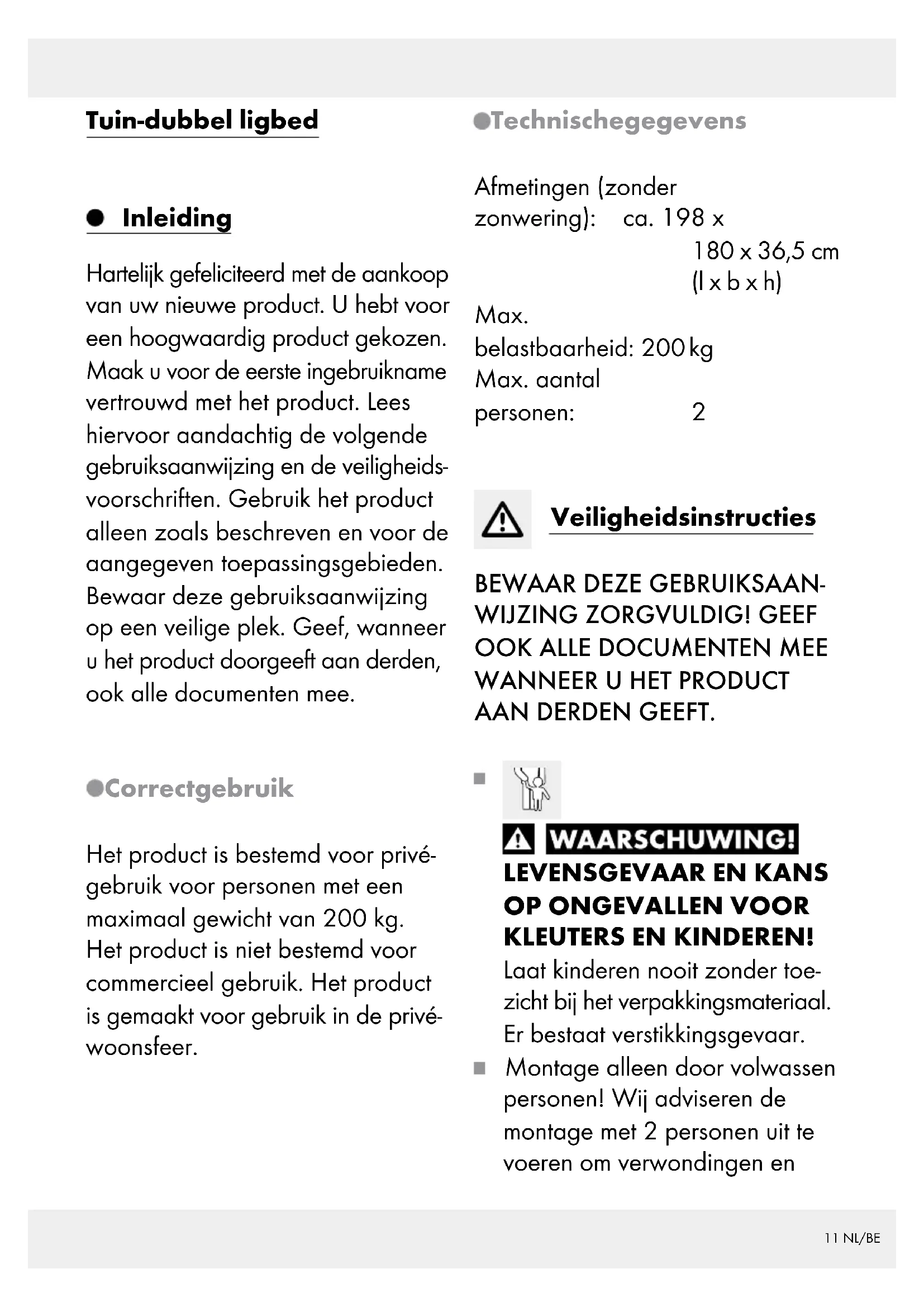 KLEUTERS EN KINDEREN! Laat kinderen nooit zonder toe- zicht bij het verpakkingsmateriaal. Er bestaat verstikkingsgevaar. Montage alleen door volwassen personen! Wij adviseren de montage met 2 personen uit te voeren om verwondingen en12 NL/BE beschadigingen aan het product te voorkomen. Let erop dat alle onderdelen - in- clusief de zonwering - volledig gemonteerd zijn, voordat u het product gebruikt. Controleer het product voor elk gebruik op beschadigingen of slijtage. Gebruik het product alleen als het in onberispelijke staat verkeert. Gebruik het pro- duct niet als er beschadigingen zichtbaar zijn of als u deze ver- moedt. Plaats het product voor het gebruik op een vlakke, vaste ondergrond, anders kan het product instabiel worden en opzij vallen of kantelen