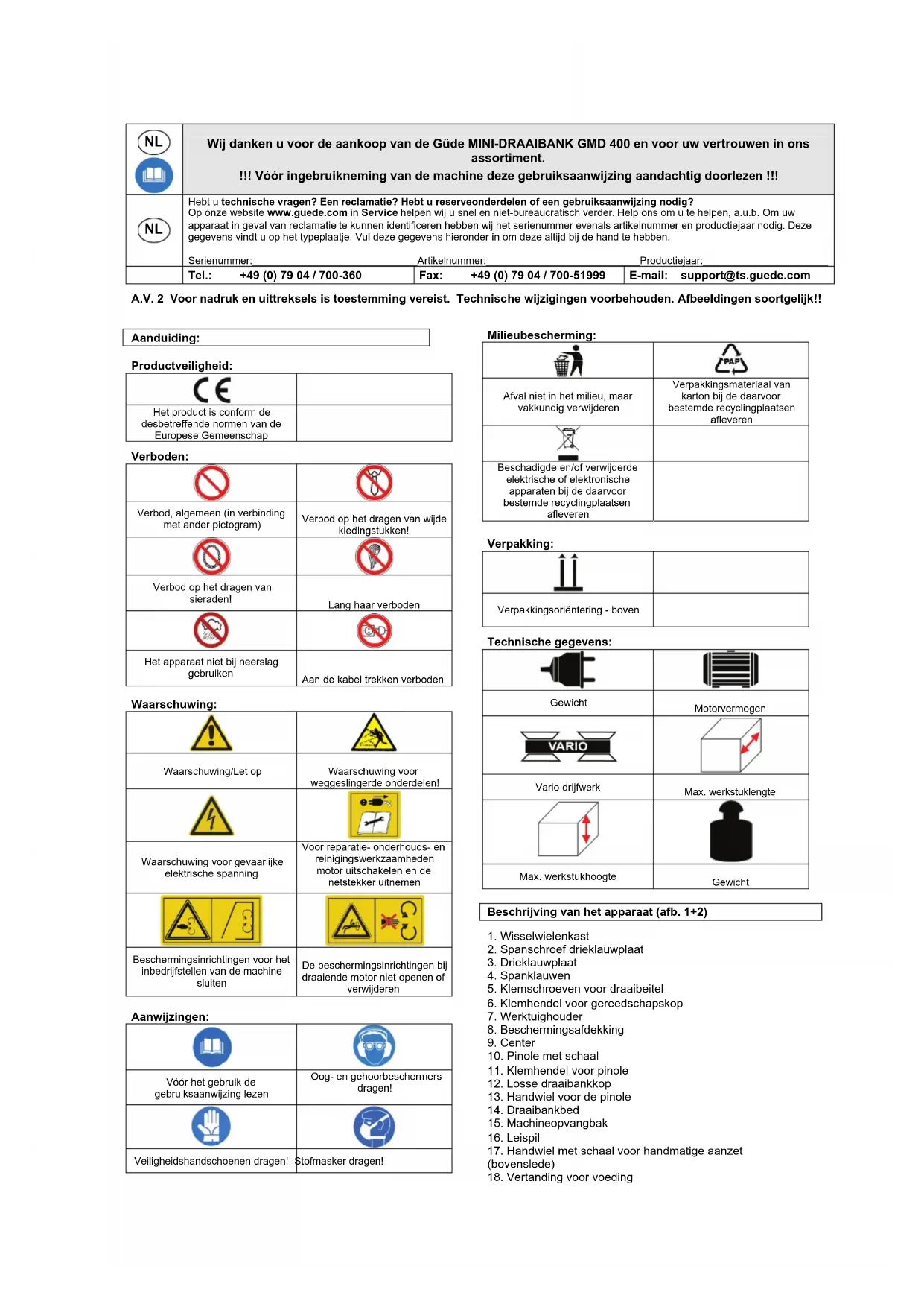 Serienummer:_____________________________Artikelnummer:___________________________Productiejaar:______________________ Tel.: +49 (0) 79 04 / 700-360 Fax: +49 (0) 79 04 / 700-51999 E-mail: support@ts.guede.com A.V. 2 Voor nadruk en uittreksels is toestemming vereist. Technische wijzigingen voorbehouden. Afbeeldingen soortgelijk!! Aanduiding: Productveiligheid: