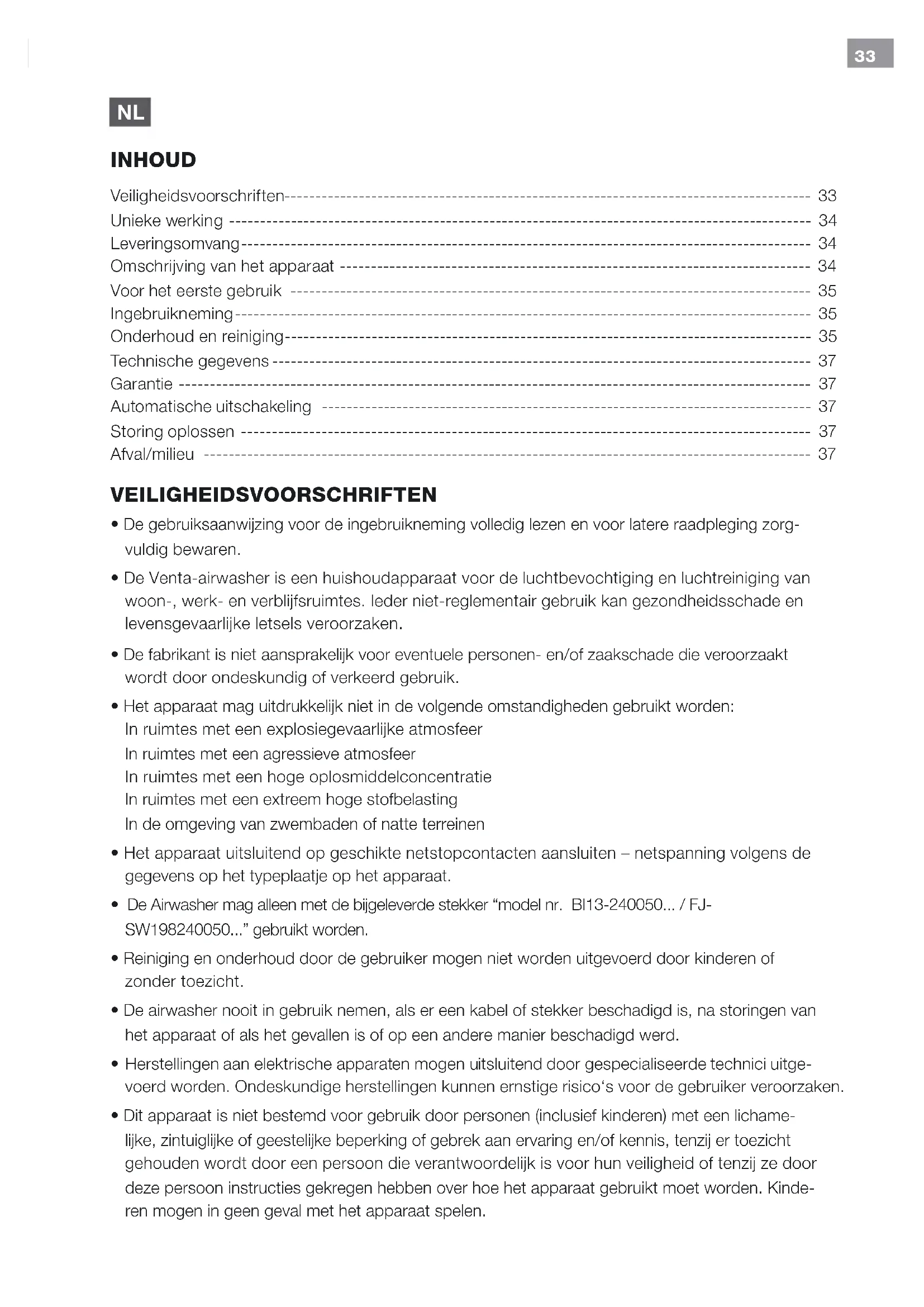 - De Venta-airwasher is een huishoudapparaat voor de luchtbevochtiging en luchtreiniging van woon-, werk- en verblijfsruimtes. Ieder niet-reglementair gebruik kan gezondheidsschade en levensgevaarlijke letsels veroorzaken.