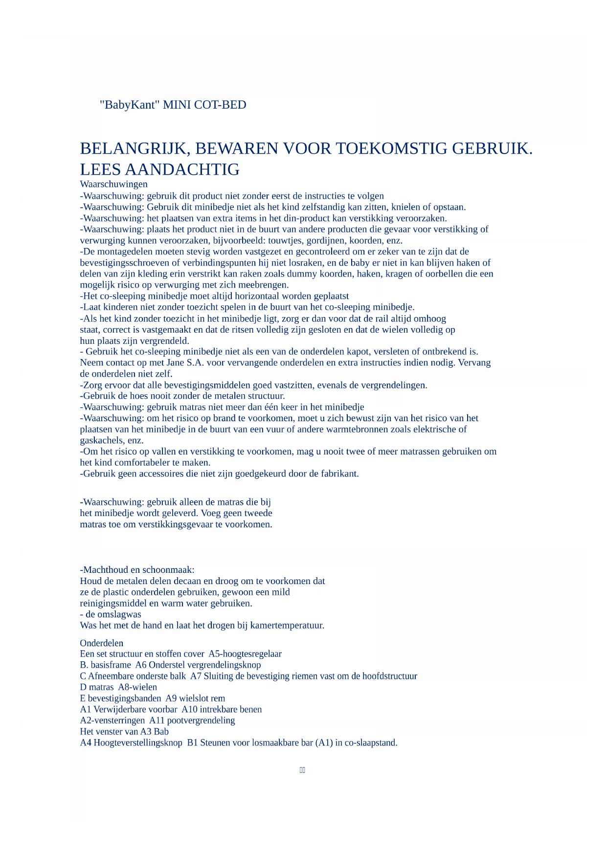 “click” KATTANÁS6804 BABYSIDE IM 1860,05 CUNA ins_ar.indd 82 3/11/2021 4:32:19 PMTÁJÉKOZTATÁS A GARANCIÁRÓL - Ez a termék garanciával rendelkezik gyártási hibák esetére, az Európai Unió valamint a forgalmazó ország fogyasztási cikkek garanciáira vonatkozó hatályos irányelveiben és/vagy jogi szabályozásaiban előírtak szerint. - A garancia a termék eladóján keresztül, ennek hiányában pedig a gyártón keresztül történő érvényesítéséhez feltétlenül be kell mutatnia a számlát vagy a vásárlási bizonylatot az üzletben, ahol a terméket vásárolta. - A garancia nem érvényes a termék nem megfelelő használatából vagy a használati utasításban leírt biztonsági és karbantartási előírások be nem tartásából eredő hibák és károk, illetve a termék rendes használatából eredő normál elhasználódása esetén. - A modell sorozatszámát tartalmazó címkét semmilyen körülmények között nem szabad letépni, mivel a garancia szempontjából fontos információkat tartalmaz.NL "BabyKant" MINI COT-BED BELANGRIJK, BEWAREN VOOR TOEKOMSTIG GEBRUIK. LEES AANDACHTIG Waarschuwingen -Waarschuwing: gebruik dit product niet zonder eerst de instructies te volgen -Waarschuwing: Gebruik dit minibedje niet als het kind zelfstandig kan zitten, knielen of opstaan. -Waarschuwing: het plaatsen van extra items in het din-product kan verstikking veroorzaken. -Waarschuwing: plaats het product niet in de buurt van andere producten die gevaar voor verstikking of verwurging kunnen veroorzaken, bijvoorbeeld: touwtjes, gordijnen, koorden, enz. -De montagedelen moeten stevig worden vastgezet en gecontroleerd om er zeker van te zijn dat de bevestigingsschroeven of verbindingspunten hij niet losraken, en de baby er niet in kan blijven haken of delen van zijn kleding erin verstrikt kan raken zoals dummy koorden, haken, kragen of oorbellen die een mogelijk risico op verwurging met zich meebrengen. -Het co-sleeping minibedje moet altijd horizontaal worden geplaatst -Laat kinderen niet zonder toezicht spelen in de buurt van het co-sleeping minibedje. -Als het kind zonder toezicht in het minibedje ligt, zorg er dan voor dat de rail altijd omhoog staat, correct is vastgemaakt en dat de ritsen volledig zijn gesloten en dat de wielen volledig op hun plaats zijn vergrendeld. - Gebruik het co-sleeping minibedje niet als een van de onderdelen kapot, versleten of ontbrekend is. Neem contact op met Jane S.A. voor vervangende onderdelen en extra instructies indien nodig. Vervang de onderdelen niet zelf. -Zorg ervoor dat alle bevestigingsmiddelen goed vastzitten, evenals de vergrendelingen. -Gebruik de hoes nooit zonder de metalen structuur. -Waarschuwing: gebruik matras niet meer dan één keer in het minibedje -Waarschuwing: om het risico op brand te voorkomen, moet u zich bewust zijn van het risico van het plaatsen van het minibedje in de buurt van een vuur of andere warmtebronnen zoals elektrische of gaskachels, enz. -Om het risico op vallen en verstikking te voorkomen, mag u nooit twee of meer matrassen gebruiken om het kind comfortabeler te maken. -Gebruik geen accessoires die niet zijn goedgekeurd door de fabrikant. -Waarschuwing: gebruik alleen de matras die bij het minibedje wordt geleverd. Voeg geen tweede matras toe om verstikkingsgevaar te voorkomen. -Machthoud en schoonmaak: Houd de metalen delen decaan en droog om te voorkomen dat ze de plastic onderdelen gebruiken, gewoon een mild reinigingsmiddel en warm water gebruiken. - de omslagwas Was het met de hand en laat het drogen bij kamertemperatuur. Onderdelen Een set structuur en stoffen cover A5-hoogtesregelaar B. basisframe A6 Onderstel vergrendelingsknop C Afneembare onderste balk A7 Sluiting de bevestiging riemen vast om de hoofdstructuur D matras A8-wielen E bevestigingsbanden A9 wielslot rem A1 Verwijderbare voorbar A10 intrekbare benen A2-vensterringen A11 pootvergrendeling Het venster van A3 Bab A4 Hoogteverstellingsknop B1 Steunen voor losmaakbare bar (A1) in co-slaapstand. Controleer of de 2 plastic een en b-gezicht naar boven ondersteunt Instructies Het assembleren en demonteren van de Co-Sleeping Mini Cot. - Om het kinderbedje te monteren, plaats het bovenste frame met de bekleding op een schone tafel of op een bed zoals weergegeven in diagram 2. - Plaats elk van de zijbenen altijd met de hoogte nummering aan de buitenzijde en insert het einde van elk been in de zijsteunen van de kunststof en de metalen pen naar buiten komt door het gat (het zal klikken) en de kunststof zijbenen worden in de gaten ingesloest. - Je moet de veiligheidsmappen horen. -Fit de lange staaf door het inbrengen van elk uiteinde in de plastic sleuven tot de metalen pen weer springt. Je moet de veiligheid clicks horen. Plaats vervolgens de structuur met de wielen op de vloer. -Lastly, plaats het onderste frame het zijeinden zijn uitgelijnd met de gaten halverwege de zijkanten van mini wieg en vervolgens volledig inzetstuk elk einde binnenwaarts aantippen totdat het veilig klikken hoort. -Neem de zijde stof band en dek de aluminium zijsteun draaien van de band naar de andere Velcro deel hebben, vanuit het mini wieg samendrukken het Velcro delen sluiten. Bevestig de bovenste klittenband met klittenband gevonden onder de stof. Demonteren van de mini-kinderbedje: Ontmantelen de mini wieg volg bovenstaande stappen achteruit totdat de 3 blokken van elke zijde met één hand te drukken de metalen pen (1) en anderzijds de pers de 2 kunststof poten (2, 3) zijn vrijgegeven en Verwijder vervolgens het been (4). Nadat het basisframe is geassembleerd, fit de bekleding door de velcro-strips (4) te bevestigen die op de onderste van de bekleding (4) zijn gevonden aan de basisframe-buis. Plaats de matras op de bodem van de mini-cot. Gebruik de mini wieg zonder BabyKant matras. Vergrendel alle vier wielen van de Co-Sleeping Mini-kinderbedje, het verlagen van de hefbomen om ze te vergrendelen zodat het rode cijfer volledig zichtbaar is o