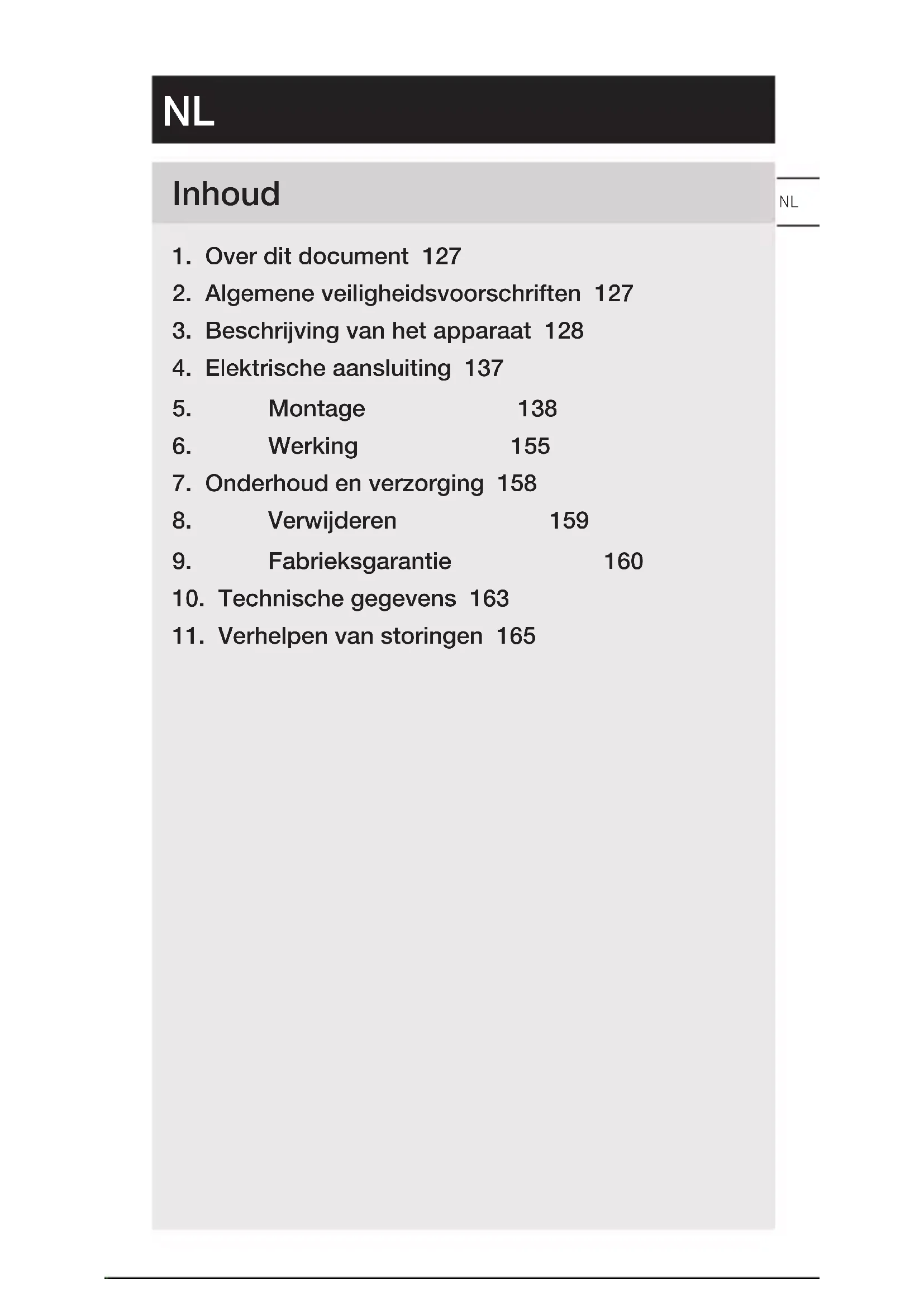 - Toegankelijk bewaren. – Door de omgang met elektrische stroom kunnen gevaarlijke situaties ontstaan. Het aanraken van stroom- voerende componenten kan een elektrische schok, verbrandingen of zelfs de dood tot gevolg hebben. – Werkzaamheden aan de netspanning mogen uitsluitend door gekwalificeerd vakpersoneel worden uitgevoerd.– 127 – Inhoud