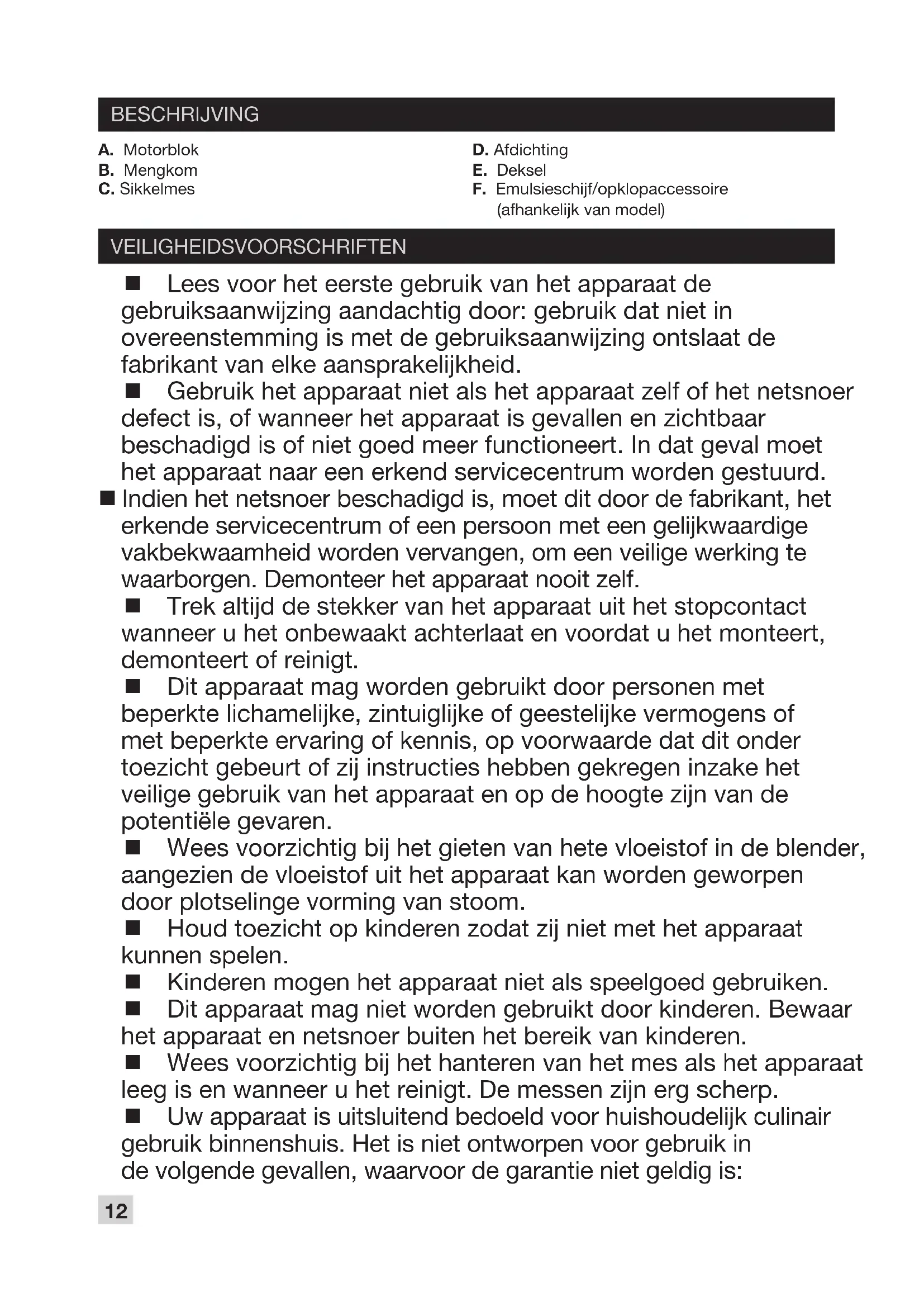 (according to model) MAYONNAISES CREME CHANTILLY 200 ml of 35% fat UHT whipping cream. 20 g caster sugar or 20 g of icing sugar and 1 sachet of vanilla sugar (optional). Tip to obtain superb, really stiff Chantilly creams. Use very cold UHT whipping cream straight from the refrigerator. Tips to make really superb, stiff mayonnaise: - Use all ingredients at room temperature. - Clean the bowl and the disc with cold water. - Respect the quantities of ingredients stated in each recipe. Note: For best results use olive oil or sunower oil, or a mixture of both. Fit the emulsifying disc in the bowl. Pour in the ingredients and lock the lid. Process continuously for 30 seconds to obtain a smooth cream or about 1 minute to make whipped Chantilly. Caution: Check the consistency of your preparation after 45 seconds. If you mix for too long, you will obtain butter. Mayonnaise with mustard Fit the emulsifying disc to the bowl. Add the following ingredients to the bowl: 1 egg yolk, 1 tablespoon of French mustard, 1/2 tablespoon of wine vinegar, salt and pepper. Measure out 45 ml (3 tablespoons) of oil and set aside. Lock the lid and run for 15 seconds. Pour in about 1 tablespoon of oil, process briey then add the rest of the oil and process continuously for about 20 to 50 seconds. Pancake mix For 0.4 l of mix: 80 g plain our, 2 eggs, 1/2 teaspoon of ne salt, 150 ml milk, 1 teaspoon of oil, avouring. Put all the ingredients in the bowl and mix until you obtain a smooth mix (about 10 to 15 seconds). Wafe mix 80 g plain our, 5 g fresh yeast (or 1 teaspoon Easybake or Fast Action dried yeast), 1 egg, 120 ml milk, 35 g melted butter, 1 tablespoon of vanilla sugar. If using fresh yeast dilute the baker’s yeast in a little warm water. Put all the ingredients into the bowl and blend for about 15 to 20 seconds until you get a smooth mix, then leave to stand for 1 hour. If using dried yeast, add with the other ingredients. Mayonnaise without mustard Proceed as for mayonnaise with mustard, replacing the mustard with 3 tablespoons of lemon juice. If you want to make more mayonnaise, add oil (about 30 ml) and run the appliance for 15 seconds more. Anchovy Paste 15 llets of anchovies in oil, 2 cloves of garlic, 3 hard-boiled egg yolks, 3 tablespoons of olive oil. Chop the garlic cloves nely. Add the anchovies and mix again. Blend in the egg yolks with 3 tablespoons of oil. Blend to obtain a cream. Add oil to achieve the desired consistency.12 BESCHRIJVING VEILIGHEIDSVOORSCHRIFTEN A. Motorblok B. Mengkom C. Sikkelmes D. Afdichting E. Deksel F. Emulsieschijf/opklopaccessoire (afhankelijk van model) Lees voor het eerste gebruik van het apparaat de gebruiksaanwijzing aandachtig door: gebruik dat niet in overeenstemming is met de gebruiksaanwijzing ontslaat de fabrikant van elke aansprakelijkheid. Gebruik het apparaat niet als het apparaat zelf of het netsnoer defect is, of wanneer het apparaat is gevallen en zichtbaar beschadigd is of niet goed meer functioneert. In dat geval moet het apparaat naar een erkend servicecentrum worden gestuurd. Indien het netsnoer beschadigd is, moet dit door de fabrikant, het erkende servicecentrum of een persoon met een gelijkwaardige vakbekwaamheid worden vervangen, om een veilige werking te waarborgen. Demonteer het apparaat nooit zelf. Trek altijd de stekker van het apparaat uit het stopcontact wanneer u het onbewaakt achterlaat en voordat u het monteert, demonteert of reinigt. Dit apparaat mag worden gebruikt door personen met beperkte lichamelijke, zintuiglijke of geestelijke vermogens of met beperkte ervaring of kennis, op voorwaarde dat dit onder toezicht gebeurt of zij instructies hebben gekregen inzake het veilige gebruik van het apparaat en op de hoogte zijn van de potentiële gevaren. Wees voorzichtig bij het gieten van hete vloeistof in de blender, aangezien de vloeistof uit het apparaat kan worden geworpen door plotselinge vorming van stoom. Houd toezicht op kinderen zodat zij niet met het apparaat kunnen spelen. Kinderen mogen het apparaat niet als speelgoed gebruiken. Dit apparaat mag niet worden gebruikt door kinderen. Bewaar het apparaat en netsnoer buiten het bereik van kinderen. Wees voorzichtig bij het hanteren van het mes als het apparaat leeg is en wanneer u het reinigt. De messen zijn erg scherp. Uw apparaat is uitsluitend bedoeld voor huishoudelijk culinair gebruik binnenshuis. Het is niet ontworpen voor gebruik in de volgende gevallen, waarvoor de garantie niet geldigis:NL