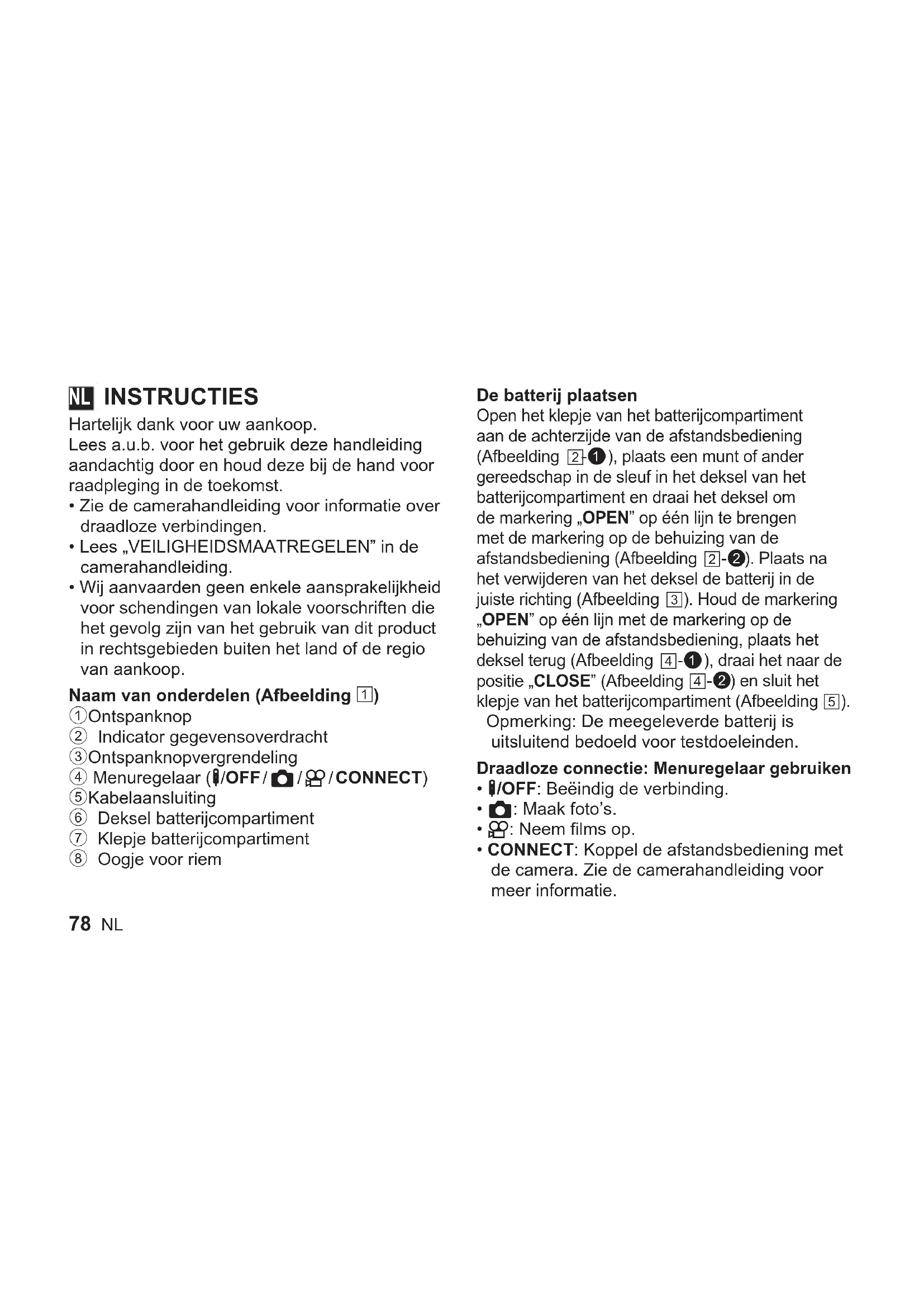 - Wij aanvaarden geen enkele aansprakelijkheid voor schendingen van lokale voorschriften die het gevolg zijn van het gebruik van dit product in rechtsgebieden buiten het land of de regio van aankoop. Naam van onderdelen (Afbeelding 1) 1 Ontspanknop 2 Indicator gegevensoverdracht 3 Ontspanknopvergrendeling 4 Menuregelaar (b/OFF / K / n / CONNECT) 5 Kabelaansluiting 6 Deksel batterijcompartiment 7 Klepje batterijcompartiment 8 Oogje voor riem De batterij plaatsen Open het klepje van het batterijcompartiment aan de achterzijde van de afstandsbediening (Afbeelding