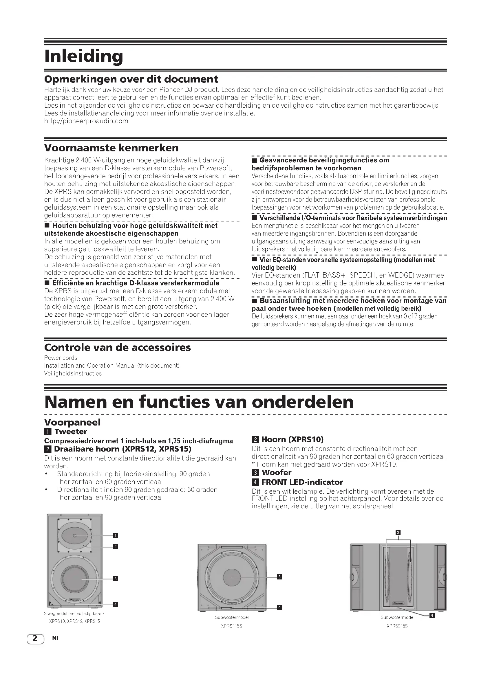 Inleiding Opmerkingen over dit document Hartelijk dank voor uw keuze voor een Pioneer DJ product. Lees deze handleiding en de veiligheidsinstructies aandachtig zodat u het apparaat correct leert te gebruiken en de functies ervan optimaal en effectief kunt bedienen. Lees in het bijzonder de veiligheidsinstructies en bewaar de handleiding en de veiligheidsinstructies samen met het garantiebewijs. Lees de installatiehandleiding voor meer informatie over de installatie. http://pioneerproaudio.com Krachtige 2 400 W-uitgang en hoge geluidskwaliteit dankzij toepassing van een D-klasse versterkermodule van Powersoft, het toonaangevende bedrijf voor professionele versterkers, in een houten behuizing met uitstekende akoestische eigenschappen. De XPRS kan gemakkelijk vervoerd en snel opgesteld worden, en is dus niet alleen geschikt voor gebruik als een stationair geluidssysteem in een stationaire opstelling maar ook als geluidsapparatuur op evenementen.