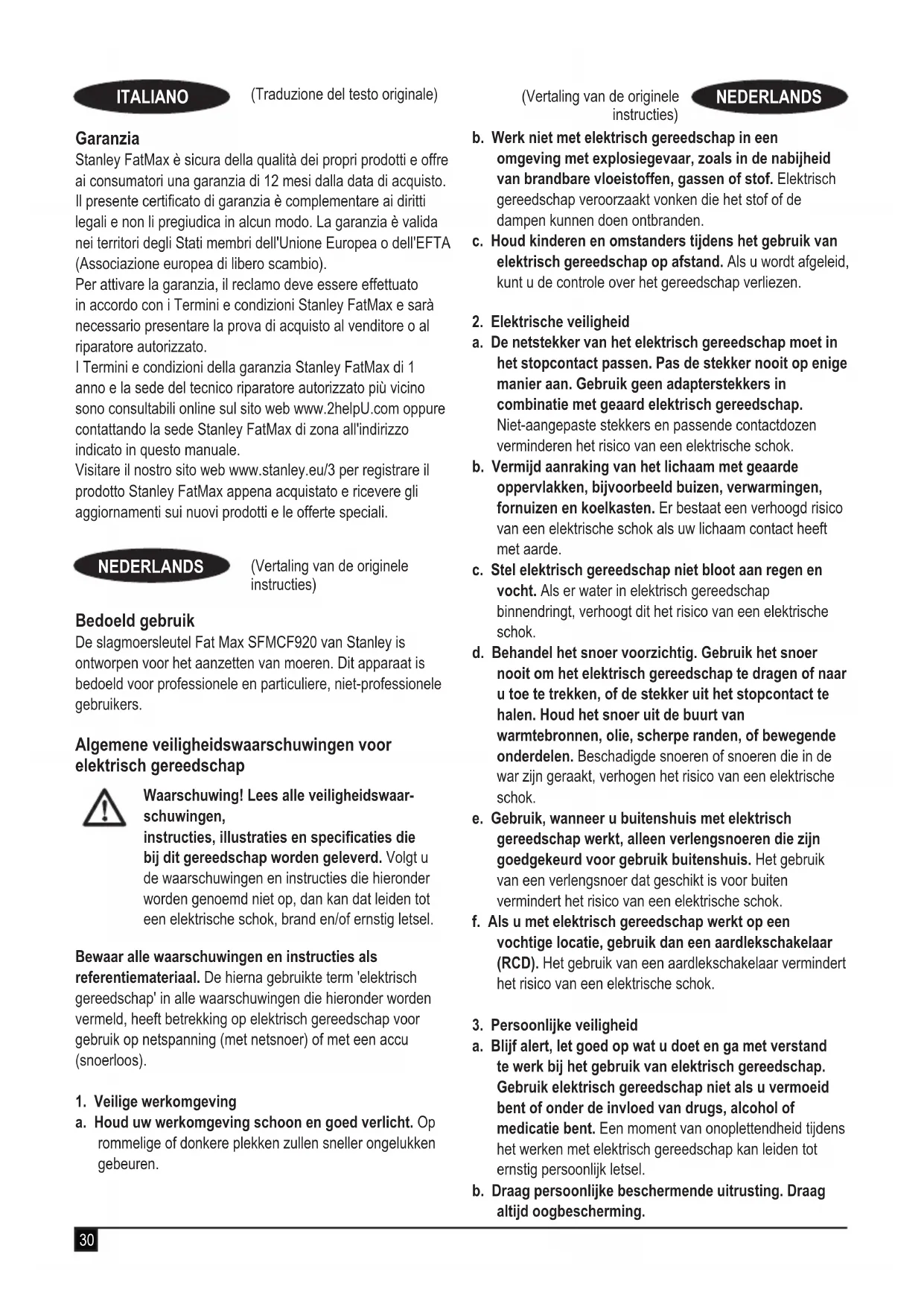 Snoerloze slagmoersleutel - SFMCF920 STANLEY FATMAX verklaart dat de producten die worden beschreven onder “technische gegevens” voldoen aan EN62841-1:2015, EN62841-2-2: 2014. Deze producten voldoen ook aan richtlijn 2006/42/EC, 2014/30/EU en 2011/65/EU. Neem voor meer informatie contact op met STANLEY FATMAX op het volgende adres of raadpleeg de achterzijde van de handleiding. Neem voor meer informatie contact op met STANLEY FATMAX op het volgende adres of raadpleeg de achterzijde van de handleiding. Ondergetekende is verantwoordelijk voor de samenstelling van het technische bestand en en geeft deze verklaring af namens STANLEY FATMAX. Patrick Diepenbach General Manager, Benelux STANLEY FATMAX, Egide Walschaertsstraat 14 - 18 2800 Mechelen, België 19-04-2021 Garantie Stanley Fat Max heeft vertrouwen in zijn producten en biedt consumenten een garantie van 12 maanden vanaf de datum van aankoop. Deze garantie vormt een aanvulling op uw wettelijke rechten en beperken deze niet. De garantie is geldig op het grondgebied van de Lidstaten van de Europese Unie en de Europese Vrijhandelszone. Voor een garantie-aanspraak moet uw aanspraak in overeenstemming zijn met de Voorwaarden en Condities van Stanley Fat Max en moet u een bewijs van aankoop overleggen aan de verkoper of aan een geautoriseerde reparatiemonteur. Voorwaarden en condities van de 1-jarige garantie van Stanley Fat Max en het adres van de vestiging van het geautoriseerde reparatiecentrum bij u in de buurt, kunt u vinden op internet op www.2helpU.com, of door contact op te nemen met het Stanley Fat Max-kantoor ter plaatse, op het adres dat in deze handleiding wordt vermeld. Bezoek onze website www.stanley.eu/3, waar u dit nieuwe Stanley Fat Max-product kunt registreren en informatie kunt vinden over nieuwe producten en speciale aanbiedingen.37 (Traducción de las instrucciones originales) ESPAÑOL Uso previsto La llave de impacto SFMCF920 de Stanley Fat Max ha sido diseñada para aplicaciones de jación por impacto. Este aparato ha sido concebido para usuarios profesionales y para usuarios no profesionales privados. Advertencias de seguridad para herramientas eléctricas en general ¡Advertencia! Lea todas las advertencias de seguridad, instrucciones, ilustraciones y especicacio- nes incluidas con esta herramienta eléctrica. En caso de no atenerse a las siguientes adver- tencias e instrucciones de seguridad, podría producirse una descarga eléctrica, incendio o lesión grave. Guarde todas las advertencias e instrucciones para futuras consultas. El término “herramienta eléctrica” empleado en las advertencias a continuación hace referencia a la herramienta eléctrica con alimentación de red (con cable) o alimentada por batería (sin cable).