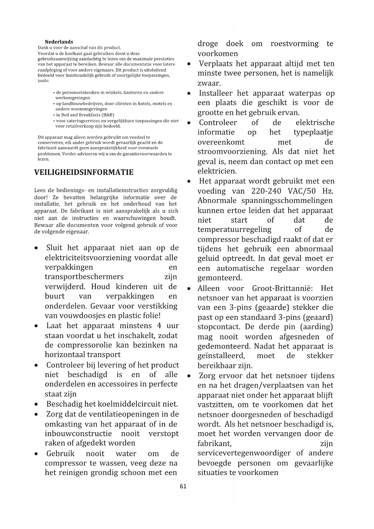- Het apparaat wordt gebruikt met een voeding van 220-240 VAC/50 Hz. Abnormale spanningsschommelingen kunnen ertoe leiden dat het apparaat niet start of dat de temperatuurregeling of de compressor beschadigd raakt of dat er tijdens het gebruik een abnormaal geluid optreedt. In dat geval moet er een automatische regelaar worden gemonteerd.