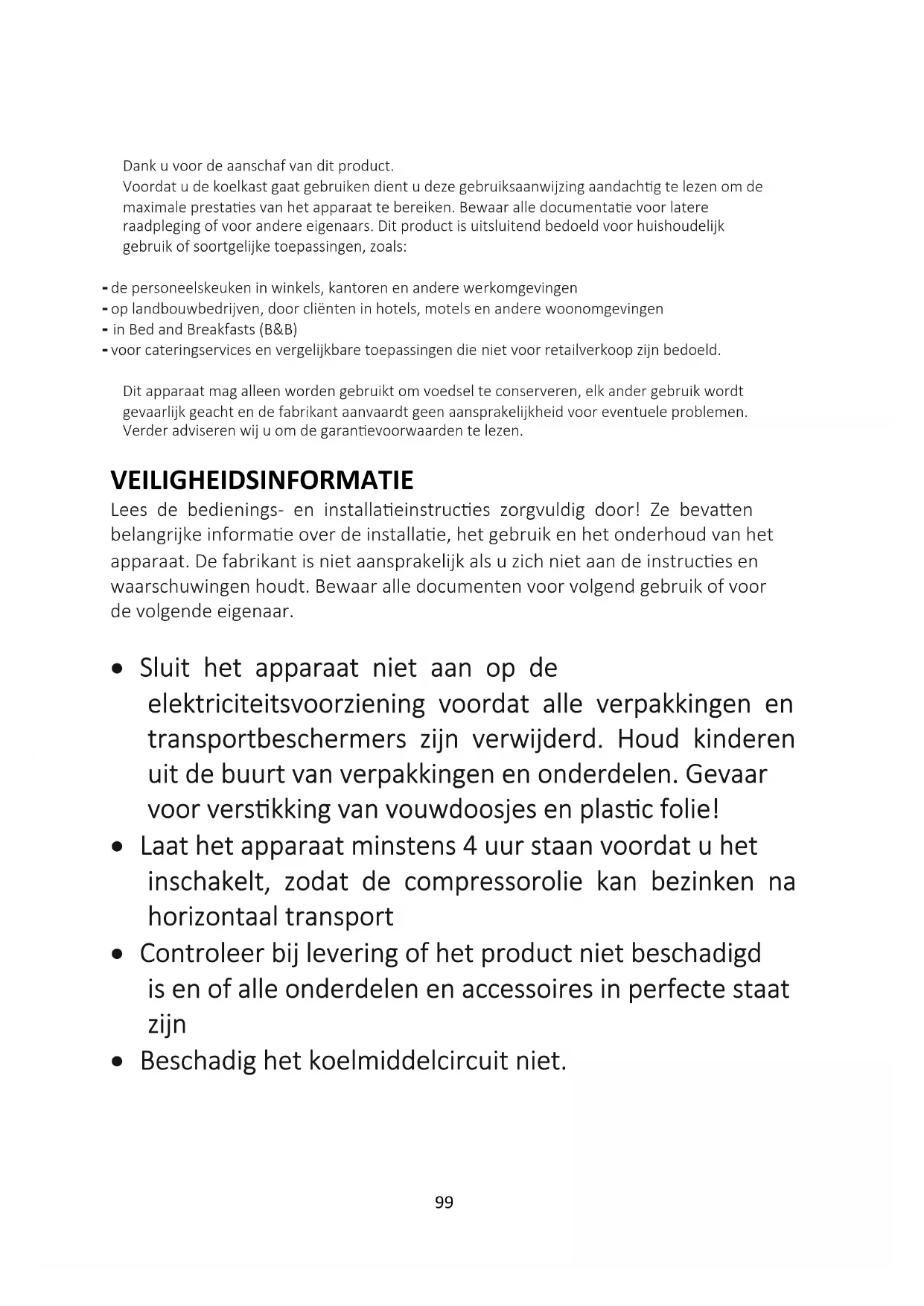 - De deur van het apparaat omkeren 9 Dank u voor de aanschaf van dit product. Voordat u de koelkast gaat gebruiken dient u deze gebruiksaanwijzing aandachtig te lezen om de maximale prestaties van het apparaat te bereiken. Bewaar alle documentatie voor latere raadpleging of voor andere eigenaars. Dit product is uitsluitend bedoeld voor huishoudelijk gebruik of soortgelijke toepassingen, zoals: - de personeelskeuken in winkels, kantoren en andere werkomgevingen - op landbouwbedrijven, door cliënten in hotels, motels en andere woonomgevingen - in Bed and Breakfasts (B&B) - voor cateringservices en vergelijkbare toepassingen die niet voor retailverkoop zijn bedoeld. Dit apparaat mag alleen worden gebruikt om voedsel te conserveren, elk ander gebruik wordt gevaarlijk geacht en de fabrikant aanvaardt geen aansprakelijkheid voor eventuele problemen. Verder adviseren wij u om de garantievoorwaarden te lezen. VEILIGHEIDSINFORMATIE Lees de bedienings- en installatieinstructies zorgvuldig door! Ze bevatten belangrijke informatie over de installatie, het gebruik en het onderhoud van het apparaat. De fabrikant is niet aansprakelijk als u zich niet aan de instructies en waarschuwingen houdt. Bewaar alle documenten voor volgend gebruik of voor de volgende eigenaar. Sluit het apparaat niet aan op de elektriciteitsvoorziening voordat alle verpakkingen en transportbeschermers zijn verwijderd. Houd kinderen uit de buurt van verpakkingen en onderdelen. Gevaar voor verstikking van vouwdoosjes en plastic folie! Laat het apparaat minstens 4 uur staan voordat u het inschakelt, zodat de compressorolie kan bezinken na horizontaal transport Controleer bij levering of het product niet beschadigd is en of alle onderdelen en accessoires in perfecte staat zijn Beschadig het koelmiddelcircuit niet.100 Zorg dat de ventilatieopeningen in de omkasting van het apparaat of in de inbouwconstructie nooit verstopt raken of afgedekt worden Gebruik nooit water om de compressor te wassen, veeg deze na het reinigen grondig schoon met een droge doek om roestvorming te voorkomen Verplaats het apparaat altijd met ten minste twee personen, het is namelijk zwaar. Installeer het apparaat waterpas op een plaats die geschikt is voor de grootte en het gebruik ervan. Controleer of de elektrische informatie op het typeplaatje overeenkomt met de stroomvoorziening. Als dat niet het geval is, neem dan contact op met een elektricien. Het apparaat wordt gebruikt met een voeding van 220- 240 VAC/50 Hz. Abnormale spanningsschommelingen kunnen ertoe leiden dat het apparaat niet start of dat de temperatuurregeling of de compressor beschadigd raakt of dat er tijdens het gebruik een abnormaal geluid optreedt. In dat geval moet er een automatische regelaar worden gemonteerd. Alleen voor Groot-Brittannië: Het netsnoer van het apparaat is voorzien van een 3-pins (geaarde) stekker die past op een standaard 3-pins (geaard) stopcontact. De derde pin (aarding) mag nooit worden afgesneden of gedemonteerd. Nadat het apparaat is geïnstalleerd, moet de stekker bereikbaar zijn.101 Zorg ervoor dat het netsnoer tijdens en na het dragen/verplaatsen van het apparaat niet onder het apparaat blijft vastzitten, om te voorkomen dat het netsnoer doorgesneden of beschadigd wordt. Als het netsnoer beschadigd is, moet het worden vervangen door de fabrikant, zijn servicevertegenwoordiger of andere bevoegde personen om gevaarlijke situaties te voorkomen Zet het apparaat niet op vochtige, olieachtige of stoffige plaatsen en stel het niet rechtstreeks bloot aan zonlicht en water Installeer het apparaat niet in de buurt van verwarmingen of ontvlambare materialen VOOR apparaten met een vriesvak: het deksel niet openen als er een stroomstoring is. Bevroren voedsel mag niet worden beïnvloed als de storing minder lang duurt dan de uren die op het etiket worden vermeld (Stijgtijd temperatuur). Als de storing langer duurt, moet het voedsel worden gecontroleerd en onmiddellijk worden geconsumeerd of bereid en daarna opnieuw ingevroren. Maakt u zich geen zorgen als het deksel van de diepvrieskist meteen nadat u hem heeft gesloten moeilijk te openen is. Dit komt door het drukverschil, dat gewoonlijk na enkele minuten verdwijnt waardoor het deksel gewoon kan worden geopend.102 Bewaar geen geneesmiddelen, bacteriën of chemische middelen in het apparaat. Dit apparaat is een huishoudelijk apparaat, het wordt niet aanbevolen om materialen op te slaan die strikte temperaturen vereisen. Trek niet aan het snoer en knik het niet; raak het niet met natte handen aan Bewaar geen producten die ontvlambare drijfgassen (bijv. spuitbussen) of explosieve stoffen bevatten in het apparaat. Risico op explosie! Plaats geen onstabiele voorwerpen (zware voorwerpen, containers gevuld met water) bovenop de koelkast, om persoonlijk letsel door vallen of elektrische schokken door contact met water te voorkomen. Gebruik geen elektrische apparaten in de bewaarvakken voor voedingsmiddelen van het apparaat, tenzij ze van het door de fabrikant aanbevolen type zijn Raak de interne koelelementen niet aan, vooral niet met natte handen, om scheuren of verwondingen te voorkomen Kinderen, mensen met beperkte lichamelijke, mentale of zintuiglijke vermogens, en mensen die onvoldoende kennis hebben over de veilige bediening van het apparaat lopen een groter risico. Controleer of kinderen en kwetsbare mensen de gevaren hebben103 begrepen. Een persoon die verantwoordelijk is voor de veiligheid moet toezicht houden op of instructies geven aan kinderen en kwetsbare personen die het apparaat gebruiken. Alleen kinderen van 8 jaar en ouder mogen het apparaat gebruiken. Kinderen mogen niet met het apparaat spelen Kinderen van 3 tot 8 jaar mogen dit apparaat in- en uitladen VOOR apparaten met een vriesvak: bewaar geen vloeistoffen in flessen of blik (vooral geen koolzuurhoudende dranken) in het vriesvak. Flessen en blikken kunnen barsten! VOOR apparaten met een vriesvak: plaats bevroren voedsel nooit rechtstreeks uit het vriesvak in
