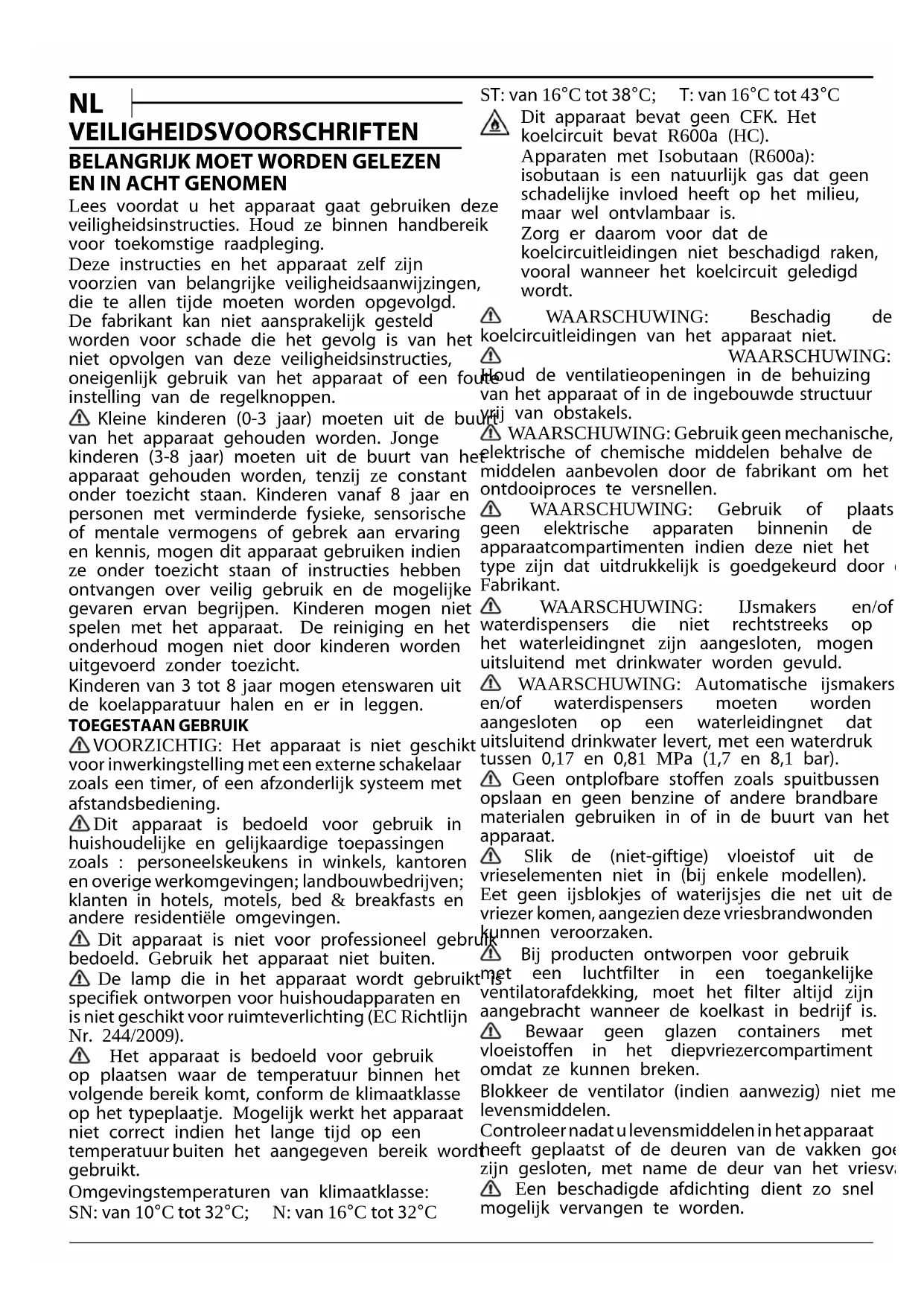 Lees voordat u het apparaat gaat gebruiken deze veiligheidsinstructies. Houd ze binnen handbereik voor toekomstige raadpleging. Deze instructies en het apparaat zelf zijn voorzien van belangrijke veiligheidsaanwijzingen, die te allen tijde moeten worden opgevolgd. De fabrikant kan niet aansprakelijk gesteld worden voor schade die het gevolg is van het niet opvolgen van deze veiligheidsinstructies, oneigenlijk gebruik van het apparaat of een foute instelling van de regelknoppen. Kleine kinderen (03 jaar) moeten uit de buurt van het apparaat gehouden worden. Jonge kinderen (38 jaar) moeten uit de buurt van het apparaat gehouden worden, tenzij ze constant onder toezicht staan. Kinderen vanaf 8 jaar en personen met verminderde fysieke, sensorische of mentale vermogens of gebrek aan ervaring en kennis, mogen dit apparaat gebruiken indien ze onder toezicht staan of instructies hebben ontvangen over veilig gebruik en de mogelijke gevaren ervan begrijpen. Kinderen mogen niet spelen met het apparaat. De reiniging en het onderhoud mogen niet door kinderen worden uitgevoerd zonder toezicht. Kinderen van 3 tot 8 jaar mogen etenswaren uit de koelapparatuur halen en er in leggen. TOEGESTAAN GEBRUIK VOORZICHTIG: Het apparaat is niet geschikt voor inwerkingstelling met een externe schakelaar zoals een timer, of een afzonderlijk systeem met afstandsbediening. Dit apparaat is bedoeld voor gebruik in huishoudelijke en gelijkaardige toepassingen zoals : personeelskeukens in winkels, kantoren en overige werkomgevingen; landbouwbedrijven; klanten in hotels, motels, bed & breakfasts en andere residentiële omgevingen. Dit apparaat is niet voor professioneel gebruik bedoeld. Gebruik het apparaat niet buiten. De lamp die in het apparaat wordt gebruikt is specifiek ontworpen voor huishoudapparaten en is niet geschikt voor ruimteverlichting (EC Richtlijn Nr. 244/2009). Het apparaat is bedoeld voor gebruik op plaatsen waar de temperatuur binnen het volgende bereik komt, conform de klimaatklasse op het typeplaatje. Mogelijk werkt het apparaat niet correct indien het lange tijd op een temperatuur buiten het aangegeven bereik wordt gebruikt. Omgevingstemperaturen van klimaatklasse: SN: van 10°C tot 32°C; N: van 16°C tot 32°C ST: van 16°C tot 38°C; T: van 16°C tot 43°C Dit apparaat bevat geen CFK. Het koelcircuit bevat R600a (HC). Apparaten met Isobutaan (R600a): isobutaan is een natuurlijk gas dat geen schadelijke invloed heeft op het milieu, maar wel ontvlambaar is. Zorg er daarom voor dat de koelcircuitleidingen niet beschadigd raken, vooral wanneer het koelcircuit geledigd wordt. WAARSCHUWING: Beschadig de koelcircuitleidingen van het apparaat niet. WAARSCHUWING: Houd de ventilatieopeningen in de behuizing van het apparaat of in de ingebouwde structuur vrij van obstakels. WAARSCHUWING: Gebruik geen mechanische, elektrische of chemische middelen behalve de middelen aanbevolen door de fabrikant om het ontdooiproces te versnellen. WAARSCHUWING: Gebruik of plaats geen elektrische apparaten binnenin de apparaatcompartimenten indien deze niet het type zijn dat uitdrukkelijk is goedgekeurd door de Fabrikant. WAARSCHUWING: IJsmakers en/of waterdispensers die niet rechtstreeks op het waterleidingnet zijn aangesloten, mogen uitsluitend met drinkwater worden gevuld. WAARSCHUWING: Automatische ijsmakers en/of waterdispensers moeten worden aangesloten op een waterleidingnet dat uitsluitend drinkwater levert, met een waterdruk tussen 0,17 en 0,81 MPa (1,7 en 8,1 bar). Geen ontplofbare stoffen zoals spuitbussen opslaan en geen benzine of andere brandbare materialen gebruiken in of in de buurt van het apparaat. Slik de (nietgiftige) vloeistof uit de vrieselementen niet in (bij enkele modellen). Eet geen ijsblokjes of waterijsjes die net uit de vriezer komen, aangezien deze vriesbrandwonden kunnen veroorzaken. Bij producten ontworpen voor gebruik met een luchtfilter in een toegankelijke ventilatorafdekking, moet het filter altijd zijn aangebracht wanneer de koelkast in bedrijf is. Bewaar geen glazen containers met vloeistoffen in het diepvriezercompartiment omdat ze kunnen breken. Blokkeer de ventilator (indien aanwezig) niet met levensmiddelen. Controleernadatulevensmiddeleninhetapparaat heeft geplaatst of de deuren van de vakken goed zijn gesloten, met name de deur van het vriesvak. Een beschadigde afdichting dient zo snel mogelijk vervangen te worden.Gebruik het koelkastcompartiment uitsluitend voor het bewaren van vers voedsel en het diepvriezercompartiment uitsluitend voor het bewaren van bevroren voedsel, het invriezen van vers voedsel en het maken van ijsblokjes. Vermijd het bewaren van onverpakt voedsel in direct contact met interne oppervlakken van de koelkast of diepvriezercompartimenten. Apparaten kunnen over speciale compartimenten beschikken (vak voor verse etenswaar, nul gradenvak,...). Indien niet anders gespecificeerd in de productbeschrijving, kunnen deze compartimenten verwijderd worden zonder dat hierdoor de prestaties veranderen. Cpentaan wordt gebruikt als blaasmiddel in het isolatieschuim en is een licht ontvlambaar gas. Rekening houdend met de temperatuursverschillen in de verschillende koelkastcompartimenten, kunnen etenswaren het beste als volgt worden bewaard: Koelkastcompartiment: