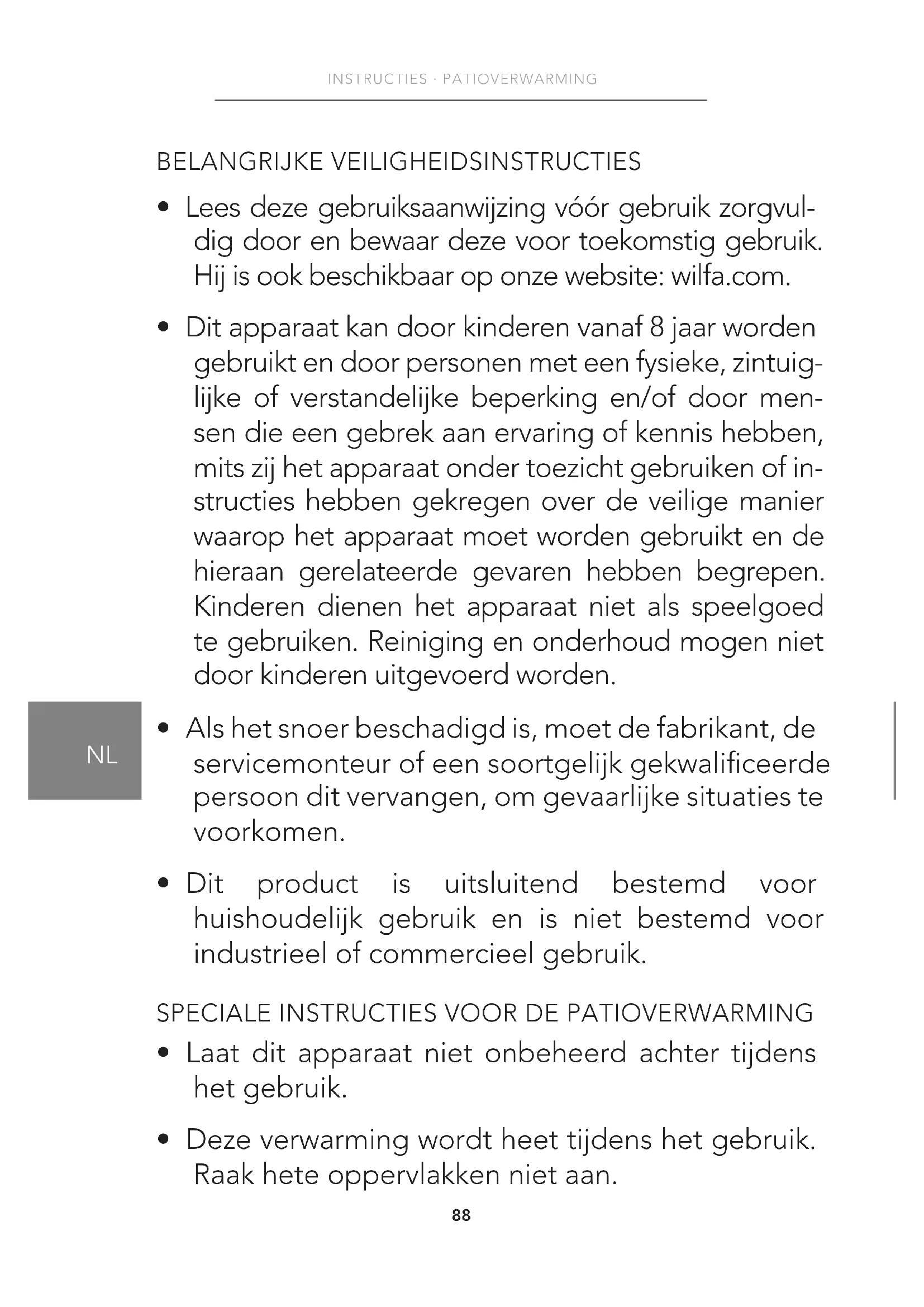 INSTRUCTIES · PATIOVERWARMING GARANTIE Wilfa biedt voor dit product een garantie van 5 jaar. Deze periode start op de dag van de aankoop. De garantie dekt storingen of defecten die tijdens de garantieperiode in het product optreden. Uw aankoopbon is uw garantiebewijs voor de verkoper als u aanspraak maakt op de garantie. De garantie is uitsluitend geldig voor producten die voor huishoudelijke toepassing gekocht en gebruikt werden. De garantie is niet geldig als het product voor commerciële doeleinden gebruikt wordt. De garantie is niet geldig als het product onjuist of nalatig gebruikt werd, als de Wilfa-instructies niet opgevolgd zijn, als het apparaat gewijzigd of een onbevoegde reparatie uitgevoerd werd. De garantie is ook niet geldig voor normale slijtage van het product, verkeerd gebruik, gebrekkig onderhoud, gebruik van onjuiste elektrische spanning, of: