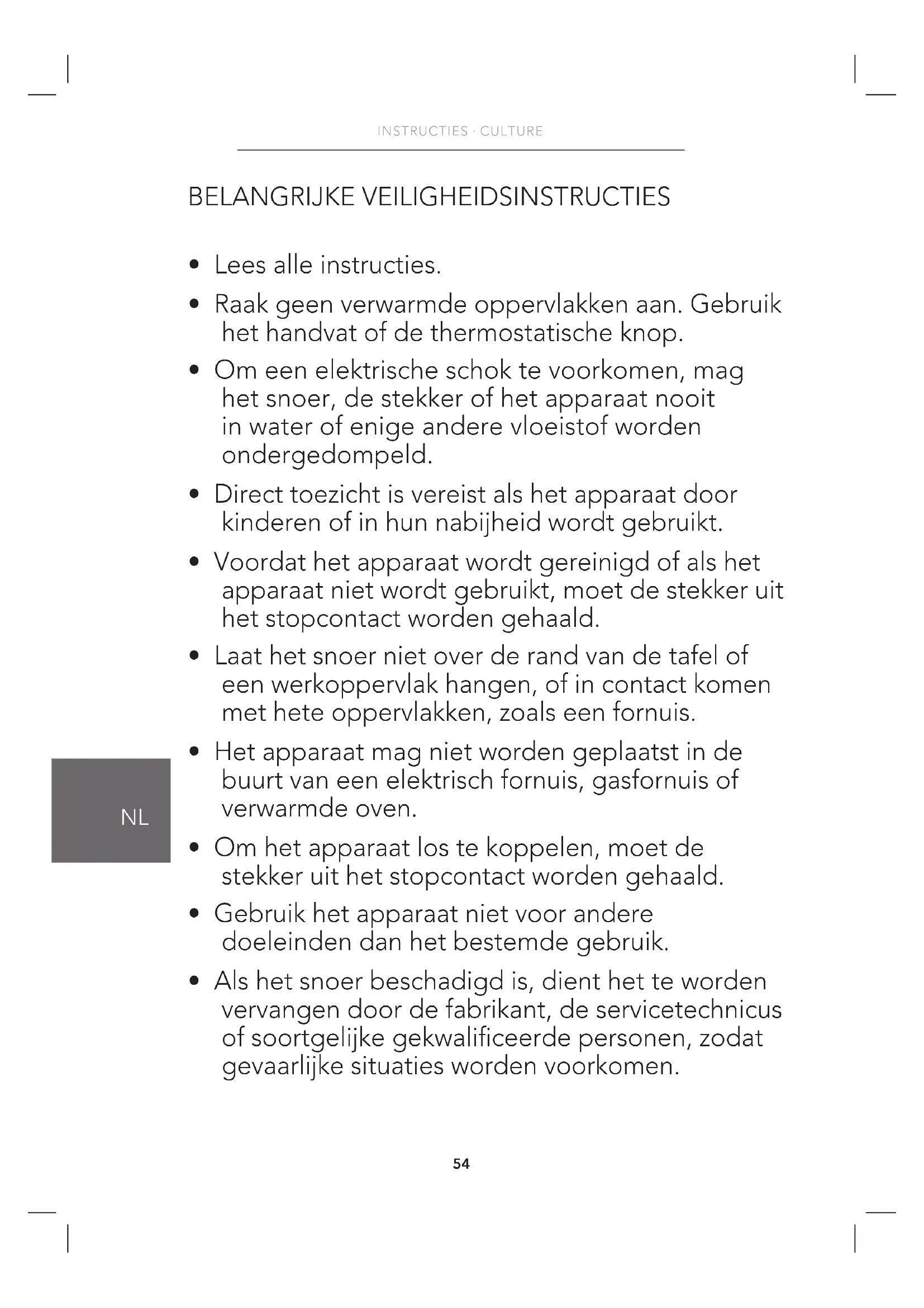 - Het apparaat heeft een kort snoer, omdat bij gebruik van een langer snoer het risico bestaat dat u daarin verstrikt raakt of erover struikelt. Het zorgvuldig gebruik van een verlengsnoer is toegestaan. De elektrische classificatie van dit verlengsnoer moet echter minimaal overeenkomen met die van het apparaat zelf. Het verlengsnoer moet zo worden gebruikt dat het niet over het werkoppervlak of de tafel hangt, zodat kinderen niet aan het snoer kunnen trekken of erover kunnen struikelen. De elektrische classificatie van dit apparaat staat op het typeplaatje van het apparaat.56 INSTRUCTIES · CULTURE