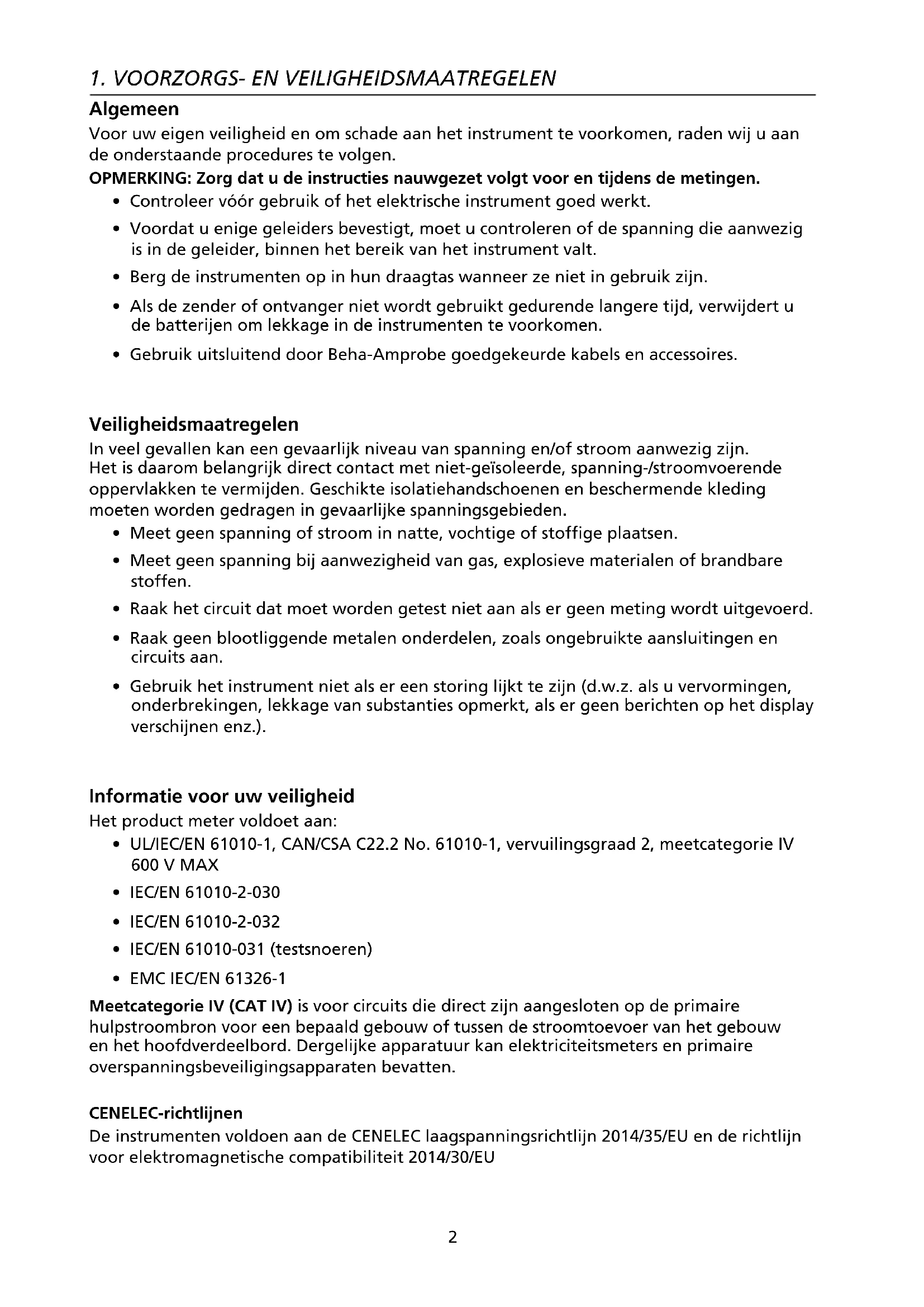 - Gebruik uitsluitend door Beha-Amprobe goedgekeurde kabels en accessoires. Veiligheidsmaatregelen In veel gevallen kan een gevaarlijk niveau van spanning en/of stroom aanwezig zijn. Het is daarom belangrijk direct contact met niet-geïsoleerde, spanning-/stroomvoerende oppervlakken te vermijden. Geschikte isolatiehandschoenen en beschermende kleding moeten worden gedragen in gevaarlijke spanningsgebieden.