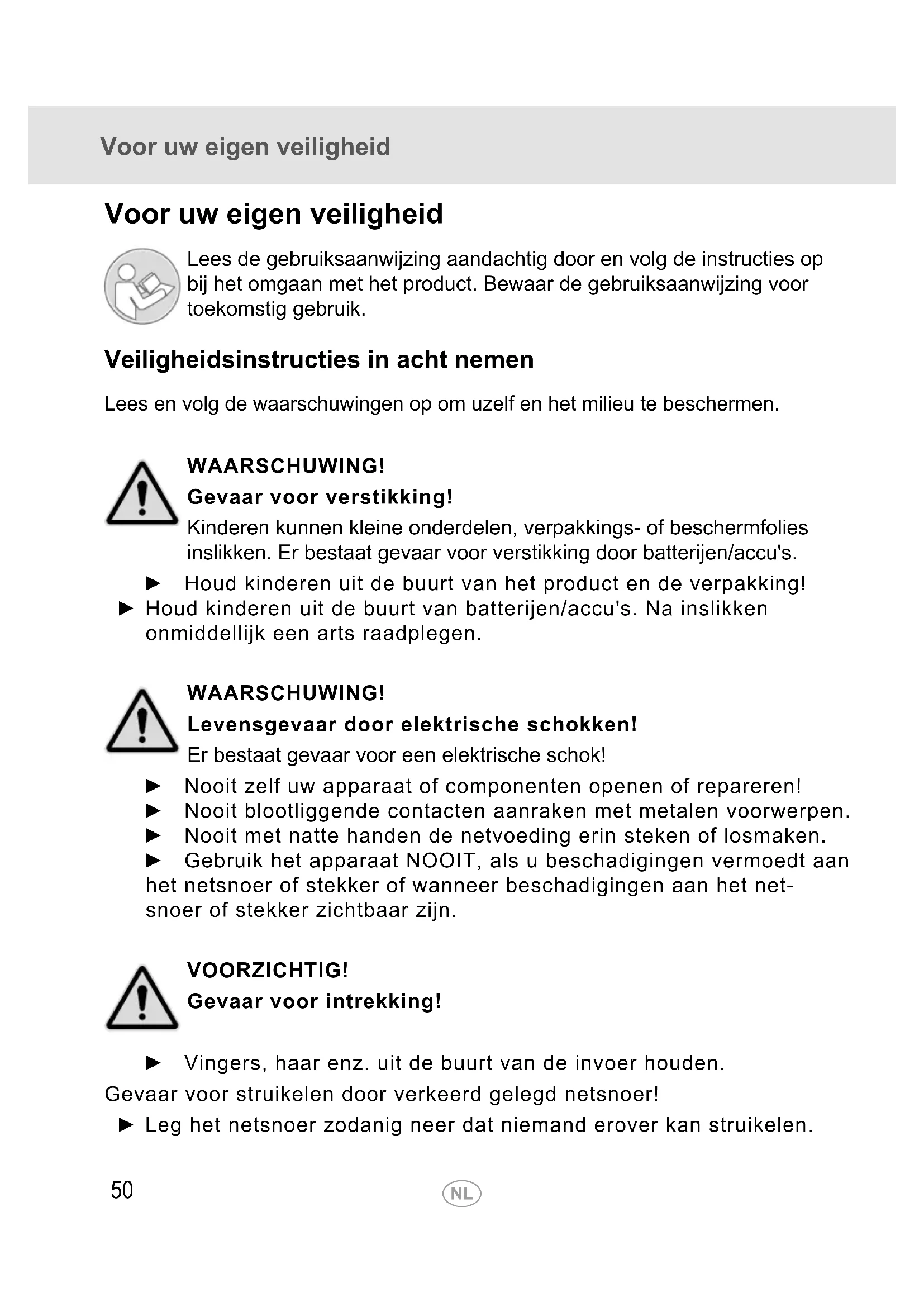 Voor uw eigen veiligheid Lees de gebruiksaanwijzing aandachtig door en volg de instructies op bij het omgaan met het product. Bewaar de gebruiksaanwijzing voor toekomstig gebruik. Veiligheidsinstructies in acht nemen Lees en volg de waarschuwingen op om uzelf en het milieu te beschermen. WAARSCHUWING! Gevaar voor verstikking! Kinderen kunnen kleine onderdelen, verpakkings- of beschermfolies inslikken. Er bestaat gevaar voor verstikking door batterijen/accu's. ► Houd kinderen uit de buurt van het product en de verpakking! ► Houd kinderen uit de buurt van batterijen/accu's. Na inslikken onmiddellijk een arts raadplegen. WAARSCHUWING! Levensgevaar door elektrische schokken! Er bestaat gevaar voor een elektrische schok! ► Nooit zelf uw apparaat of componenten openen of repareren! ► Nooit blootliggende contacten aanraken met metalen voorwerpen. ► Nooit met natte handen de netvoeding erin steken of losmaken. ► Gebruik het apparaat NOOIT, als u beschadigingen vermoedt aan het netsnoer of stekker of wanneer beschadigingen aan het net- snoer of stekker zichtbaar zijn. VOORZICHTIG! Gevaar voor intrekking! ► Vingers, haar enz. uit de buurt van de invoer houden. Gevaar voor struikelen door verkeerd gelegd netsnoer! ► Leg het netsnoer zodanig neer dat niemand erover kan struikelen.Voor uw eigen veiligheid