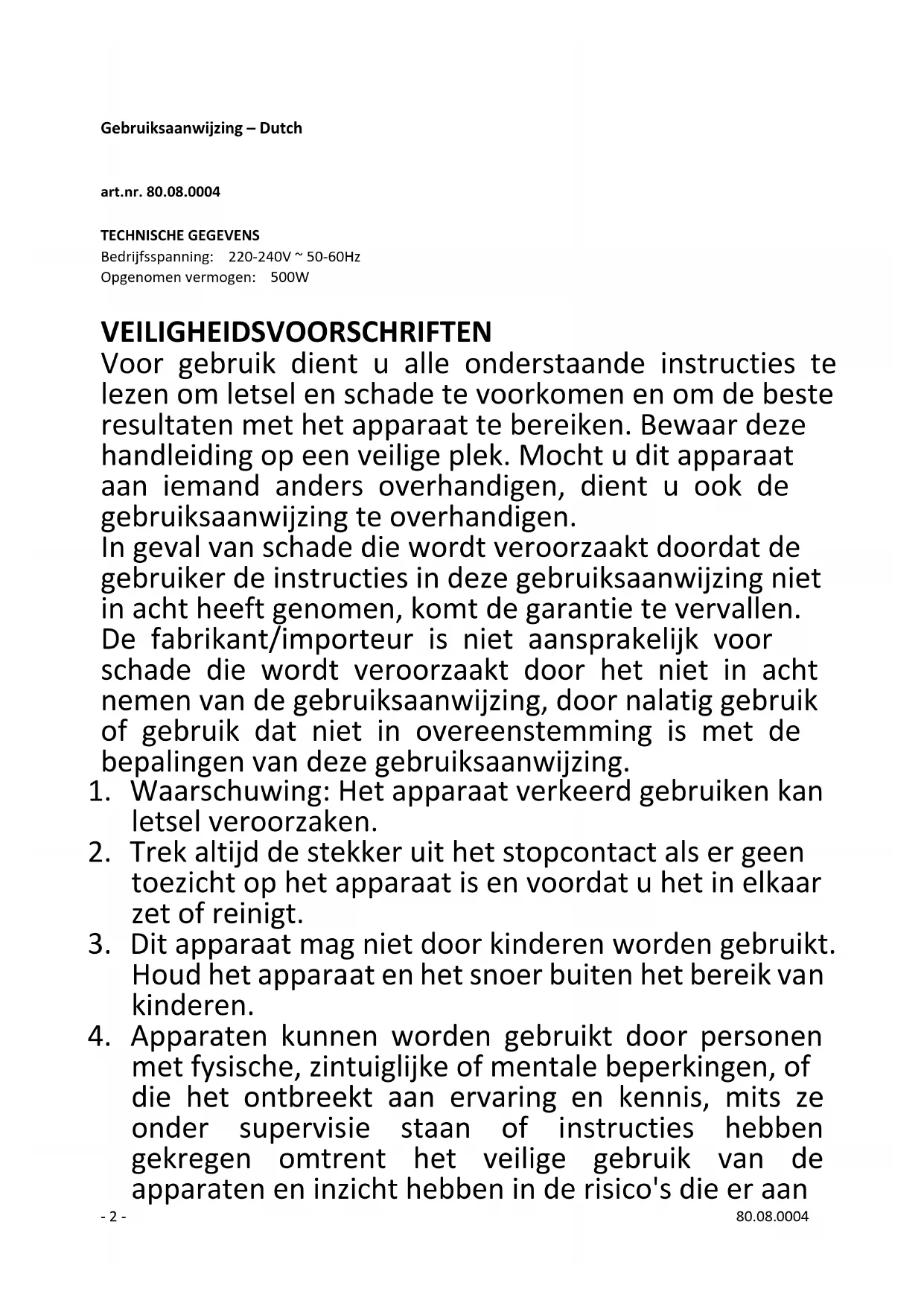 - 1 - 80.08.0004 Inhoud – Teneur – Content –Inhalt – Contenido Gebruiksaanwijzing – Dutch ....................................................................................... - 2 - Mode d’emploi – French ............................................................................................ - 9 - Instruction manual – English .................................................................................... - 16 - Bedienungsanleitung – German ............................................................................... - 23 - Manual de instrucciones – Spanish .......................................................................... - 30 -- 2 - 80.08.0004 Gebruiksaanwijzing – Dutch art.nr. 80.08.0004 TECHNISCHE GEGEVENS Bedrijfsspanning: 220-240V ~ 50-60Hz Opgenomen vermogen: 500W VEILIGHEIDSVOORSCHRIFTEN Voor gebruik dient u alle onderstaande instructies te lezen om letsel en schade te voorkomen en om de beste resultaten met het apparaat te bereiken. Bewaar deze handleiding op een veilige plek. Mocht u dit apparaat aan iemand anders overhandigen, dient u ook de gebruiksaanwijzing te overhandigen. In geval van schade die wordt veroorzaakt doordat de gebruiker de instructies in deze gebruiksaanwijzing niet in acht heeft genomen, komt de garantie te vervallen. De fabrikant/importeur is niet aansprakelijk voor schade die wordt veroorzaakt door het niet in acht nemen van de gebruiksaanwijzing, door nalatig gebruik of gebruik dat niet in overeenstemming is met de bepalingen van deze gebruiksaanwijzing.