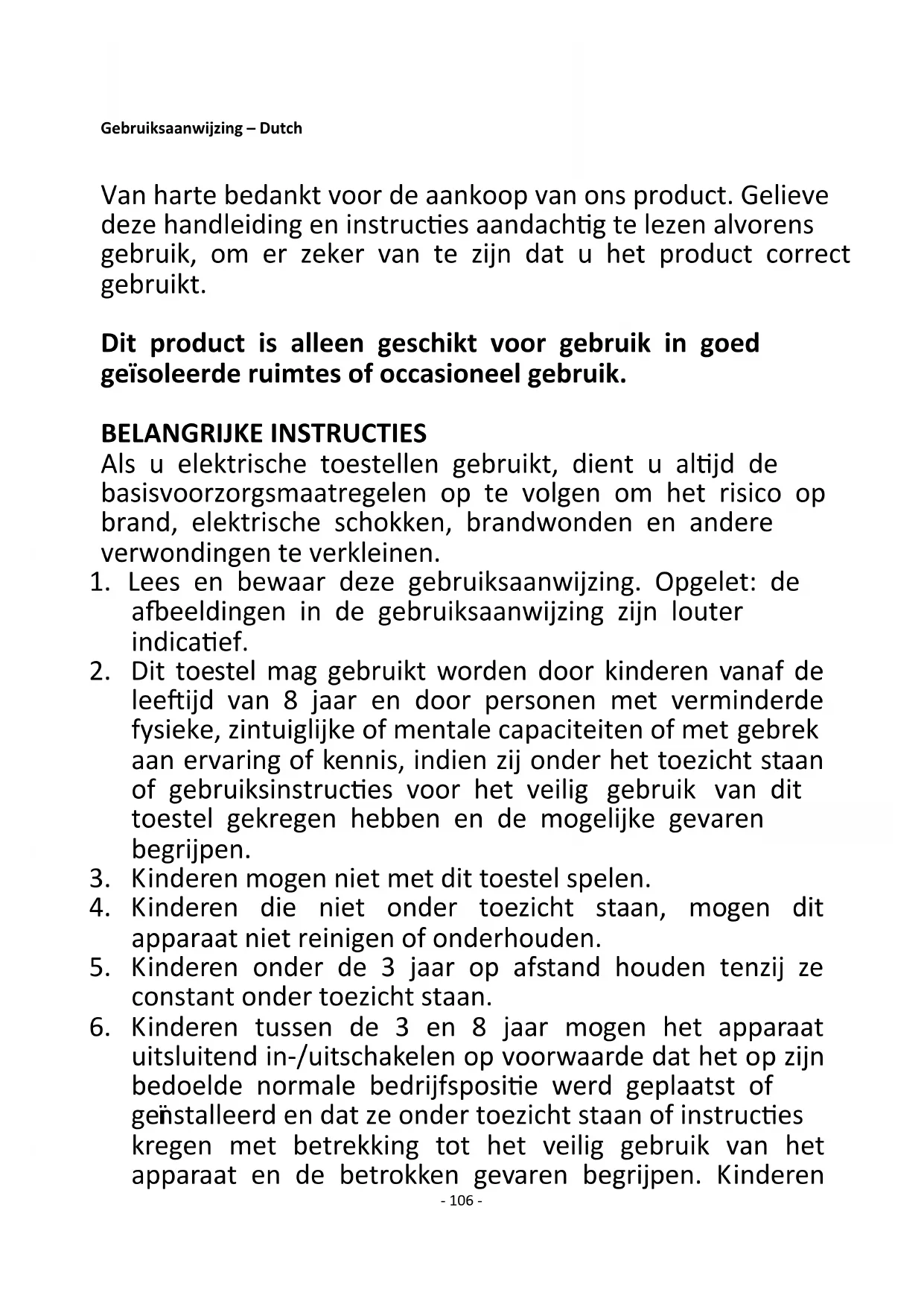 leeftijd van 8 jaar en door personen met verminderde fysieke, zintuiglijke of mentale capaciteiten of met gebrek aan ervaring of kennis, indien zij onder het toezicht staan of gebruiksinstructies voor het veilig gebruik van dit toestel gekregen hebben en de mogelijke gevaren begrijpen.