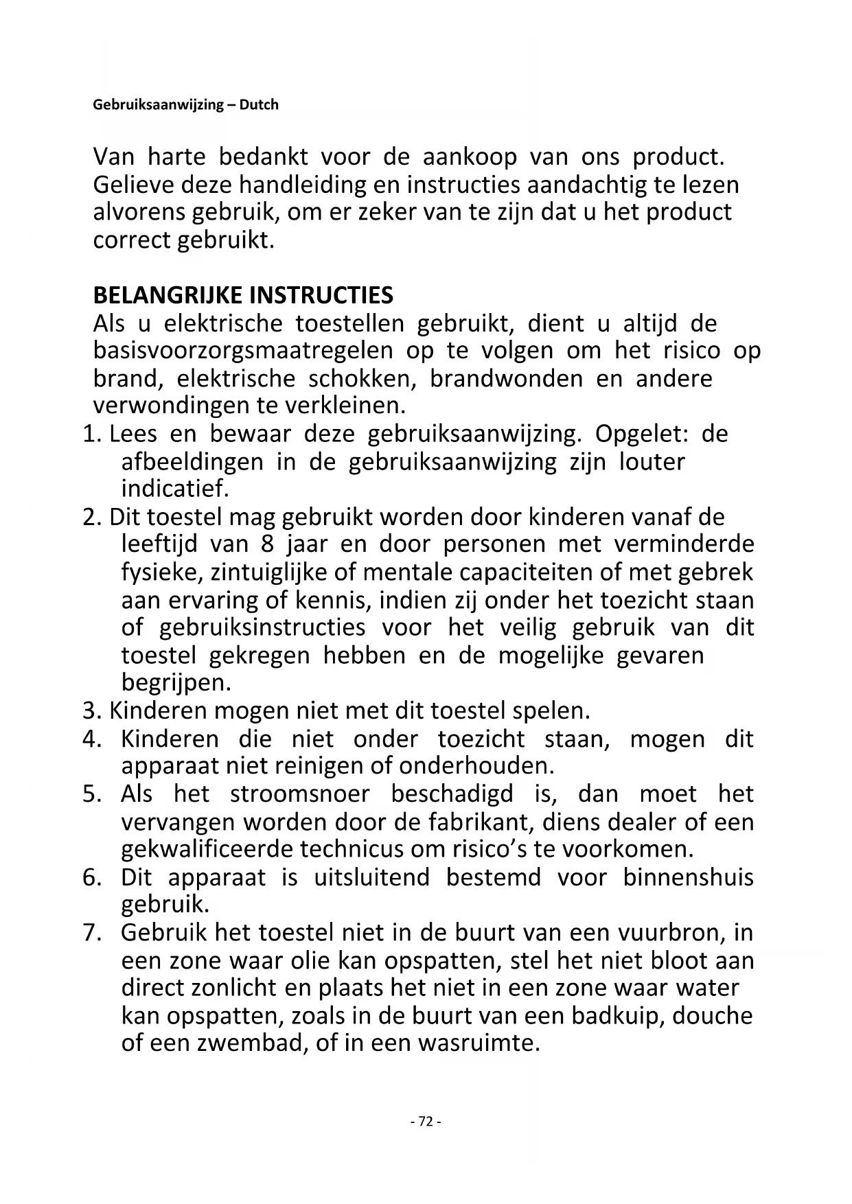 leeftijd van 8 jaar en door personen met verminderde fysieke, zintuiglijke of mentale capaciteiten of met gebrek aan ervaring of kennis, indien zij onder het toezicht staan of gebruiksinstructies voor het veilig gebruik van dit toestel gekregen hebben en de mogelijke gevaren begrijpen.