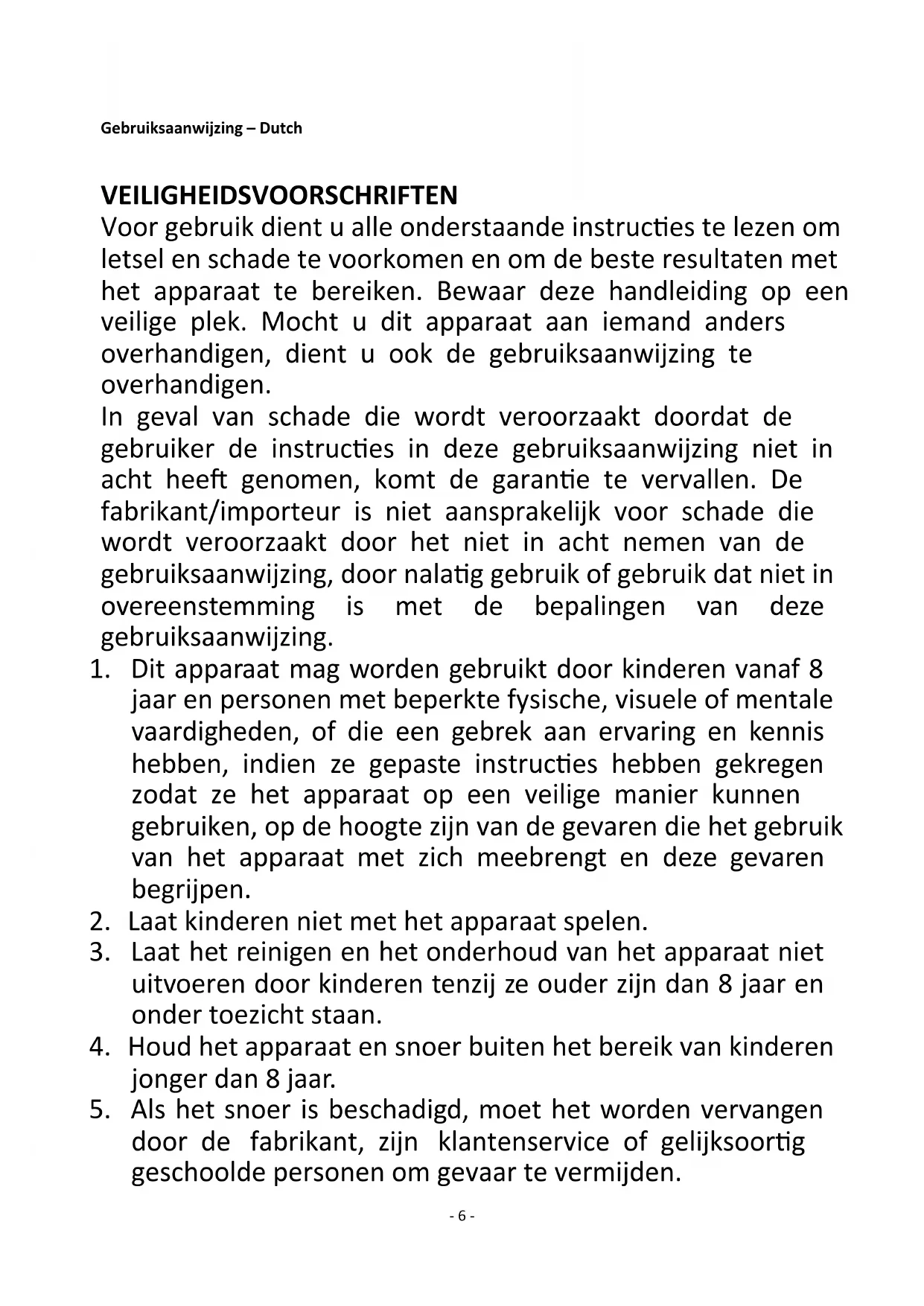 - Dit apparaat mag worden gebruikt door kinderen vanaf 8aar en personen met beperkte fysische, visuele of mentalevaardigheden, of die een gebrek aan ervaring en kennis hebben, indien ze gespaste instructies hebben gekregenzodat ze het apparaat op een veilige manier+kennengebruiken, op de hoogte+zijn van de gevaren die het gebruik van het apparaat met zich meebrengt en deze gevarenbegrijpen.