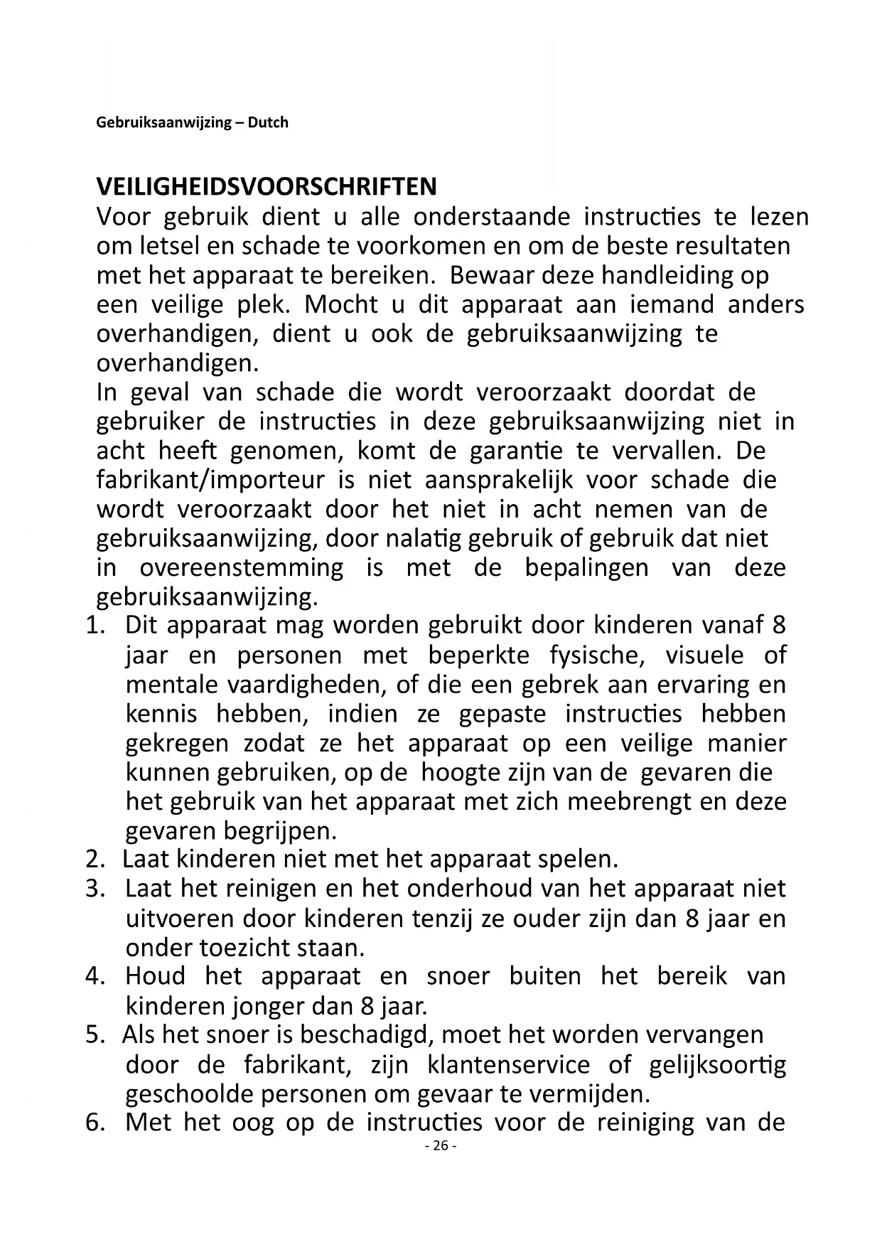 Återvinning - EU-direktiv 2012/19/EU Denna markering indikerar att produkten inte får kastas tillsammans med övrigt hushållsavfall. För att förhindra eventuell skada på miljön eller människors hälsa på grund av okontrollerad avfallshantering, återvinns de på ett ansvarsfullt sätt som främjar en hållbar återanvändning av materiella resurser. För att återlämna den använda enheten, använd retur- och insamlingssystem eller kontakta återförsäljaren där produkten var köpt. De kan ta denna produkt för miljösäker återvinning. Emerio Holland B.V. Zomervaart 1A 2033 DA Haarlem The Netherlands Kundservice: T: +31(0)23 3034369 E: info.nl@emerio.eu- 26 - Gebruiksaanwijzing – Dutch VEILIGHEIDSVOORSCHRIFTEN Voor gebruik dient u alle onderstaande instructies te lezen om letsel en schade te voorkomen en om de beste resultaten met het apparaat te bereiken. Bewaar deze handleiding op een veilige plek. Mocht u dit apparaat aan iemand anders overhandigen, dient u ook de gebruiksaanwijzing te overhandigen. In geval van schade die wordt veroorzaakt doordat de gebruiker de instructies in deze gebruiksaanwijzing niet in acht heeft genomen, komt de garantie te vervallen. De fabrikant/importeur is niet aansprakelijk voor schade die wordt veroorzaakt door het niet in acht nemen van de gebruiksaanwijzing, door nalatig gebruik of gebruik dat niet in overeenstemming is met de bepalingen van deze gebruiksaanwijzing.