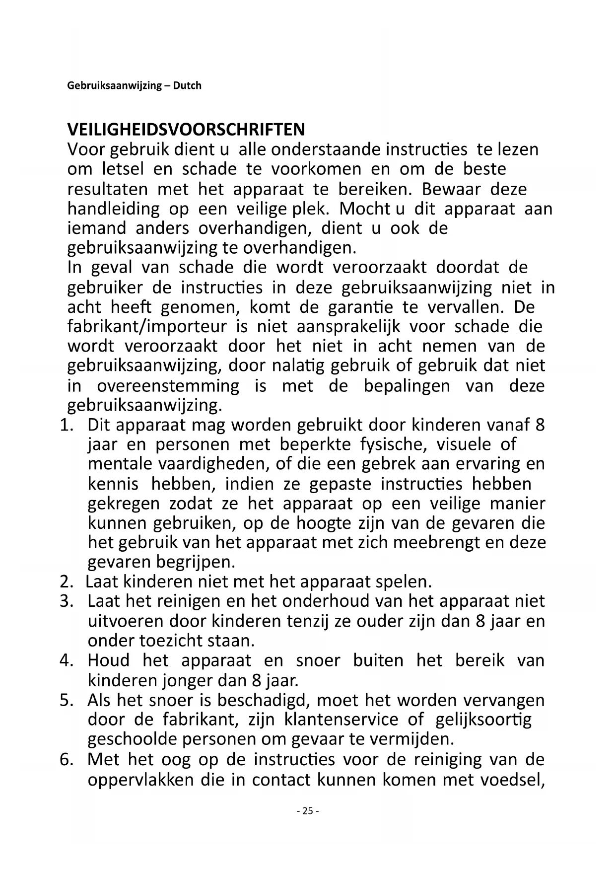 Återvinning - EU-direktiv 2012/19/EU Denna markering indikerar att produkten inte får kastas tillsammans med övrigt hushållsavfall. För att förhindra eventuell skada på miljön eller människors hälsa på grund av okontrollerad avfallshantering, återvinns de på ett ansvarsfullt sätt som främjar en hållbar återanvändning av materiella resurser. För att återlämna den använda enheten, använd retur- och insamlingssystem eller kontakta återförsäljaren där produkten var köpt. De kan ta denna produkt för miljösäker återvinning. Emerio Deutschland GmbH (no service address) Lerchenweg 3 40789 Monheim am Rhein Deutschland Kundservice: T: +49 (0) 3222 1097 600 E: info.de@emerio.eu- 25 - Gebruiksaanwijzing – Dutch VEILIGHEIDSVOORSCHRIFTEN Voor gebruik dient u alle onderstaande instructies te lezen om letsel en schade te voorkomen en om de beste resultaten met het apparaat te bereiken. Bewaar deze handleiding op een veilige plek. Mocht u dit apparaat aan iemand anders overhandigen, dient u ook de gebruiksaanwijzing te overhandigen. In geval van schade die wordt veroorzaakt doordat de gebruiker de instructies in deze gebruiksaanwijzing niet in acht heeft genomen, komt de garantie te vervallen. De fabrikant/importeur is niet aansprakelijk voor schade die wordt veroorzaakt door het niet in acht nemen van de gebruiksaanwijzing, door nalatig gebruik of gebruik dat niet in overeenstemming is met de bepalingen van deze gebruiksaanwijzing.