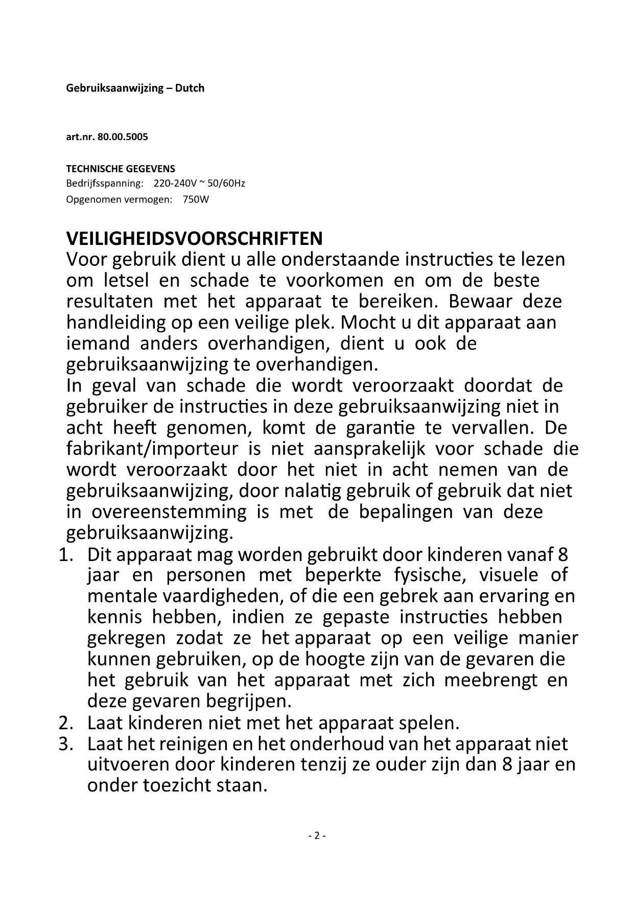 Gebruiksaanwijzing – Dutch ......................................................................................... - 2 - Mode d‘emploi – French .............................................................................................. - 8 - Instruction manual – English ...................................................................................... - 14 - Bedienungsanleitung – German ................................................................................. - 20 - Manual de Instrucciones – Spanish ............................................................................ - 26 -- 2 - Gebruiksaanwijzing – Dutch art.nr. 80.00.5005 TECHNISCHE GEGEVENS Bedrijfsspanning: 220-240V ~ 50/60Hz Opgenomen vermogen: 750W VEILIGHEIDSVOORSCHRIFTEN Voor gebruik dient u alle onderstaande instructies te lezen om letsel en schade te voorkomen en om de beste resultaten met het apparaat te bereiken. Bewaar deze handleiding op een veilige plek. Mocht u dit apparaat aan iemand anders overhandigen, dient u ook de gebruiksaanwijzing te overhandigen. In geval van schade die wordt veroorzaakt doordat de gebruiker de instructies in deze gebruiksaanwijzing niet in acht heeft genomen, komt de garantie te vervallen. De fabrikant/importeur is niet aansprakelijk voor schade die wordt veroorzaakt door het niet in acht nemen van de gebruiksaanwijzing, door nalatig gebruik of gebruik dat niet in overeenstemming is met de bepalingen van deze gebruiksaanwijzing.