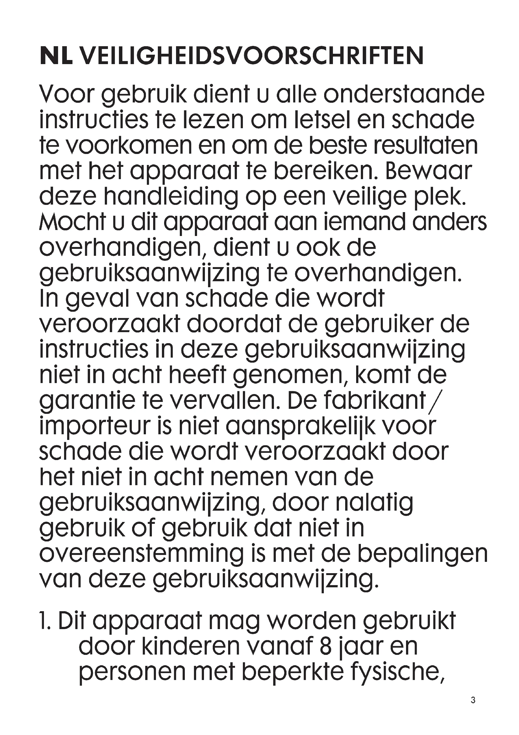Gebruiksaanwijzing haardroger Mode d’emploi sèche-cheveux Instruction manual hair dryer Bedienungsanleitung Haartrockner Manual de instrucciones secador de pelo3 NL VEILIGHEIDSVOORSCHRIFTEN Voor gebruik dient u alle onderstaande instructies te lezen om letsel en schade te voorkomen en om de beste resultaten met het apparaat te bereiken. Bewaar deze handleiding op een veilige plek. Mocht u dit apparaat aan iemand anders overhandigen, dient u ook de gebruiksaanwijzing te overhandigen. In geval van schade die wordt veroorzaakt doordat de gebruiker de instructies in deze gebruiksaanwijzing niet in acht heeft genomen, komt de garantie te vervallen. De fabrikant / importeur is niet aansprakelijk voor schade die wordt veroorzaakt door het niet in acht nemen van de gebruiksaanwijzing, door nalatig gebruik of gebruik dat niet in overeenstemming is met de bepalingen van deze gebruiksaanwijzing.