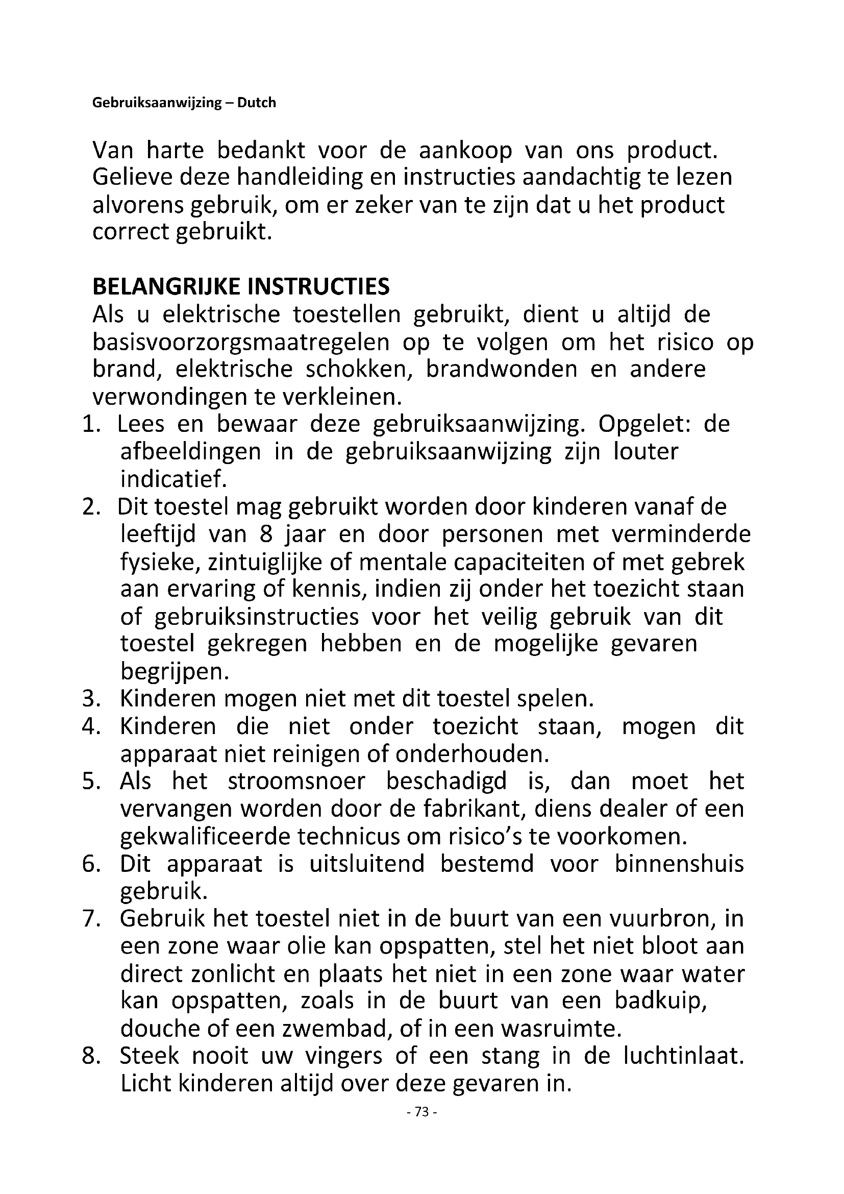 leeftijd van 8 jaar en door personen met verminderde fysieke, zintuiglijke of mentale capaciteiten of met gebrek aan ervaring of kennis, indien zij onder het toezicht staan of gebruiksinstructies voor het veilig gebruik van dit toestel gekregen hebben en de mogelijke gevaren begrijpen.