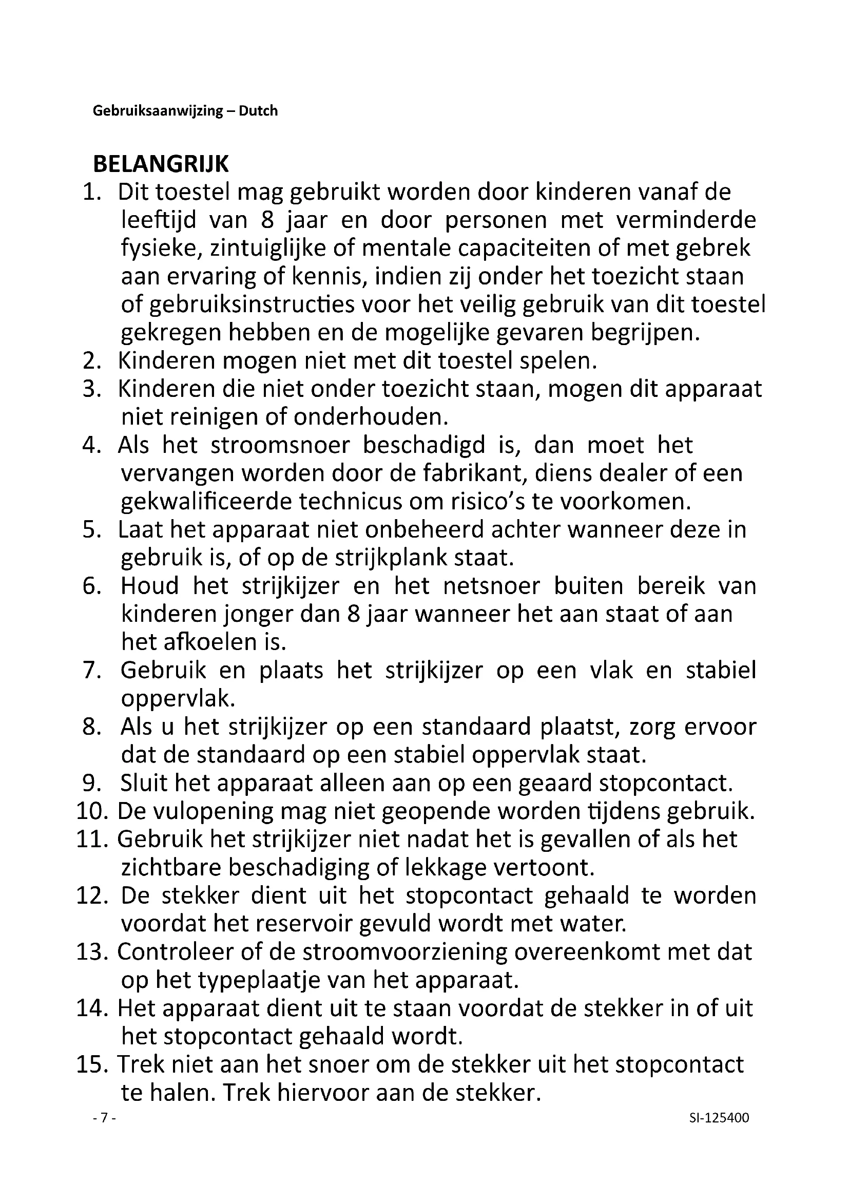 DROOGSTRIJKEN Steek de stekker van het strijkijzer in een geschikt stopcontact. Zorg ervoor dat de regelingsknop voor de stoom op positie “O“ staat. Selecteer een instelling op de temperatuurregelaar. Als het indicatielampje uitdooft, is de vereiste temperatuur bereikt. Het strijkijzer is nu klaar voor gebruik. Om het strijkijzer uit te schakelen, draai de temperatuurregelaar tegen de klok in naar de “MIN” positie, zet het strijkijzer rechtop, en neem de stekker uit het stopcontact. STOOMSTRIJKEN Vul de watertank, zoals beschreven onder “vóór ingebruikname”. Stoomstrijken kan gebruikt worden in de temperatuurbereiken ●, ●●, met ●●● MAX. De watertank dient tenminste voor 1/4 gevuld te zijn, om de stoomfunctie naar behoren te laten werken. Spuitfunctie: Druk op de spuitknop om een te strijken plaats op het kledingsstuk nat te maken. Er zal water uit de spuitmond komen. Stoomfunctie: Draai de regelingsknop voor de stoom naar de vereiste positie, en er zal stoom uit de openingen van de zoolplaat komen. Stoomstoot: Draai de temperatuurregelaar naar de “MAX” positie. Het indicatielampje zal uitdoven, als de vereiste temperatuur bereikt is. Druk vervolgens op de stoomstootknop. Deze functie voorziet een extra hoeveelheid stoom, zodat hardnekkige plooien ook verwijderd kunnen worden.- 11 - SI-125400 Voor een optimaal gebruik, laat het apparaat rusten gedurende 3 - 5 seconden tussen elke keer drukken. "Stoomstoot" kan ook worden toegepast bij het strijken in verticale positie, wat handig is voor het verwijderen van kreukels uit hangende kleding, gordijnen, enz. Het strijkijzer dient altijd rechtop gehouden te worden. Om het strijkijzer uit te schakelen, draai de temperatuurregelaar tegen de klok in naar de “OFF” positie en neem de stekker uit het stopcontact. Keer het strijkijzer om en giet het resterende water voorzichtig uit de watertank. Wees voorzichtig bij het schudden van het strijkijzer. Druk op de spuitknop om het resterende water gemakkelijker uit het strijkijzer te halen. Opmerking: Bij het gewoon stoomstrijken, kan het zijn dat er water uit de zoolplaat lekt, als er een te lage temperatuur geselecteerd is. Indien dit gebeurt, draai de temperatuurregelaar naar de aangeraden positie. Het stomen zal hervatten, als de geschikte temperatuur bereikt is. ZELFREINIGINGSFUNCTIE U kunt de zelfreinigingsfunctie gebruiken om kalk en vuiligheid te verwijderen. Gebruik de zelfreinigingsfunctie minstens eenmaal per maand. Als het water in uw gemeente zeer hard is, gebruik de zelfreinigingsfunctie om de twee weken. Neem de stekker van het strijkijzer uit het stopcontact. Draai de regelingsknop voor de stoom naar de “O“ positie. Vul de watertank tot aan het maximum niveau. Selecteer de maximum strijktemperatuur. Steek de stekker in het stopcontact. Neem de stekker uit het stopcontact, als het temperatuurindicatielampje dooft. Hou het strijkijzer boven een gootsteen, houd de zelfreinigingsknop ingedrukt en beweeg het strijkijzer voorzichtig heen en weer. (Er zal stoom en kokend water uit de openingen van de zoolplaat komen. Vuiligheid en kalkstukjes (indien die er zijn) zullen samen met het water uitgespoeld worden). Laat de zelfreinigingsknop los, zodra er geen water meer is in de tank. Herhaal het zelfreinigingsproces, als het strijkijzer nog steeds veel vuiligheid bevat.