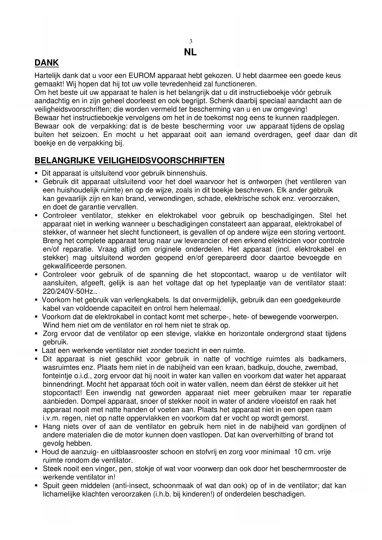 DANK Hartelijk dank dat u voor een EUROM apparaat hebt gekozen. U hebt daarmee een goede keus gemaakt! Wij hopen dat hij tot uw volle tevredenheid zal functioneren. Om het beste uit uw apparaat te halen is het belangrijk dat u dit instructieboekje vóór gebruik aandachtig en in zijn geheel doorleest en ook begrijpt. Schenk daarbij speciaal aandacht aan de veiligheidsvoorschriften; die worden vermeld ter bescherming van u en uw omgeving! Bewaar het instructieboekje vervolgens om het in de toekomst nog eens te kunnen raadplegen. Bewaar ook de verpakking: dat is de beste bescherming voor uw apparaat tijdens de opslag buiten het seizoen. En mocht u het apparaat ooit aan iemand overdragen, geef daar dan dit boekje en de verpakking bij. BELANGRIJKE VEILIGHEIDSVOORSCHRIFTEN Dit apparaat is uitsluitend voor gebruik binnenshuis. Gebruik dit apparaat uitsluitend voor het doel waarvoor het is ontworpen (het ventileren van een huishoudelijk ruimte) en op de wijze, zoals in dit boekje beschreven. Elk ander gebruik kan gevaarlijk zijn en kan brand, verwondingen, schade, elektrische schok enz. veroorzaken, en doet de garantie vervallen. Controleer ventilator, stekker en elektrokabel voor gebruik op beschadigingen. Stel het apparaat niet in werking wanneer u beschadigingen constateert aan apparaat, elektrokabel of stekker, of wanneer het slecht functioneert, is gevallen of op andere wijze een storing vertoont. Breng het complete apparaat terug naar uw leverancier of een erkend elektricien voor controle en/of reparatie. Vraag altijd om originele onderdelen. Het apparaat (incl. elektrokabel en stekker) mag uitsluitend worden geopend en/of gerepareerd door daartoe bevoegde en gekwalificeerde personen. Controleer voor gebruik of de spanning die het stopcontact, waarop u de ventilator wilt aansluiten, afgeeft, gelijk is aan het voltage dat op het typeplaatje van de ventilator staat: 220/240V-50Hz.. Voorkom het gebruik van verlengkabels. Is dat onvermijdelijk, gebruik dan een goedgekeurde kabel van voldoende capaciteit en ontrol hem helemaal. Voorkom dat de elektrokabel in contact komt met scherpe-, hete- of bewegende voorwerpen. Wind hem niet om de ventilator en rol hem niet te strak op. Zorg ervoor dat de ventilator op een stevige, vlakke en horizontale ondergrond staat tijdens gebruik. Laat een werkende ventilator niet zonder toezicht in een ruimte. Dit apparaat is niet geschikt voor gebruik in natte of vochtige ruimtes als badkamers, wasruimtes enz. Plaats hem niet in de nabijheid van een kraan, badkuip, douche, zwembad, fonteintje o.i.d., zorg ervoor dat hij nooit in water kan vallen en voorkom dat water het apparaat binnendringt. Mocht het apparaat tóch ooit in water vallen, neem dan éérst de stekker uit het stopcontact! Een inwendig nat geworden apparaat niet meer gebruiken maar ter reparatie aanbieden. Dompel apparaat, snoer of stekker nooit in water of andere vloeistof en raak het apparaat nooit met natte handen of voeten aan. Plaats het apparaat niet in een open raam i.v.m. regen, niet op natte oppervlakken en voorkom dat er vocht op wordt gemorst. Hang niets over of aan de ventilator en gebruik hem niet in de nabijheid van gordijnen of andere materialen die de motor kunnen doen vastlopen. Dat kan oververhitting of brand tot gevolg hebben. Houd de aanzuig- en uitblaasrooster schoon en stofvrij en zorg voor minimaal 10 cm. vrije ruimte rondom de ventilator. Steek nooit een vinger, pen, stokje of wat voor voorwerp dan ook door het beschermrooster de werkende ventilator in! Spuit geen middelen (anti-insect, schoonmaak of wat dan ook) op of in de ventilator; dat kan lichamelijke klachten veroorzaken (i.h.b. bij kinderen!) of onderdelen beschadigen.4 Bewaar of gebruik het apparaat niet: - Op plaatsen waar het nat kan worden of in water kan vallen - In de buurt van licht-ontvlambare-, explosieve- of gasvormige stoffen - In de buurt van zuren, alkali, olie en andere stoffen die corrosie kunnen veroorzaken. Sluit de ventilator niet aan op een timer of een dimmer. Neem altijd de stekker uit het stopcontact voordat u de ventilator verplaatst, schoonmaakt of er onderhoud aan uitvoert. Doe dat ook wanneer de ventilator niet in gebruik is. Pak de stekker daartoe in de hand; trek nooit aan het koord! Neem na gebruik altijd de stekker uit het stopcontact. Dit apparaat is niet geschikt om te worden gebruikt door personen (incl. kinderen) met een lichamelijke, zintuiglijke of mentale beperking of met gebrek aan ervaring en kennis, ongeacht of er toezicht dan wel voor hun welzijn verantwoordelijken aanwezig zijn. Houd hen, en ook huisdieren, uit de buurt van de ventilator. TECHNISCHE GEGEVENS Model VTW33 Aansluitspanning 220-240V / 50Hz Vermogen 50W Hoogte ventilator 17” (42 cm) Gewicht 2,5 kg Afmetingen 13(26) x 15(26) x 84 cm