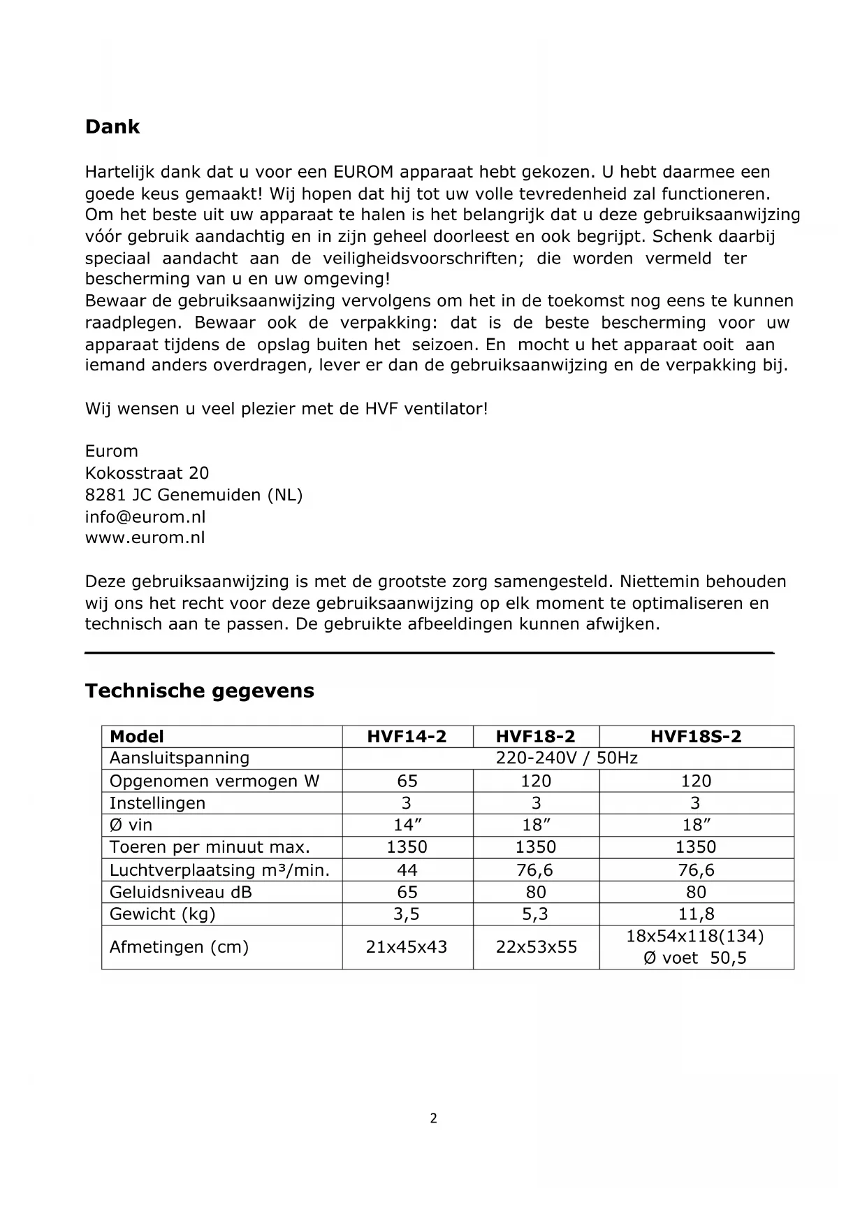 is opgebouwd! Werking (voor alle modellen) Stel, voordat u het apparaat in gebruik neemt, vast dat alle veiligheidsvoorschriften in acht zijn genomen. Bedieningsknop (achterkant) op 0 Steek de stekker in het stopcontact Kies de gewenste snelheid: 1 = laag (aangenaam windje) 2 = gemiddeld (krachtige wind) 3 = hoog (stormachtige wind) Terug naar 0 = uitschakelen Voor uitschakelen altijd eerst knop op 0, dan de stekker uit het stopcontact! Aanpassen blaasrichting Altijd ventilator uitschakelen en stekker uit stopcontact wanneer u de blaasrichting aanpast! Neem daartoe het veiligheidsrooster rond de ventilatorbladen in beide handen en draai het op de gewenste stand. Kantelen De HVF14-2 en HVF18-2 kunnen ± 150° kantelen, de HVF18S-2 ± 275°. Schoonmaak en onderhoud Schakel de ventilator uit en neem de stekker uit het stopcontact wanneer u hem wilt reinigen of onderhoud wilt uitvoeren. De ventilator vraag alleen wat algemeen, uitwendig onderhoud. Stof hem regelmatig af met een zachte doek of plumeau of zuig hem schoon met een zacht stofzuigerborsteltje. Zorg ervoor dat er geen water op andere delen dan rooster en bladen terechtkomt! Spoel of spuit de ventilator nooit af! Om aantasting, beschadiging of vervorming van het materiaal te voorkomen nooit schurende, agressieve of bijtende (schoonmaak)-middelen gebruiken. Wanneer u de ventilator aan het eind van het seizoen wilt opruimen, doe dat dan in de originele verpakking: die biedt de beste bescherming. Ruim hem weg op een veilige, droge, niet extreem warme of koude plaats.7 Verwijdering Binnen de EU betekent dit symbool dat dit product niet met het normale huishoudelijke afval mag worden afgevoerd. Afgedankte apparaten bevatten waardevolle materialen die hergebruikt kunnen en moeten worden, om het milieu en de gezondheid niet te schaden door ongereguleerde afvalinzameling. Breng afgedankte apparatuur daarom naar een daarvoor aangewezen inzamelpunt of wend u tot het bedrijf waar u het apparaat gekocht hebt. Zij kunnen er voor zorgen dat zoveel mogelijk onderdelen van het apparaat hergebruikt worden. CE - verklaring Hierbij verklaart Eurom – Kokosstraat 20 – 8281 JC – Genemuiden - NL dat de EUROM ventilatoren, types HVF14-2, HVF18-2, HVF18S-2 voldoen aan en in overeenstemming zijn met onderstaande normen: LVD 2014/35/EU EN 60335-2-80:2003+A1:2004+A2:2009 EN 60335-1:2012+A11:2014+A13:2017+A1:2019+A14:2019+A2:2019 EN 62233:2008 EMC 2014/30/EU EN 55014-1:2017 EN 55014-2:2015