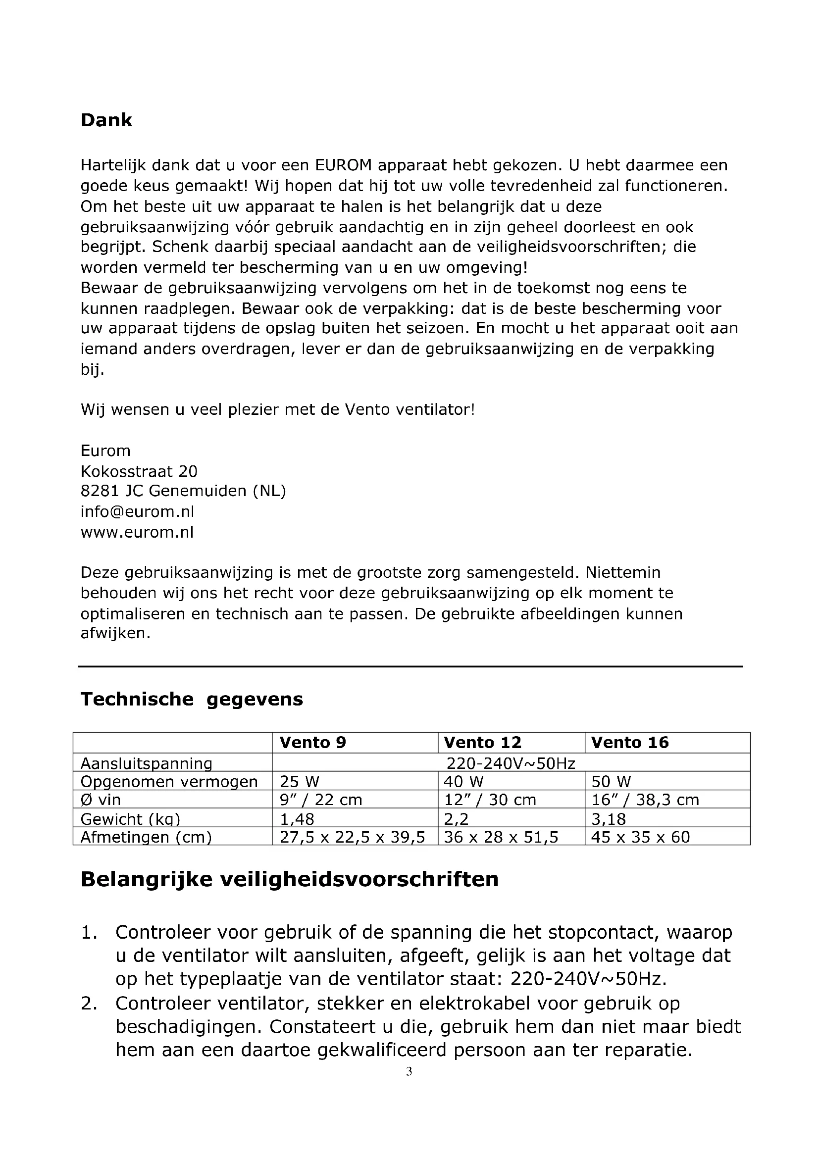 J. voet K. waaierbevestigingsknop L. as-pen Stekker uit het stopcontact! Verwijder de waaierbevestigingsknop (alleen Vento 12&16) en de roosterbevestiging van de motor-as. Plaats het achter-rooster op de daarvoor bestemde pennetjes. Schroef hem vast met de roosterbevestiging. Duw de waaier zo ver mogelijk op de motor-as. Vento 12 en 16: zorg dat de pennetjes in de sleufjes vallen en schroef de waaier vast met de waaierbevestigingsknop, door deze tegen de klok in vast te draaien. Controleer of de waaier vrij roteert door hem met uw hand rond te draaien. Open de rooster sluitring een eindje door de schroef wat losser te draaien. Plaats het voorrooster op het achter rooster, zodanig dat de rooster sluitring de randen van de roosters correct omvat; roosters goed tegen elkaar! Sluit tenslotte de rooster sluitring stevig met de schroef. Controleer of alles goed sluit.7 Leid de elektrokabel door het gat in de voet. Plaats de sokkel op de voet, zodanig dat de uitstulpingen van de sokkel in de uitsparingen van de voet vallen. Draai de sokkel nu vast op de voet; de elektrokabel valt nu in zijn geleidingen. Belangrijk Gebruik het apparaat niet in een badkamer of op een vochtige locatie. Zoek een stabiele, horizontale plaats voor het apparaat in de buurt van een stopcontact; Zorg ervoor dat het apparaat zich buiten het bereik van kinderen bevindt. Steek nooit voorwerpen door het rooster. Voordat u het apparaat verplaatst of er onderhoud aan uitvoert, altijd de stekker uit het stopcontact! Werking De ventilatoren kunnen op verschillende snelheden draaien: de Vento 9 op twee standen, de Vento 12 & 16 op drie standen. Alle types zijn voorzien van een zwenkfunctie (75°). Om de ventilator wat meer naar boven of beneden te laten blazen kunt u het motorblokje met de ventilator wat naar boven of beneden bijstellen t.o.v. de voet. Voor u dat doet eerst de ventilator uitschakelen en de stekker uit het stopcontact nemen! Wanneer: - de ventilator volledig in elkaar is gezet - alle verbindingen stevig vastgedraaid zitten - alle veiligheidsvoorschriften in acht genomen zijn kunt u de ventilator in gebruik nemen: Vento 9, Vento 12 & Vento 16: I - Steek de stekker in het stopcontact II - Kies vermogen: 0=uit, 1=standaard, 2=sterk (Vento 12&16: 3=extra sterk). De ventilator zal nu zijn werking starten. III - Druk indien gewenst de zwenkknop bovenop de motor in: de ventilator zal nu in een hoek van 75° gaan zwenken. Door deze knop weer uit te trekken schakelt u de zwenkfunctie (of: oscillatie) weer uit. Pas op dat er geen haren, kleding, gordijnen etc. in een zwenkende ventilator kunnen worden gezogen! Om de ventilator uit te schakelen drukt u op de 0-knop. Wanneer u de werking langer dan enkele minuten wilt onderbreken dient u ook de stekker uit het stopcontact te nemen. Schoonmaak en onderhoud Schakel de ventilator uit en neem de stekker uit het stopcontact wanneer u hem wilt reinigen of onderhoud wilt uitvoeren. De ventilator vraag alleen wat algemeen, uitwendig onderhoud. Stof hem regelmatig af met een zachte doek of plumeau of zuig hem schoon met een zacht stofzuigerborsteltje. Is hij erg vuil, open dan het voorste rooster en neem roosters en bladen af met een licht-bevochtigde doek met8 een zacht huishoudelijk reinigingsmiddel. Droog alles goed na, laat de ventilator goed drogen en zet hem weer volledig in elkaar voor u hem weer in gebruik neemt. Zorg ervoor dat er geen water op andere delen dan rooster en bladen terechtkomt! Spoel of spuit de ventilator nooit af! Om verkleuring of vervormingen van het materiaal te voorkomen nooit agressieve of bijtende (schoonmaak)middelen gebruiken. Breng aan het eind van het seizoen wat smeermiddel aan op de motor- as, om roest te voorkomen. Wanneer u de ventilator aan het eind van het seizoen wilt opruimen, doe dat dan in de originele verpakking: die biedt de beste bescherming. Ruim hem weg op een veilige, droge, niet extreem warme of koude plaats. Problemen en oplossingen Het ventilatorblad draait niet terwijl de ventilator aangezet is Zit de stekker wel goed in het stopcontact? Staat er wel stroom op het stopcontact? Wordt het blad niet ergens geblokkeerd, bijv. door een beschadiging, een vervorming van het beschermrooster of een vreemd voorwerp? Er doet zich een abnormaal geluid voor bij het opstarten Controleer of de waaier zo ver mogelijk over de motor-as is geplaatst. Controleer of het vinnenblad misschien een vervorming van het beschermrooster raakt. Waarschuwing: Reparaties dienen door daarvoor opgeleide monteurs te worden uitgevoerd. Dat geldt ook voor vervanging of reparatie van de elektrokabel en de stekker. Vraag bij reparatie altijd om originele onderdelen. In het apparaat aangebrachte wijzigingen en ondeskundig uitgevoerde reparaties doen de garantie en de aansprakelijkheid van leverancier, importeur en fabrikant vervallen. Verwijdering Binnen de EU betekent dit symbool dat dit product niet met het normale huishoudelijke afval mag worden afgevoerd. Afgedankte apparaten bevatten waardevolle materialen die hergebruikt kunnen en moeten worden, om het milieu en de gezondheid niet te schaden door ongereguleerde afvalinzameling. Breng afgedankte apparatuur daarom naar een daarvoor aangewezen inzamelpunt of wend u tot het bedrijf waar u het apparaat gekocht hebt. Zij kunnen er voor zorgen dat zoveel mogelijk onderdelen van het apparaat hergebruikt worden. CE-verklaring Zie pagina 34.9 Thank you Thank you very much for choosing for a EUROM device. You have made a good choice! We hope you will be satisfied about its functioning. To get maximum profit from your product, it is important to read this manual attentive and totally before use, and to understand what is written. Read especially the safety instructions: they are there to protect you and your environment. Keep the manual in a safe place for future reference. Store also the package: that is the best protection for your product in times of no-use. And if you at any time pass the appliance on, pass on the manual